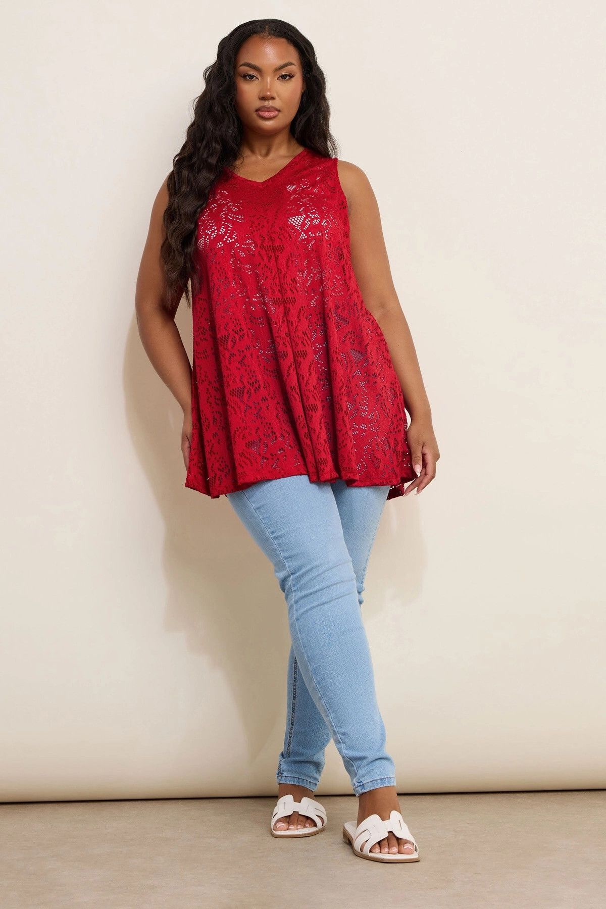 - פרטי הדגם: צווארון V, חולצה ללא שרוולים, חזית עם קפלים, פרטי תחרה ללא בטנה, גזרת סווינג