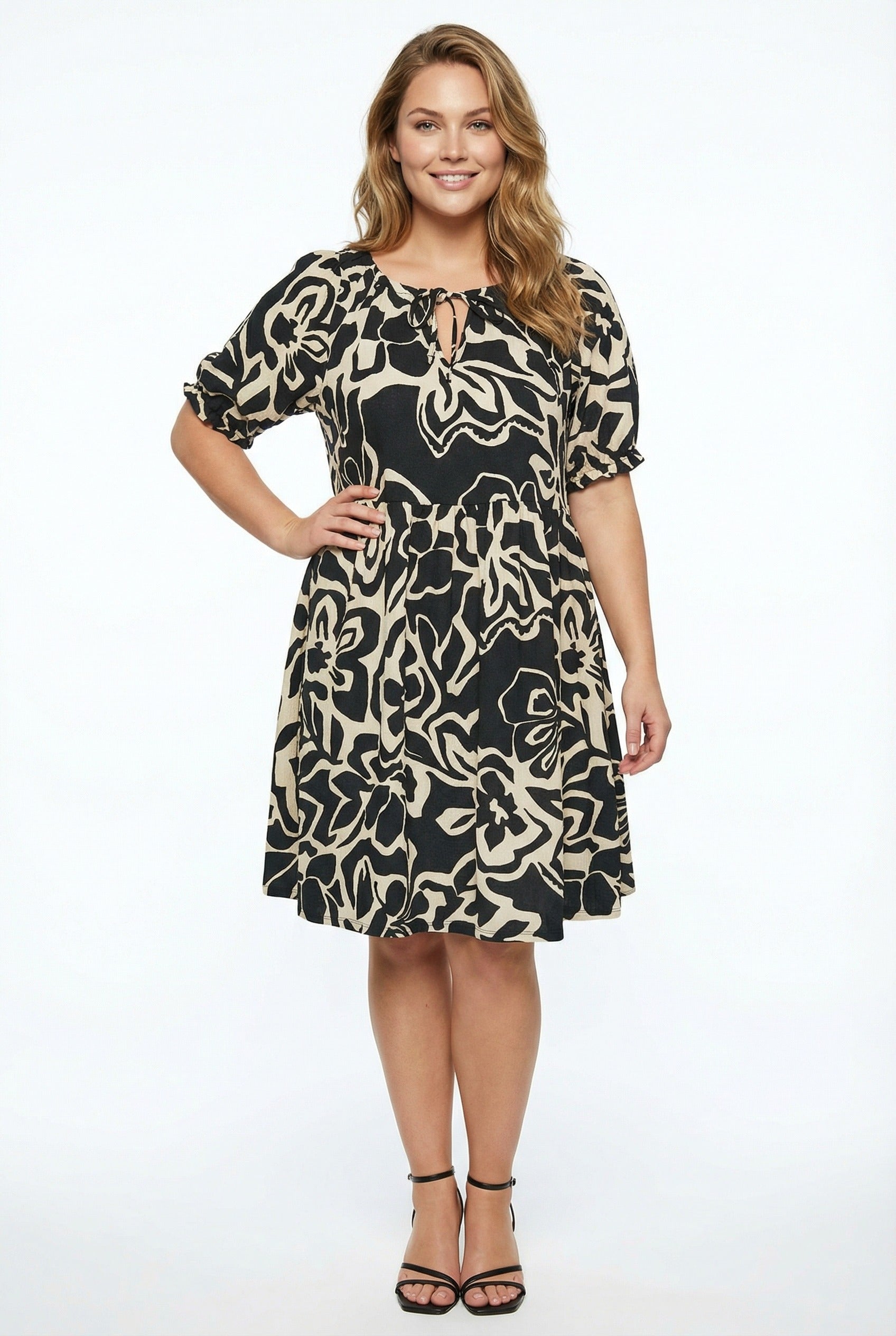 פרטי הדגם: עם דוגמת פרחים מופשטת, צווארון עם קשירה, שרוולים קצרים, אורך מיני