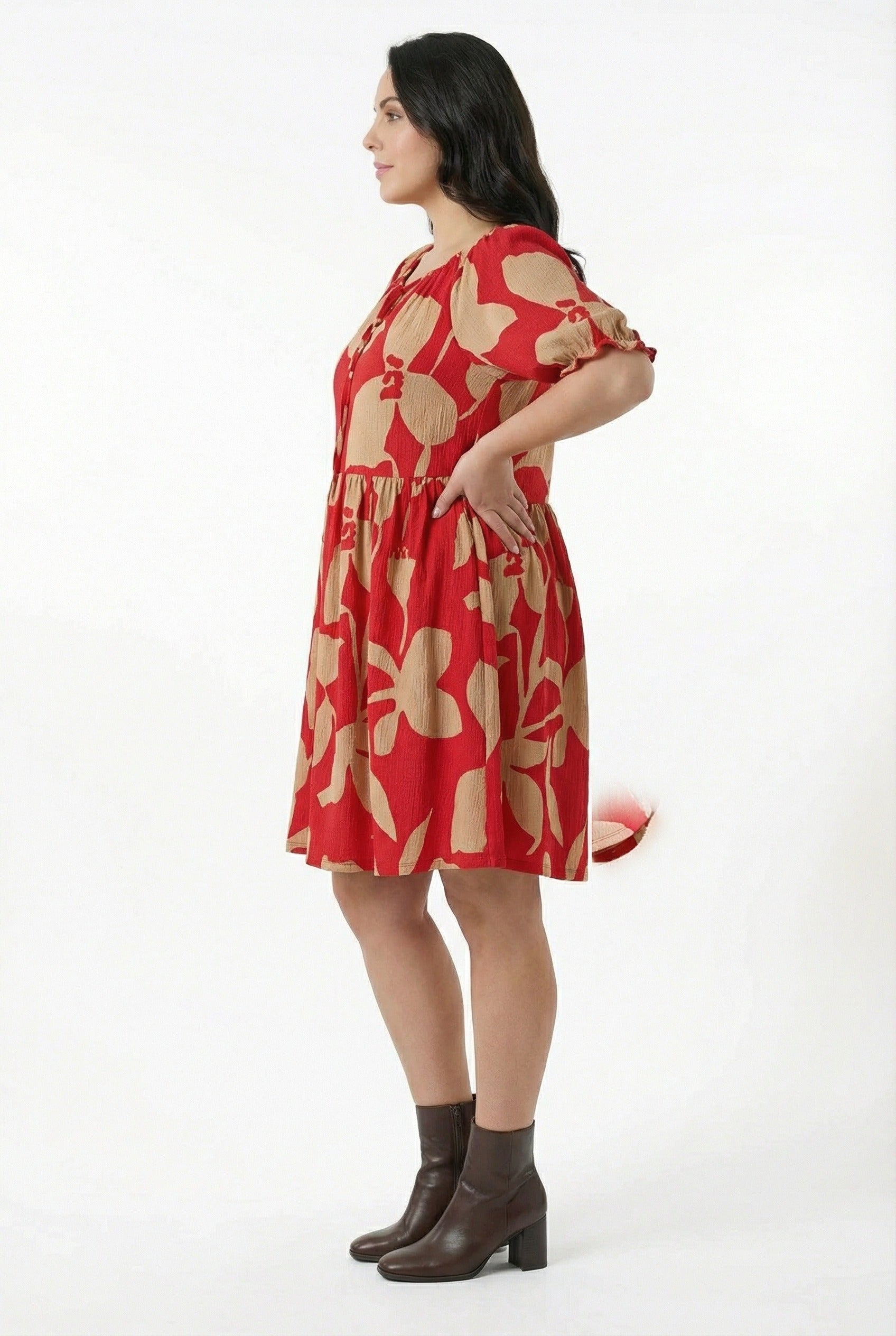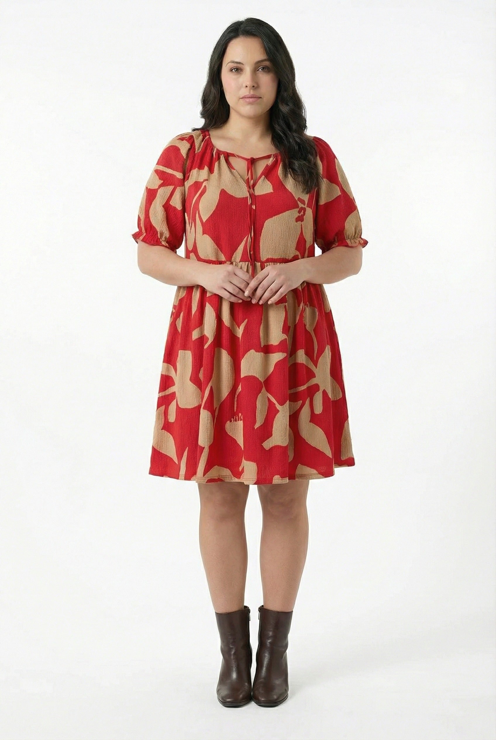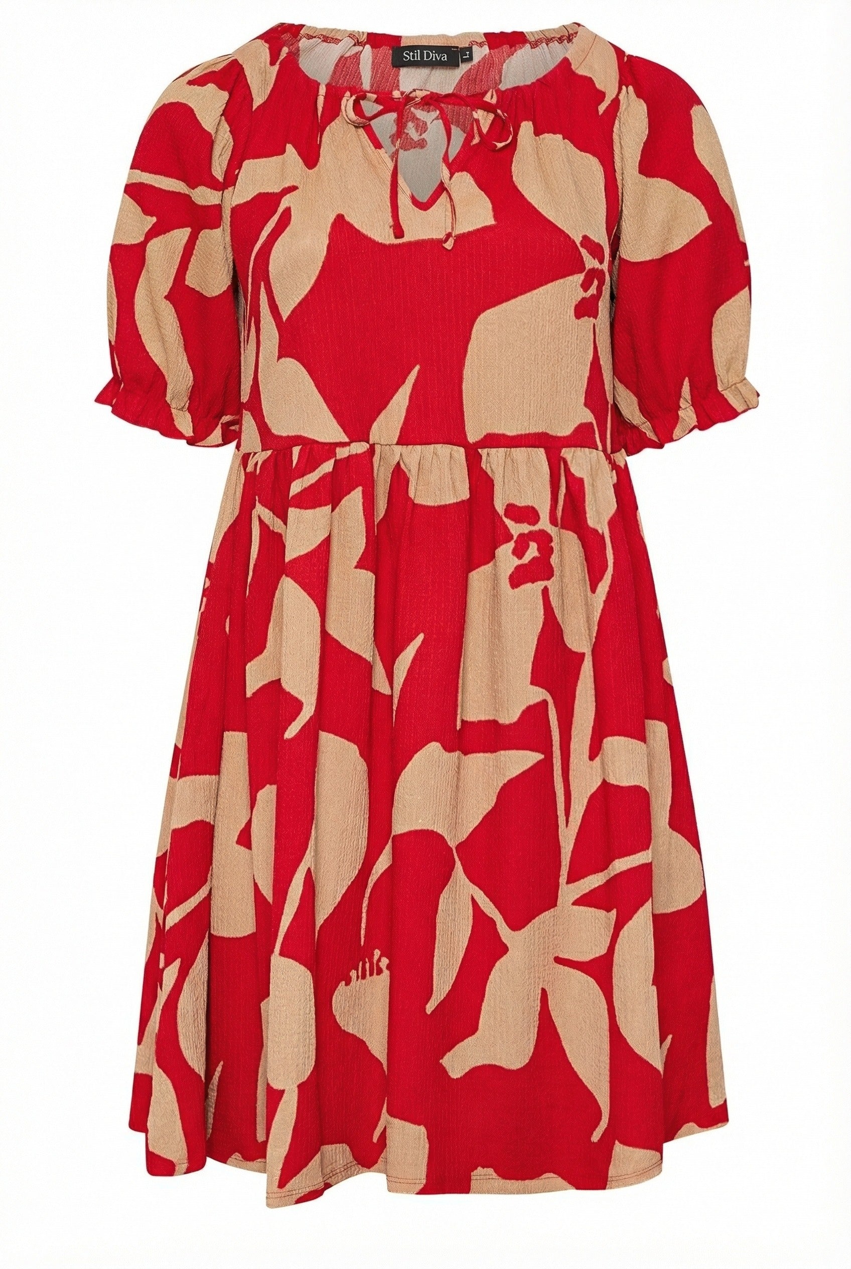 • פרטי הדגם: צווארון קשירה, שרוול קצר, דוגמת פרחים מופשטת, מיני
