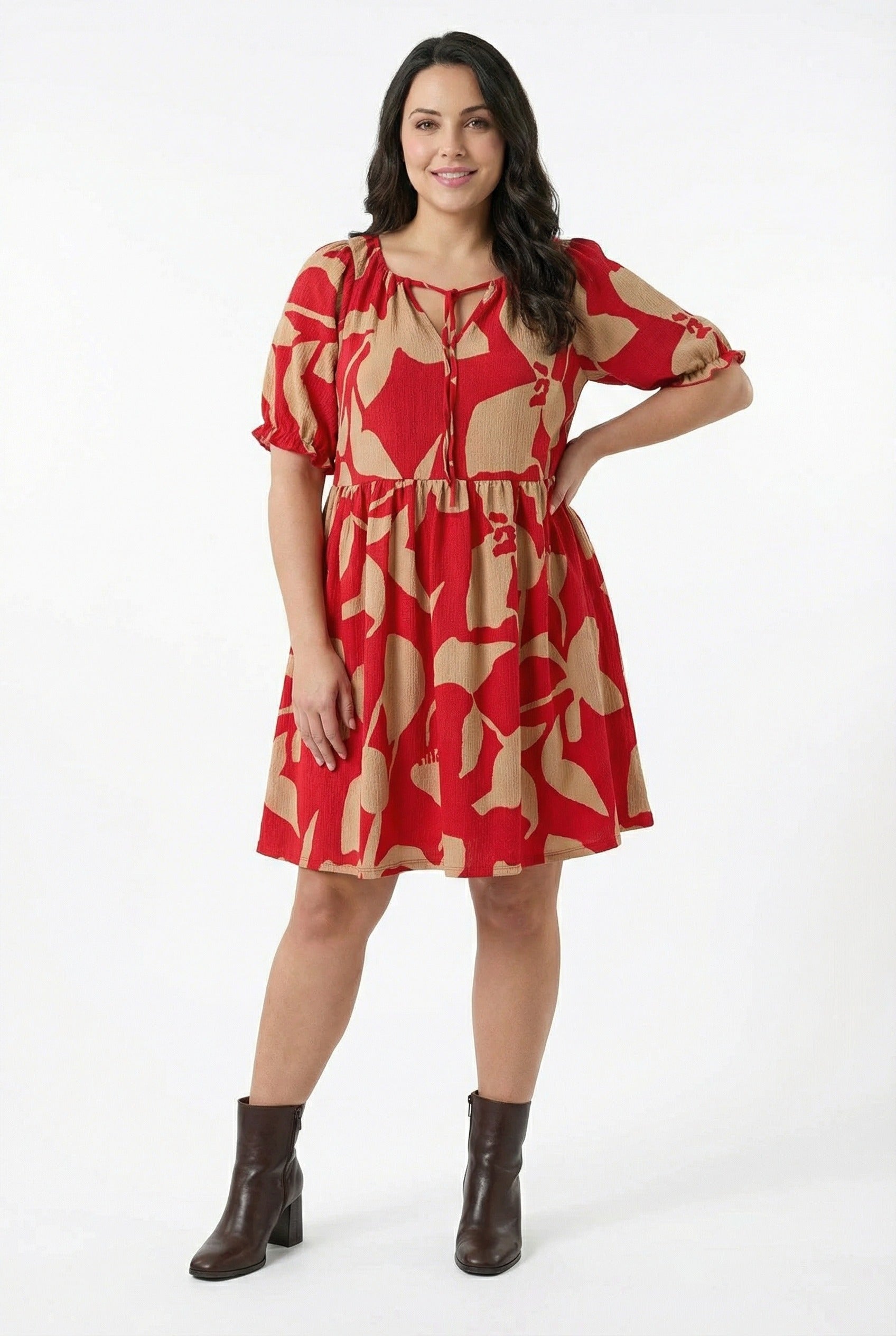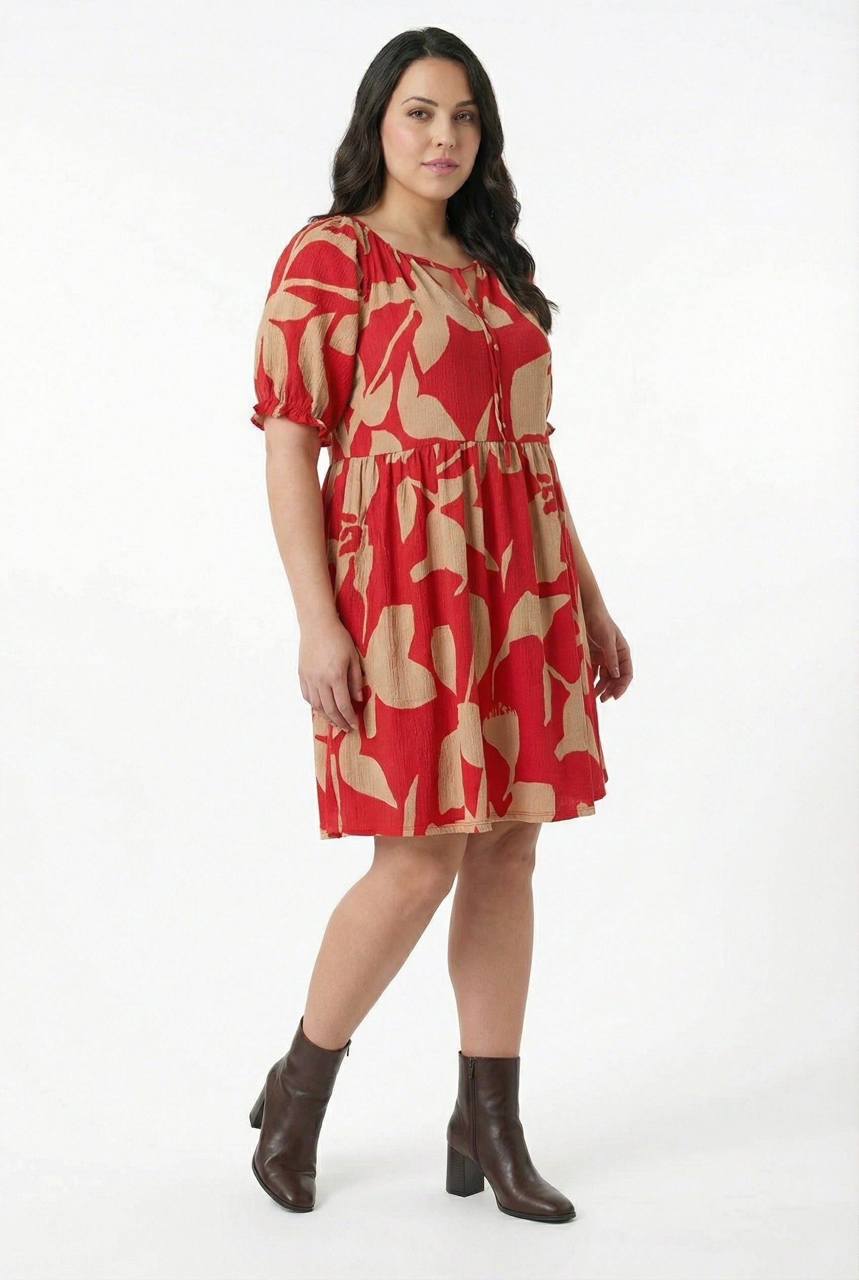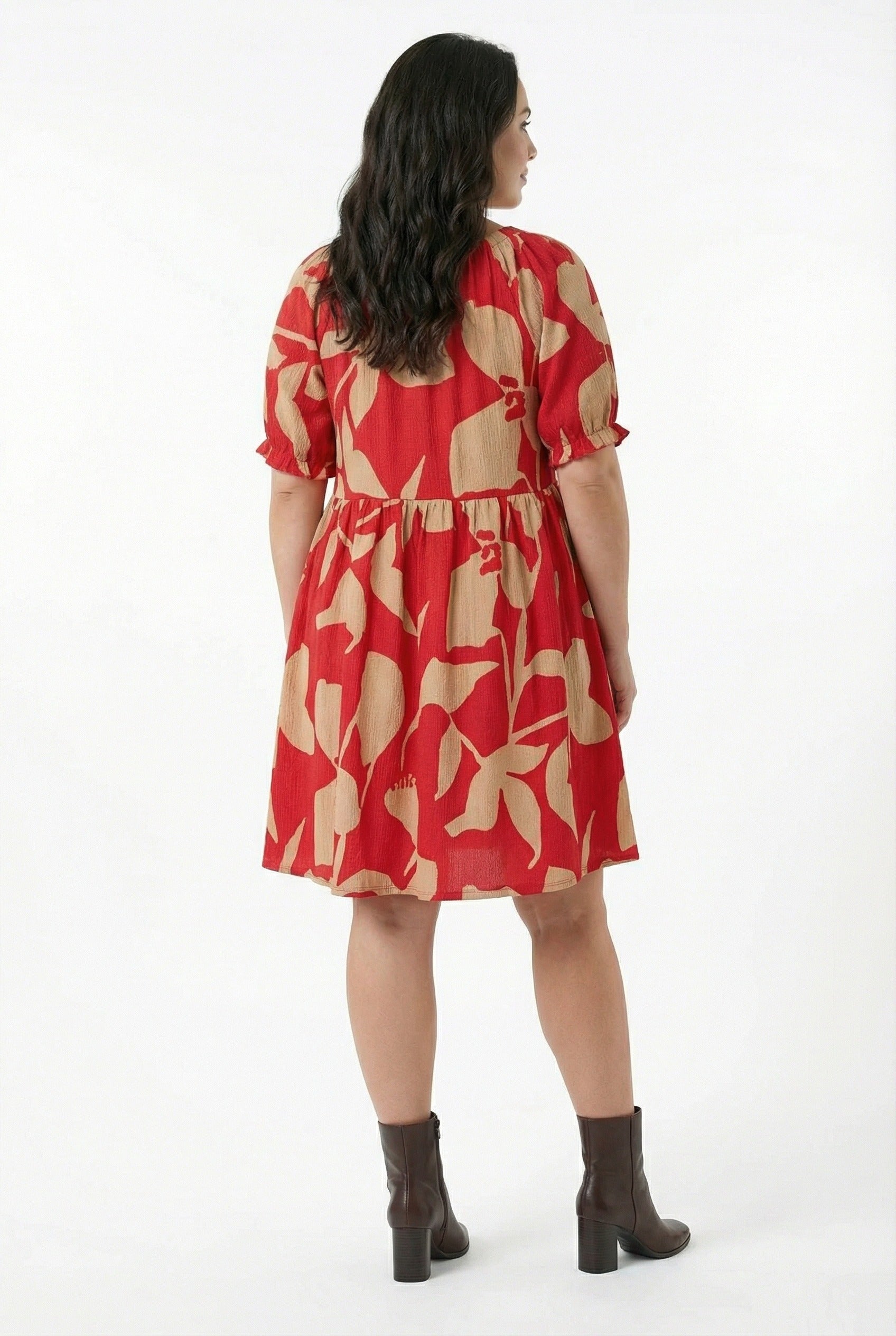 • פרטי הדגם: צווארון קשירה, שרוול קצר, דוגמת פרחים מופשטת, מיני