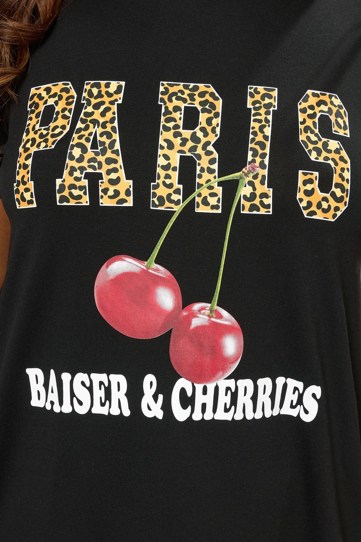 פרטי הדגם: דוגמת נמר עם עיצוב 'Paris', הדפס דובדבנים וסלוגן 'baiser & cherries', שרוולים קצרים, צווארון עגול