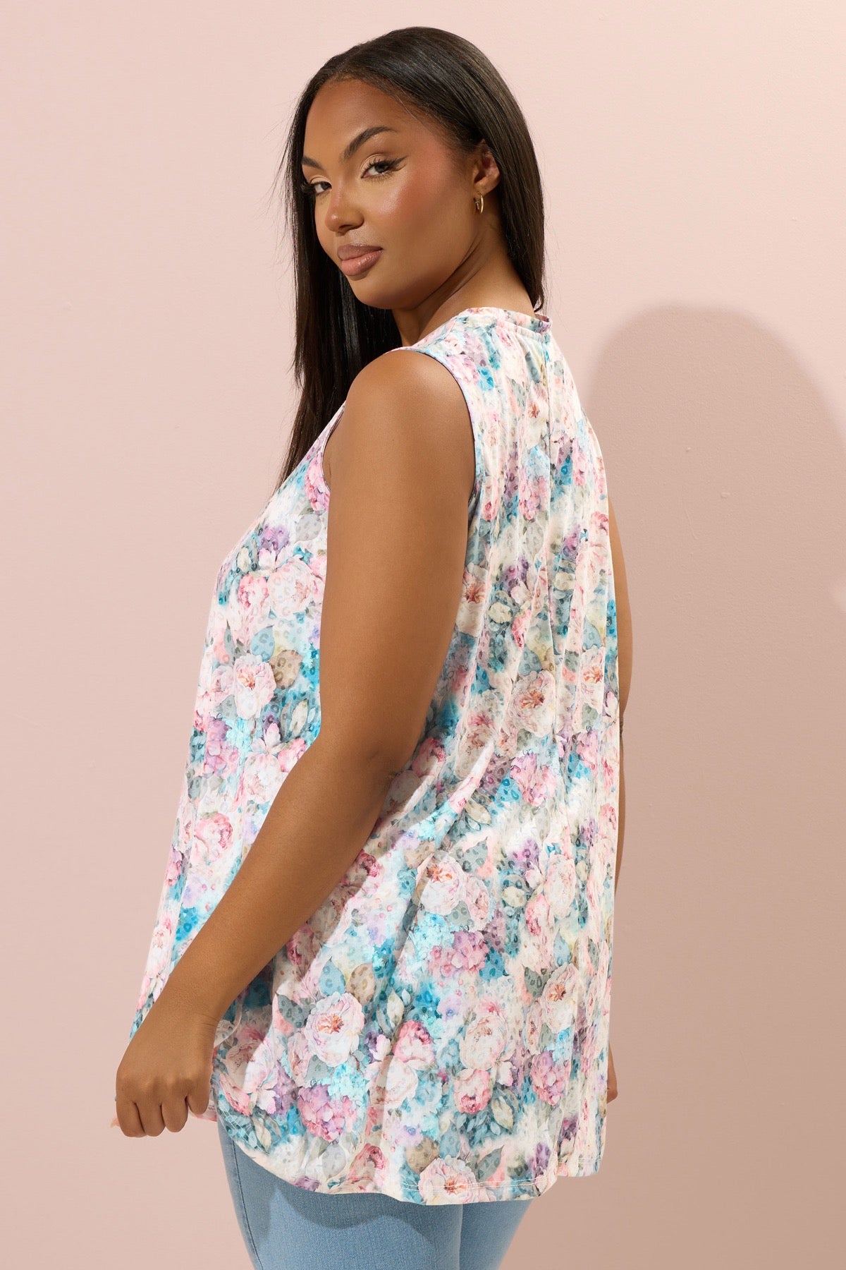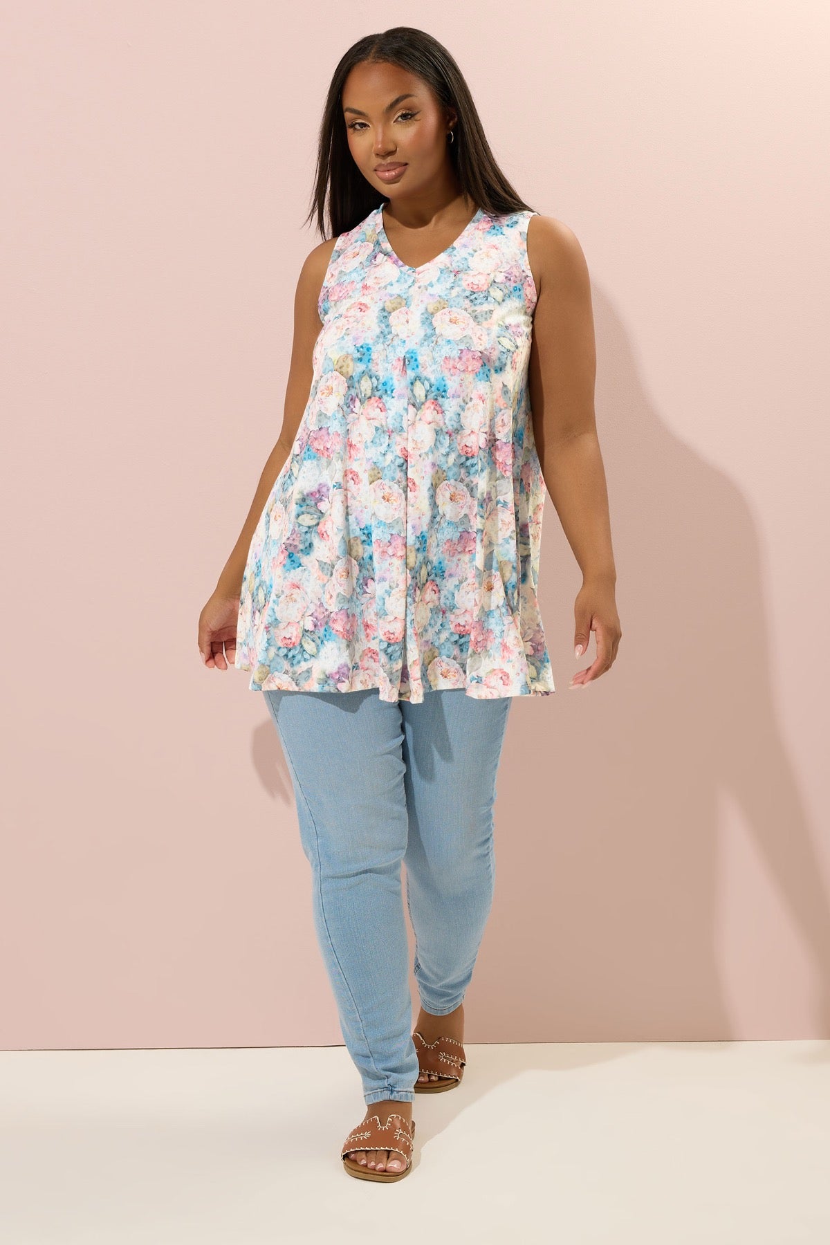 חולצה במידות גדולות בלי שרוולים צווארון V דוגמת פרחים חצאית מתרחבת 304188