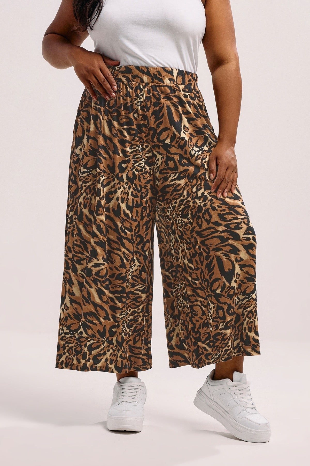מכנסיים במידות גדולות גומי במותן קרסול רחב דוגמת נמר שתי כיסים קדמיים 304271