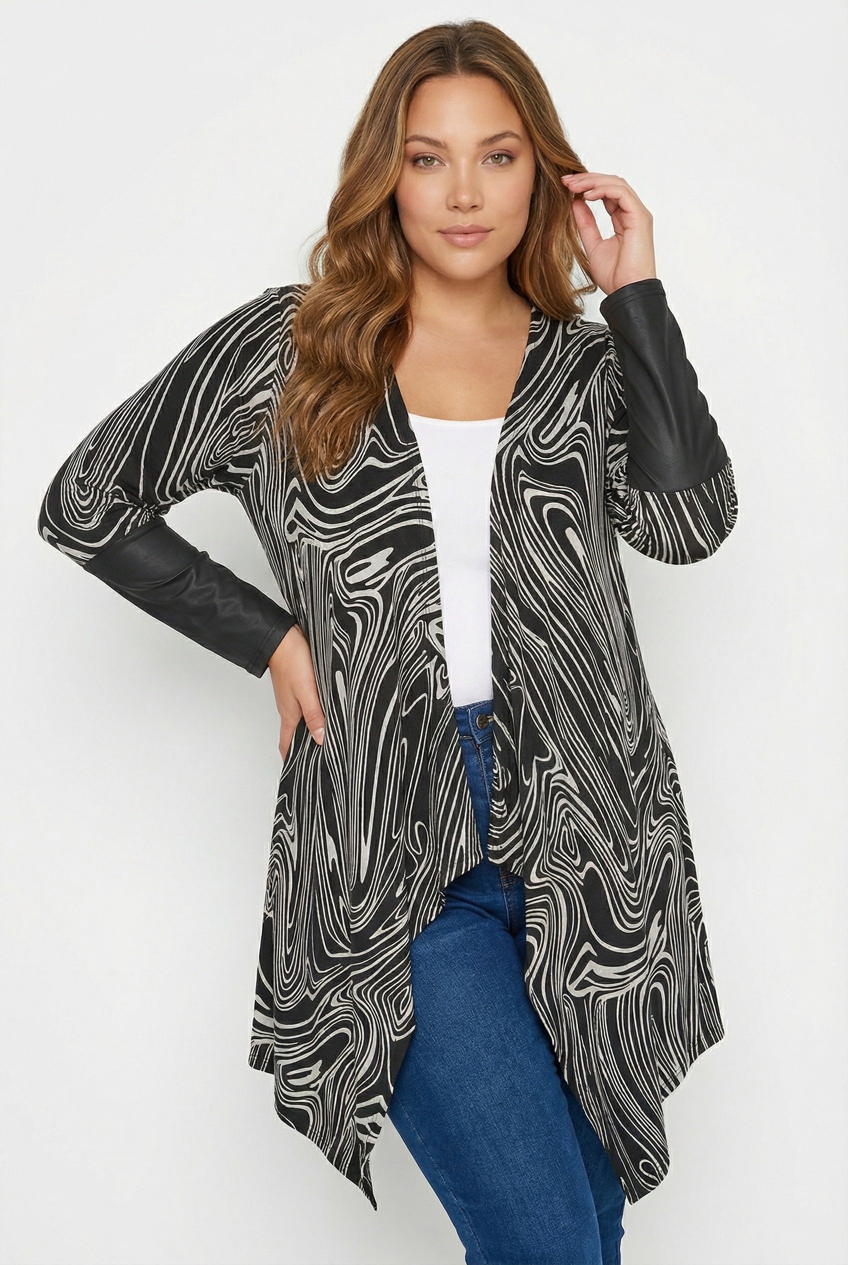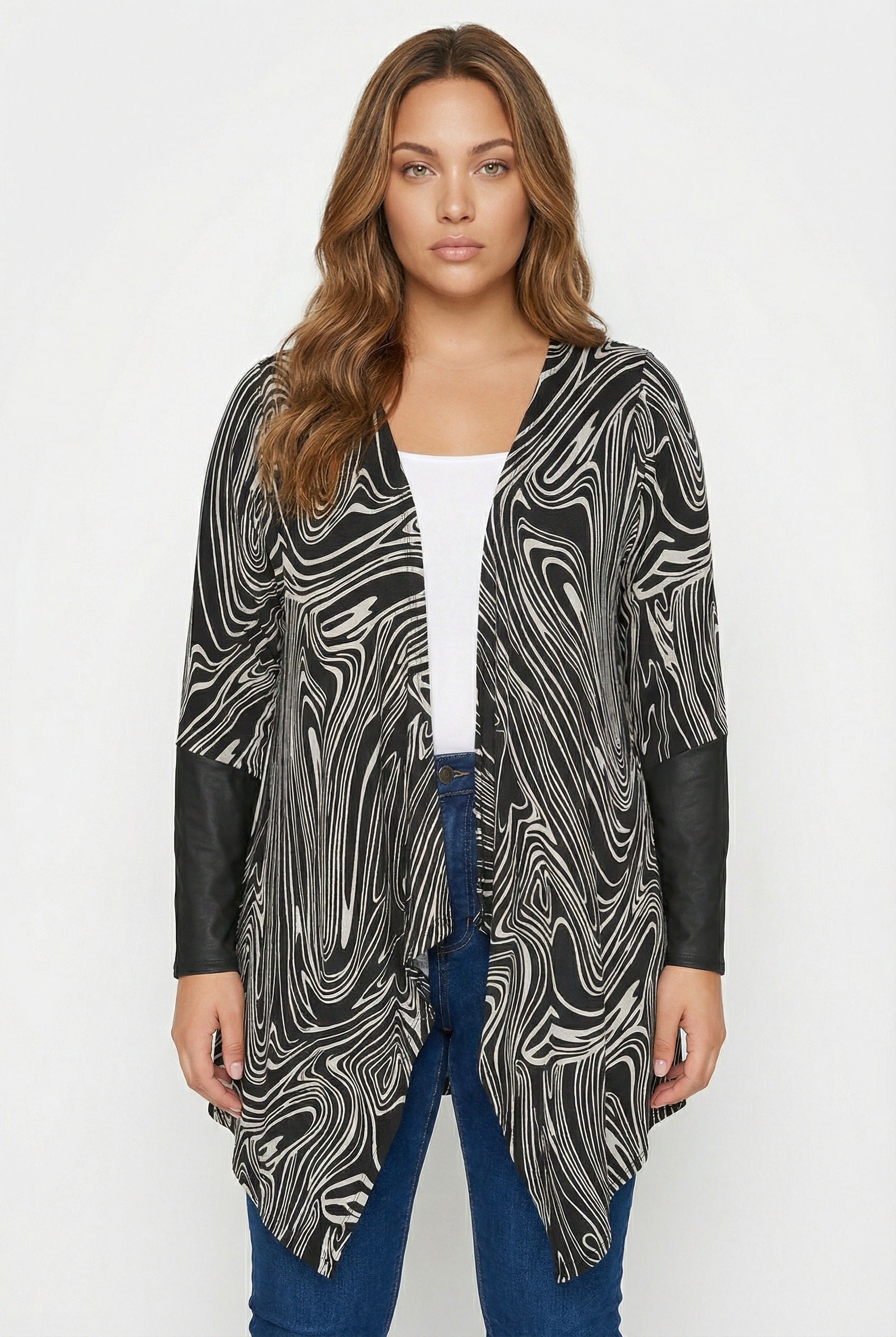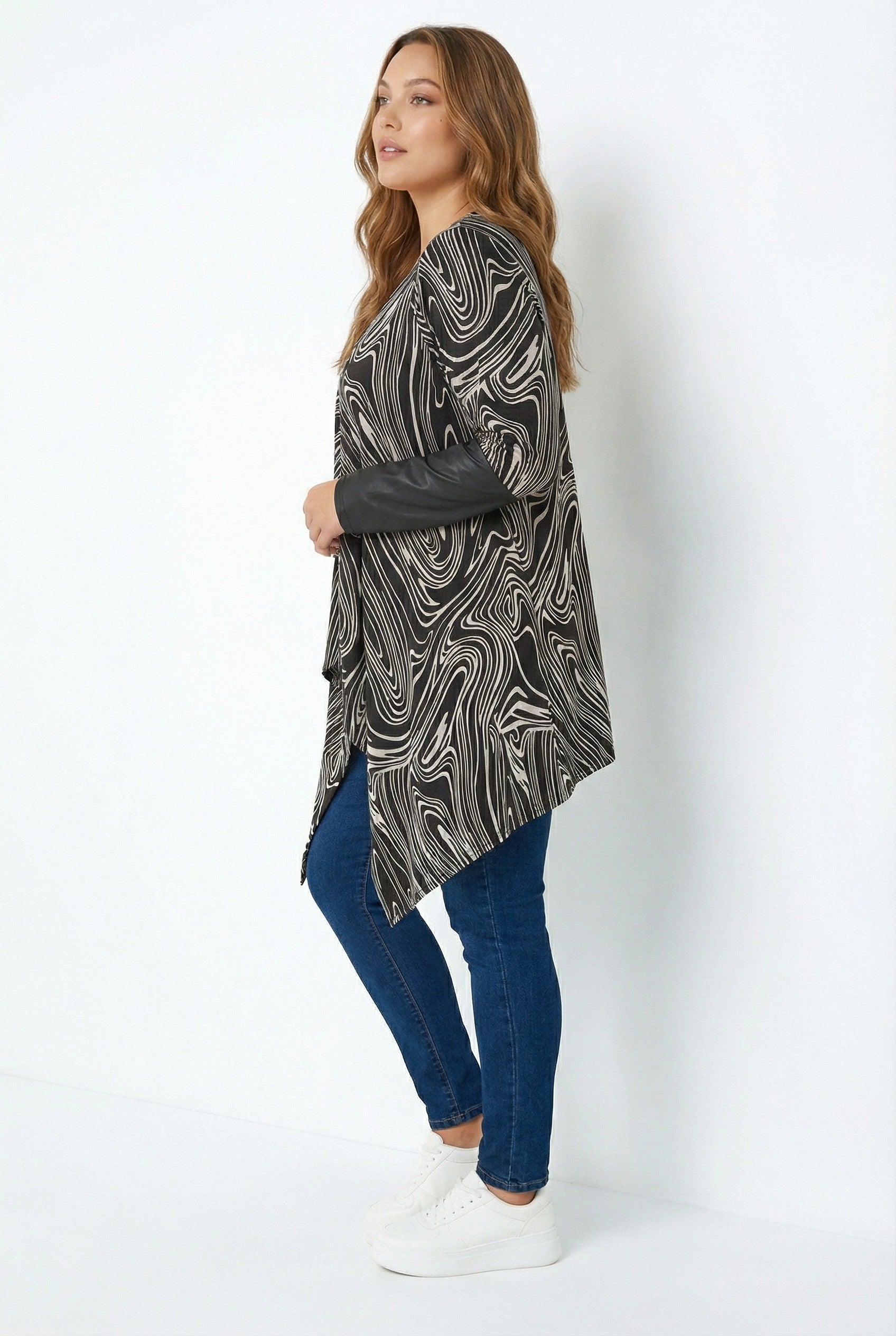 - פרטי הדגם: צווארון מפל (גזרה אסימטרית), פתוח מקדימה, דוגמת אבסטרקטי, שרוולים עם פרטי עור סינתטי.