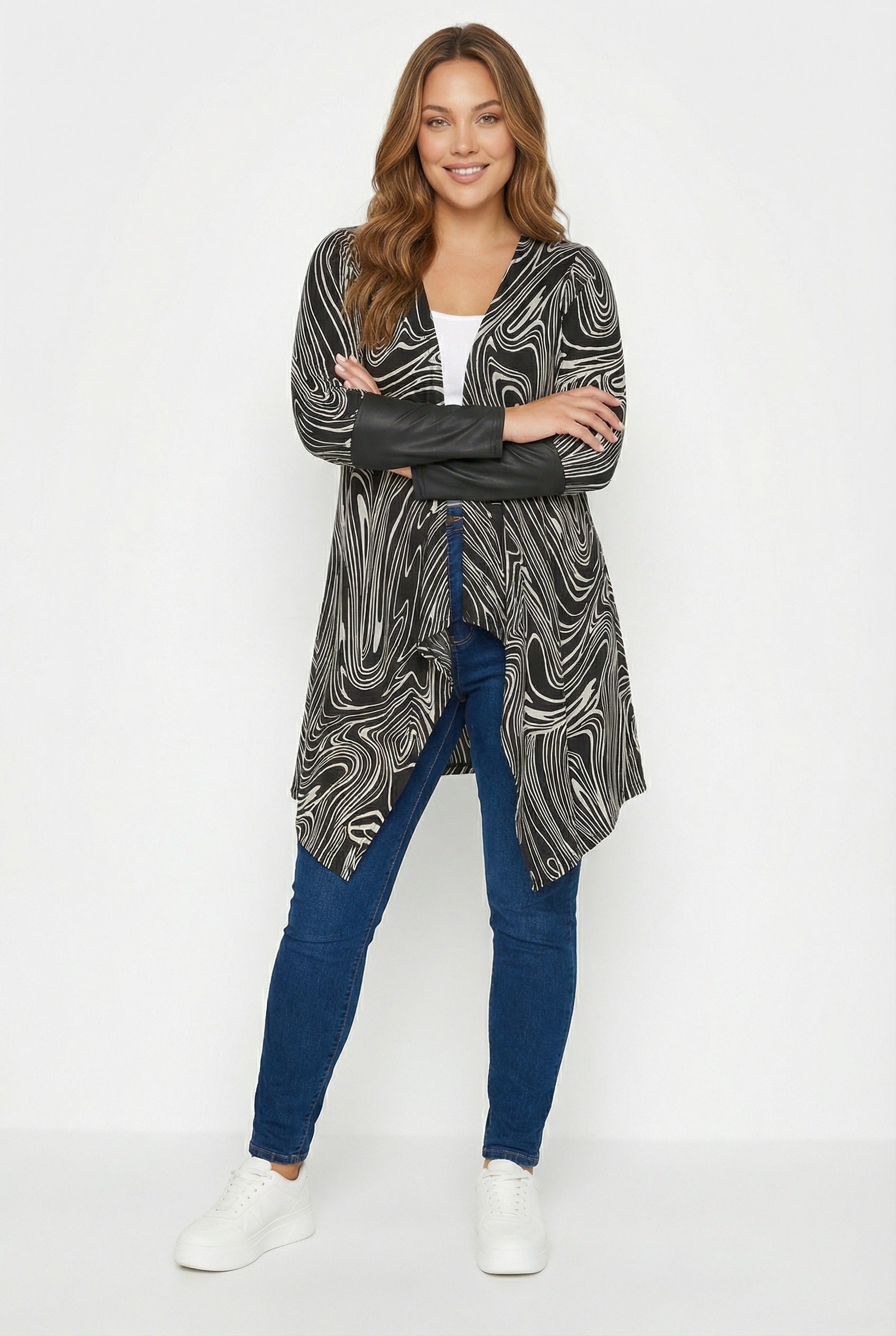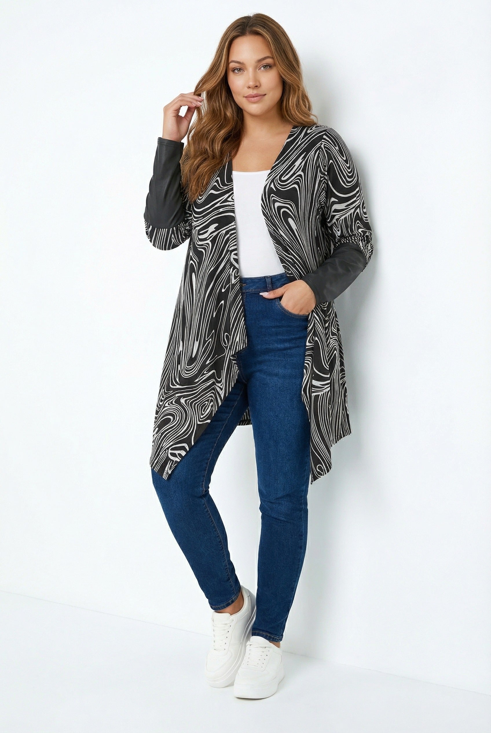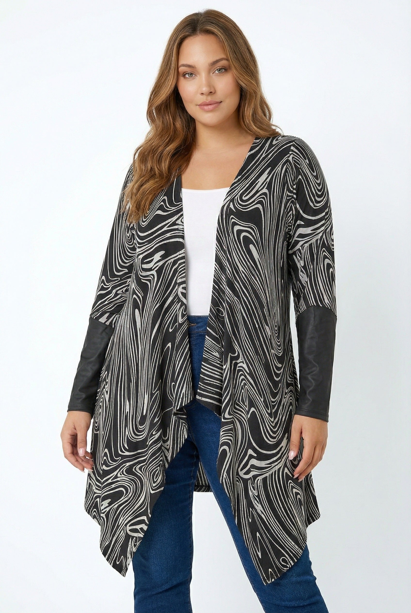 - פרטי הדגם: צווארון מפל (גזרה אסימטרית), פתוח מקדימה, דוגמת אבסטרקטי, שרוולים עם פרטי עור סינתטי.