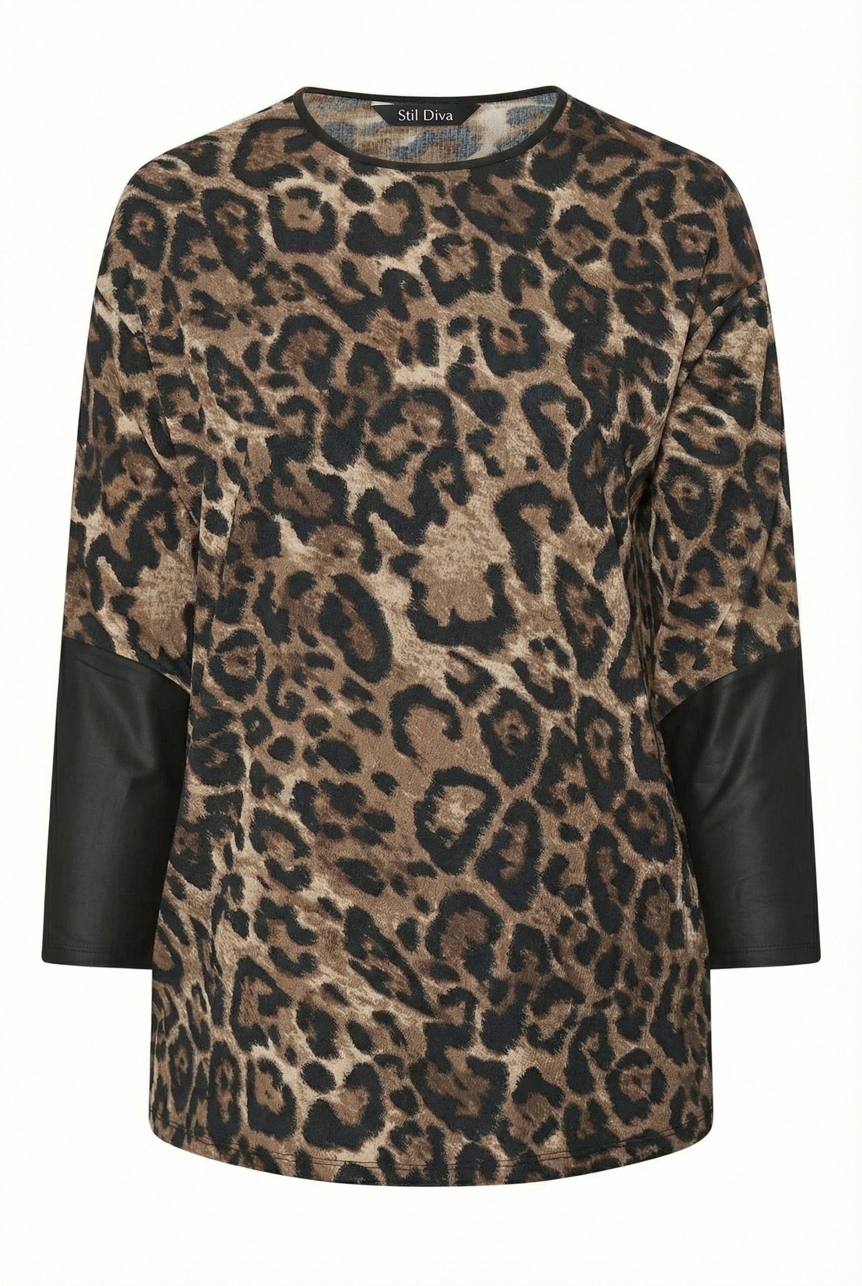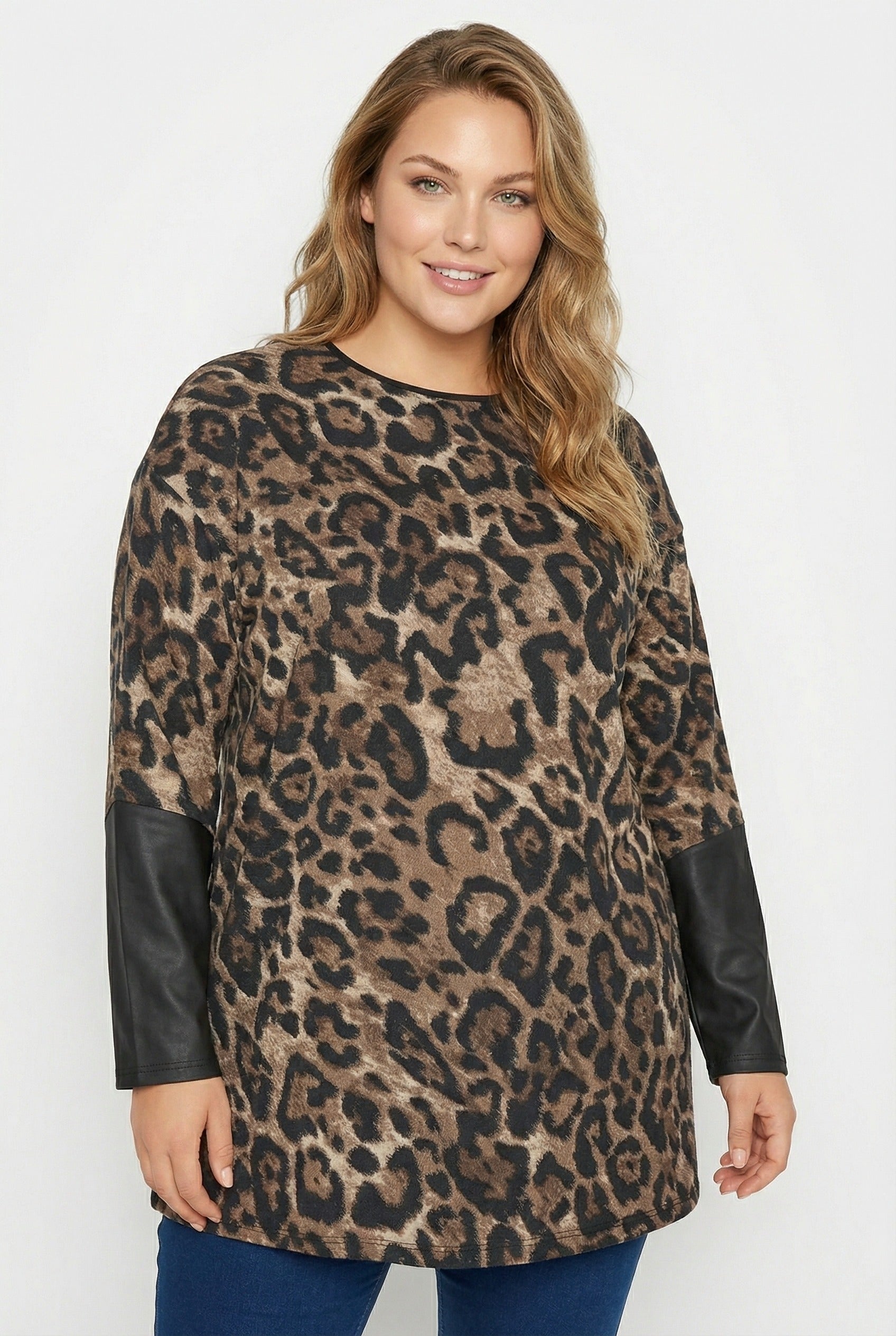 - פרטי הדגם: צווארון עגול, שרוול ארוך, גוף בדוגמת נמר, שרוולים מעור סינתטי.