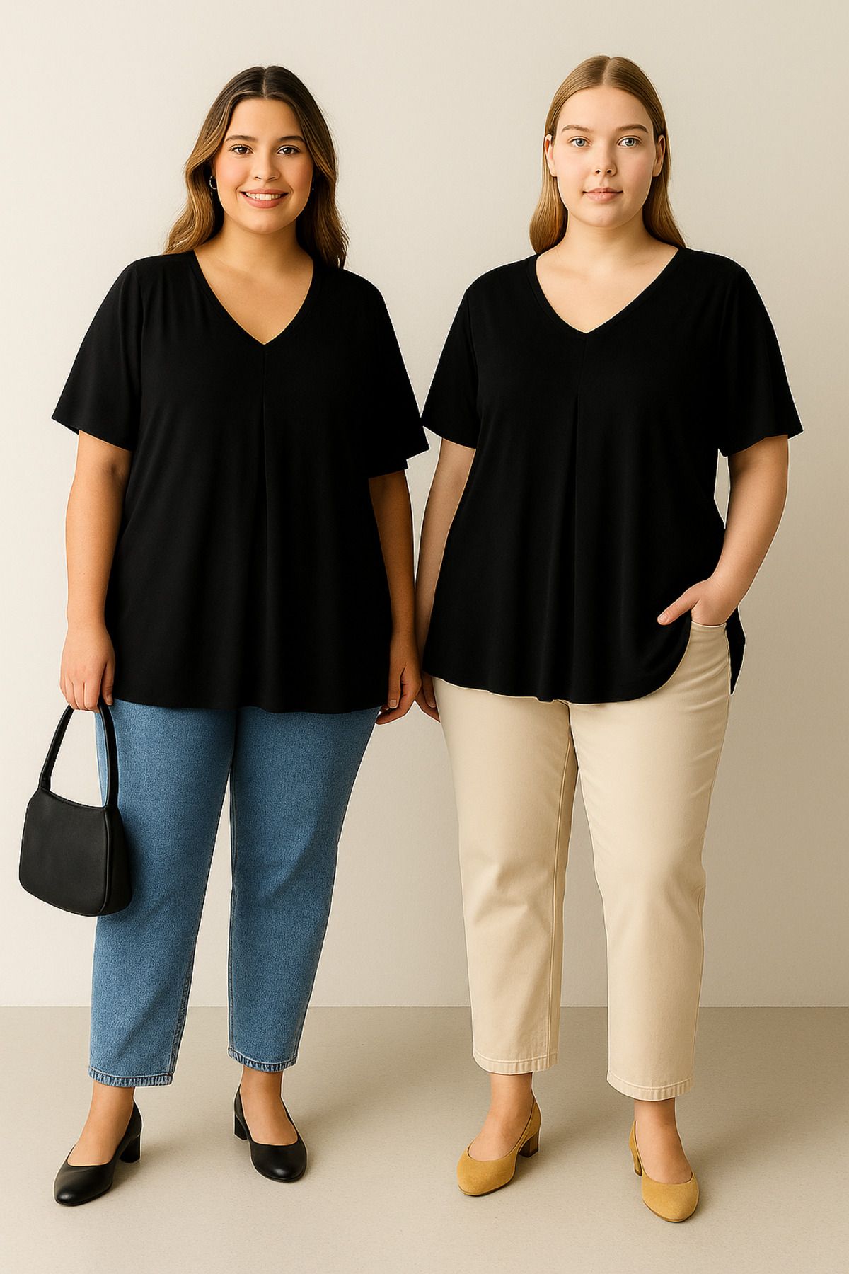 חולצה במידות גדולות, חבילת זוג, עם צווארון V, ללא דוגמה, חיתוך אסימטרי, עם אלסטן 320315x2
