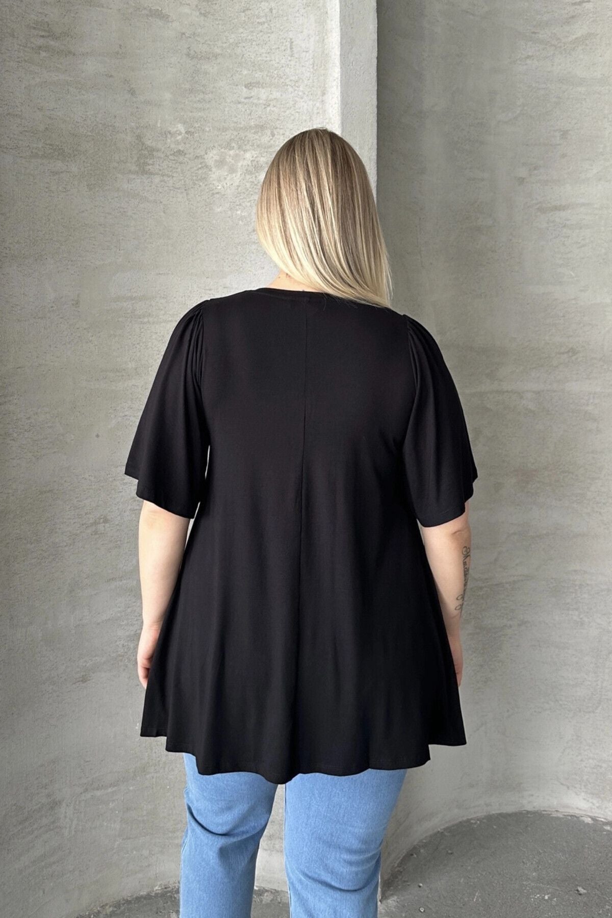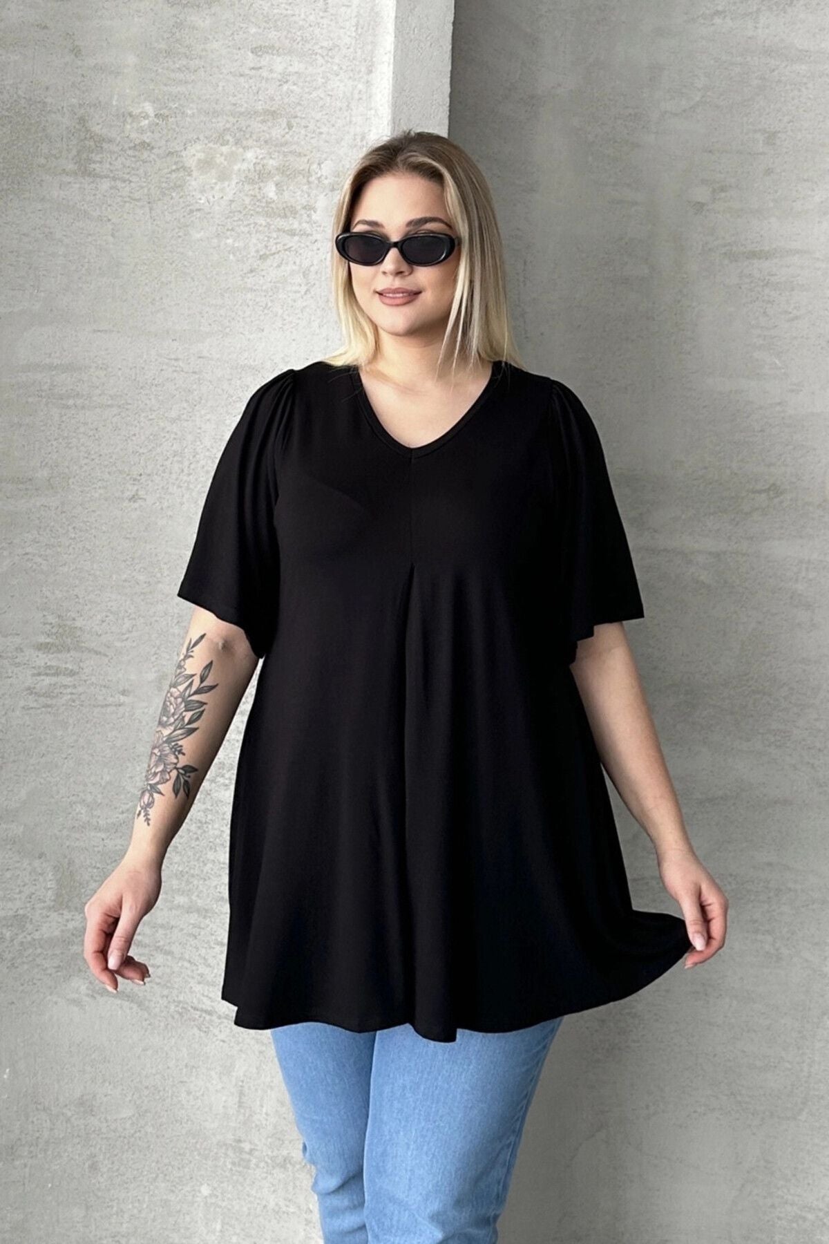 • פרטי הדגם: שרוול קצר בסגנון מלאך, צווארון V, קפלים בחזית, דגם רחב