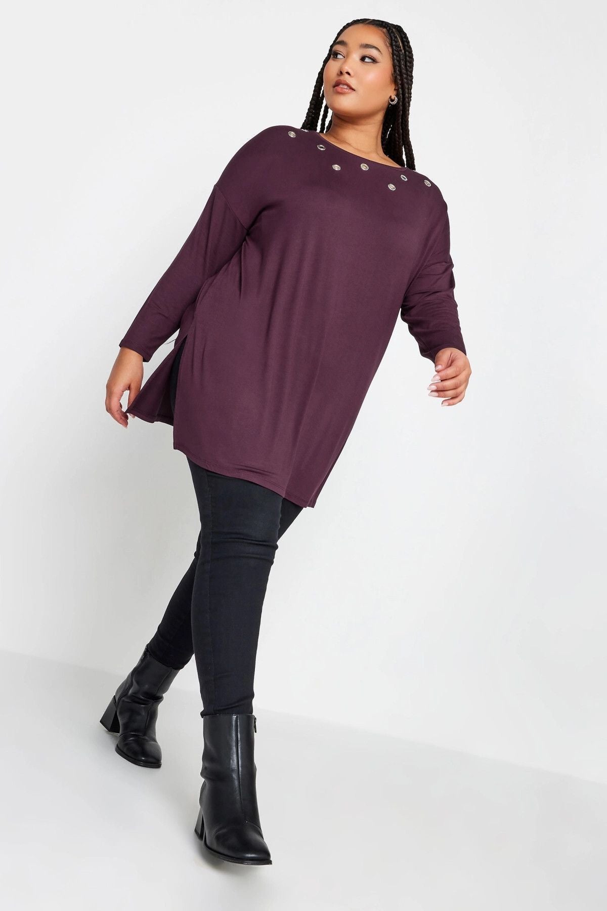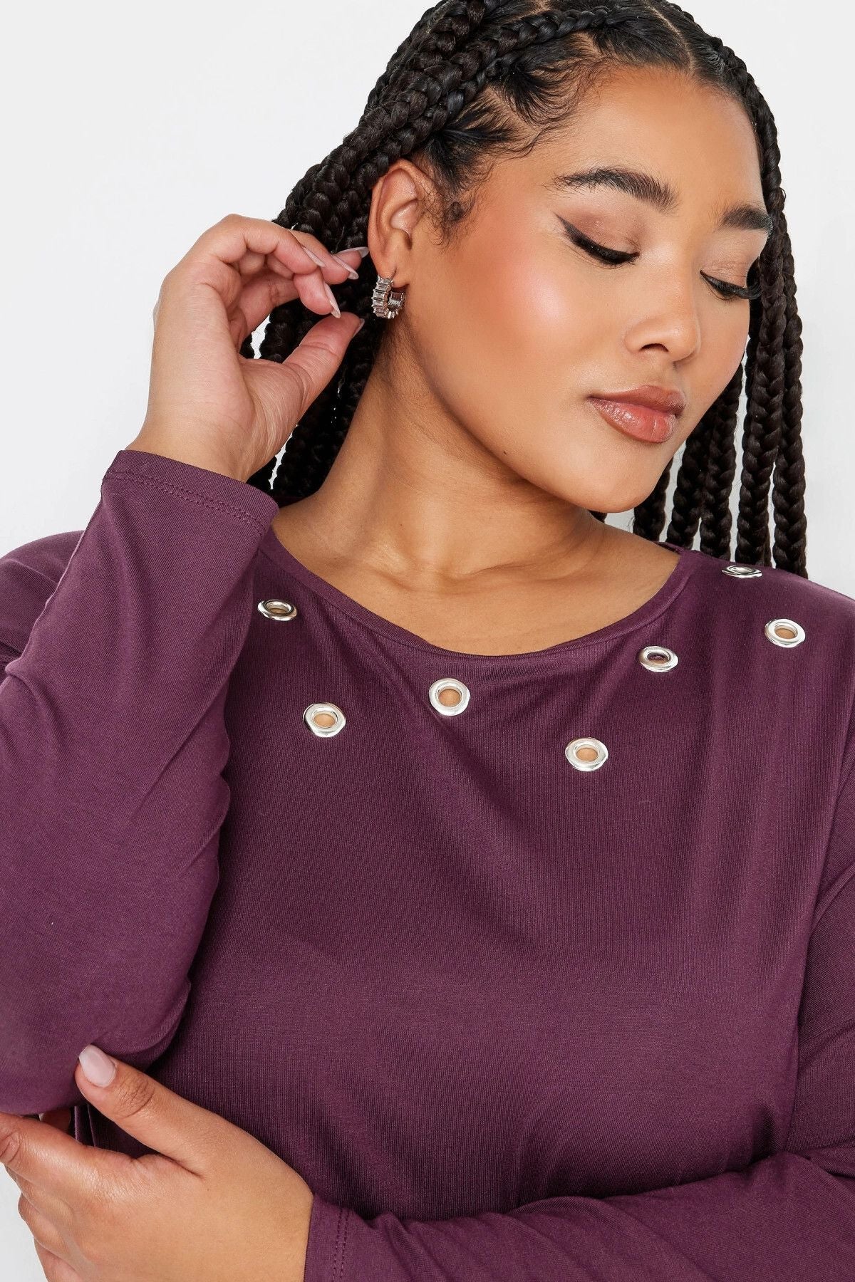 חולצה במידות גדולות פרטי עינית מתכת צווארון עגול שרוול ארוך אוברסייז 321291