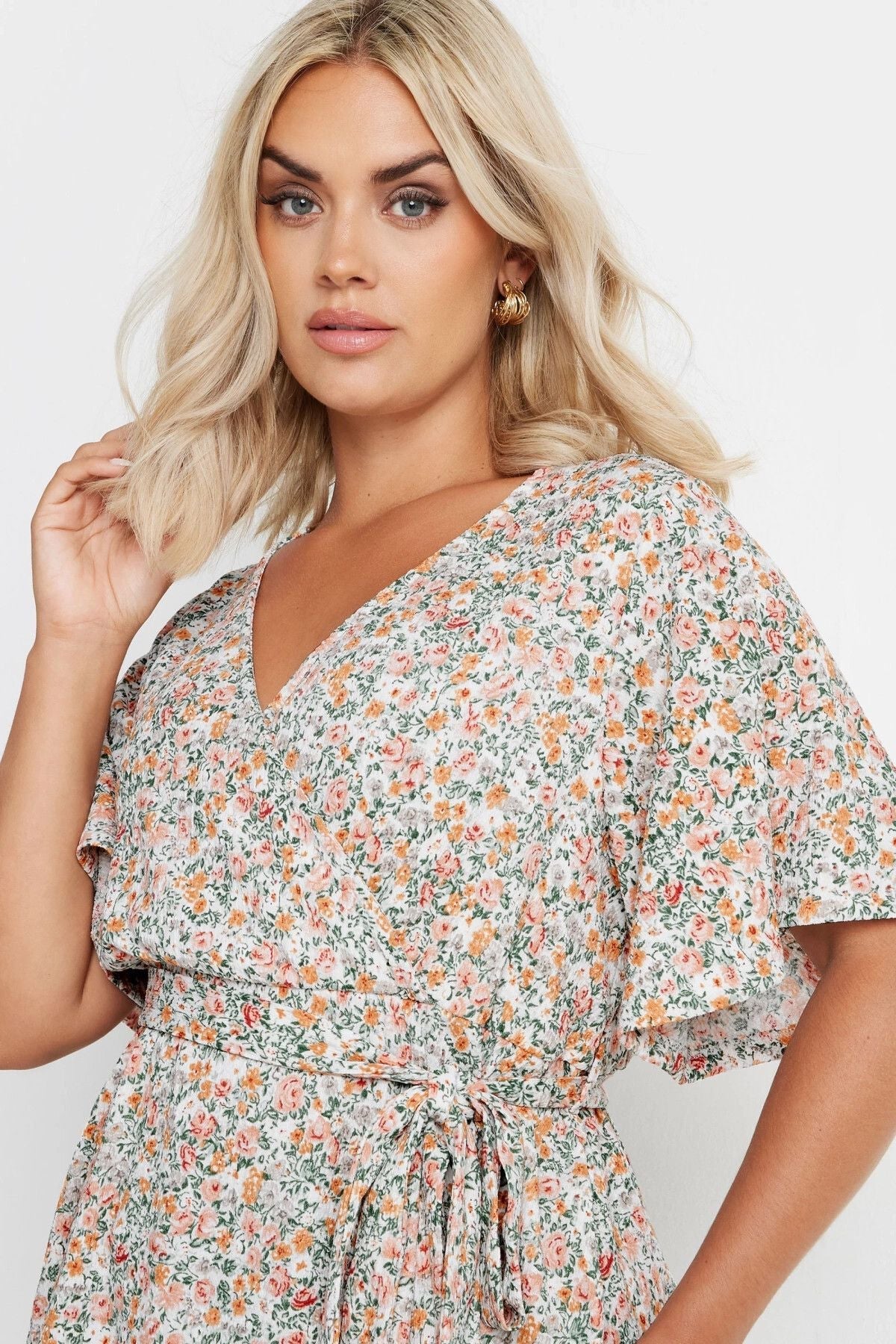 - פרטי הדגם: צווארון מעטפת שרוול מלאכית קצר חגורה במותן מכפלת פפלום עם הדפס פרחים