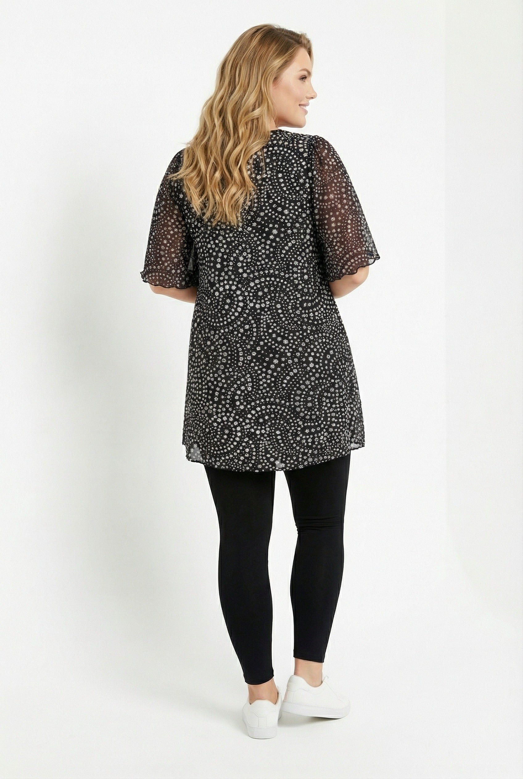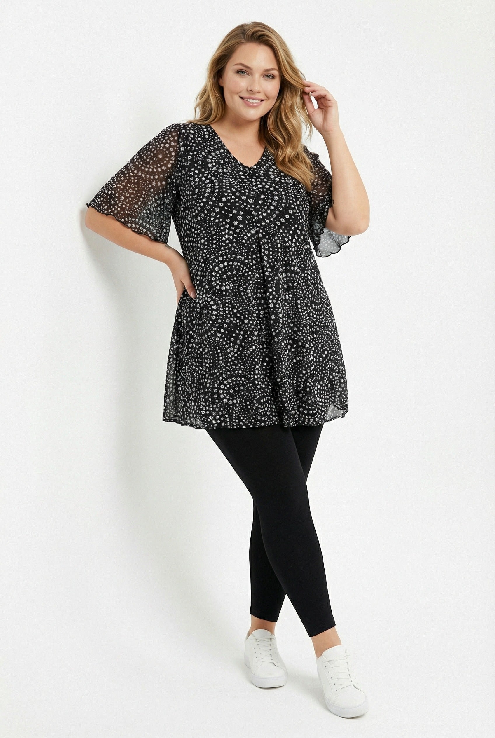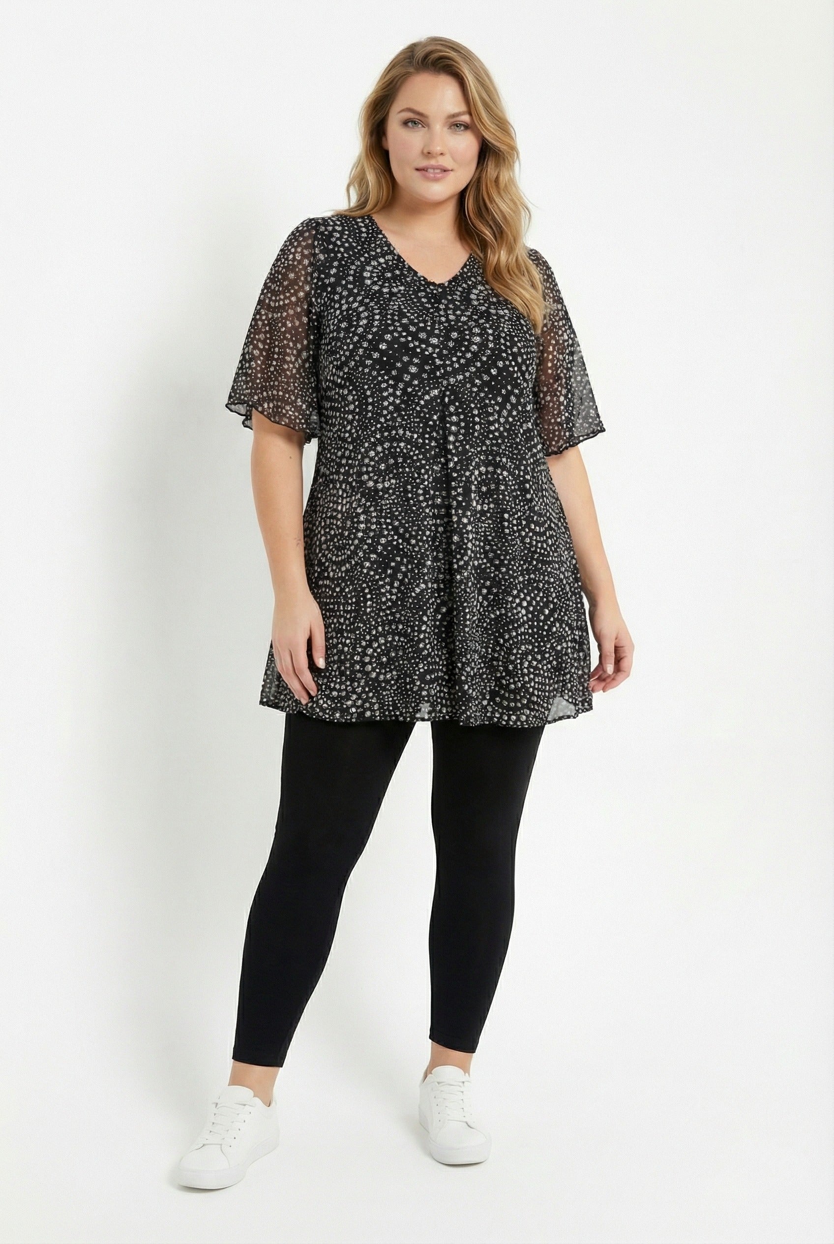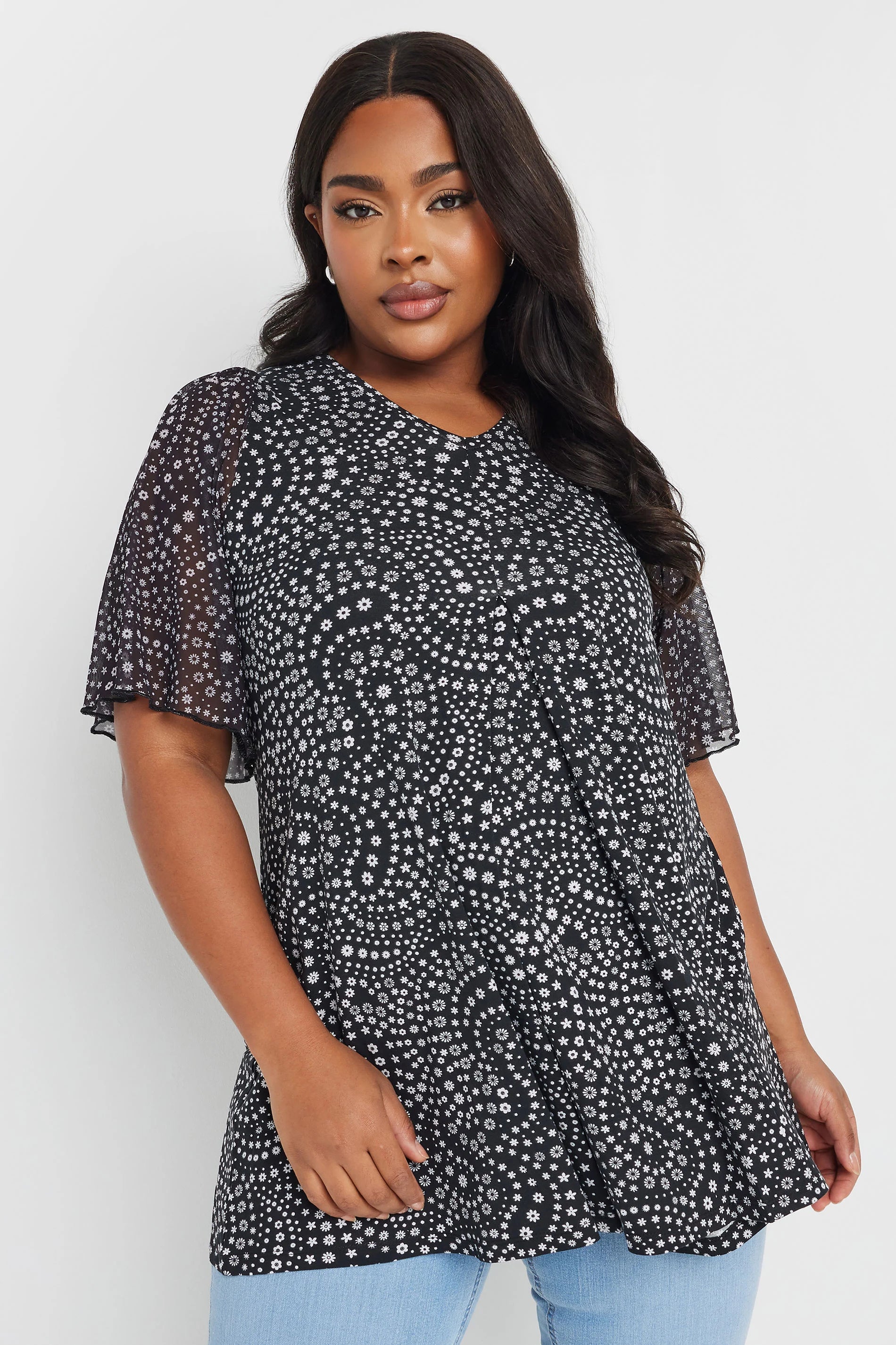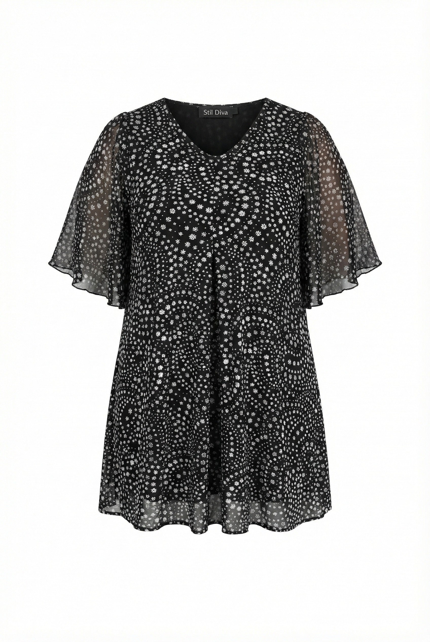 חולצה במידות גדולות צווארון וי שרוולי טול עם הדפס