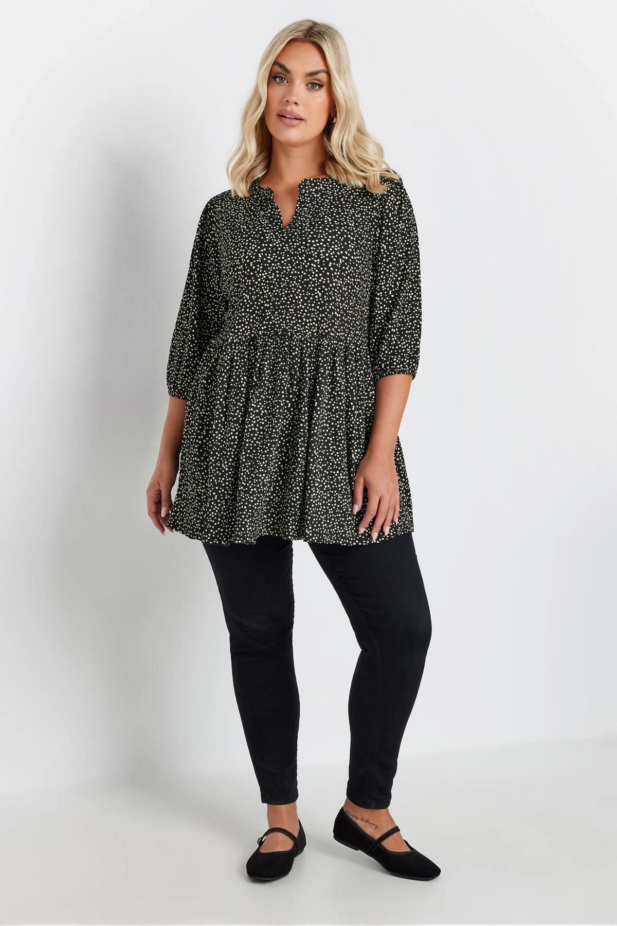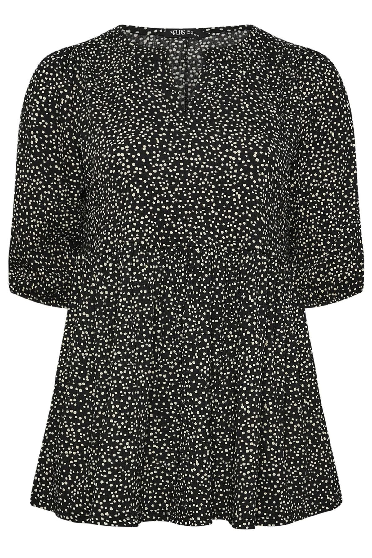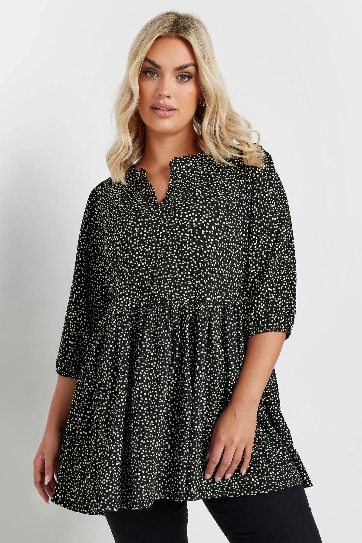 - פרטי הדגם: הדפס נקודות, גזרה רחבה, עיצוב בטקסטורה, צווארון חריץ, שרוול 3/4
