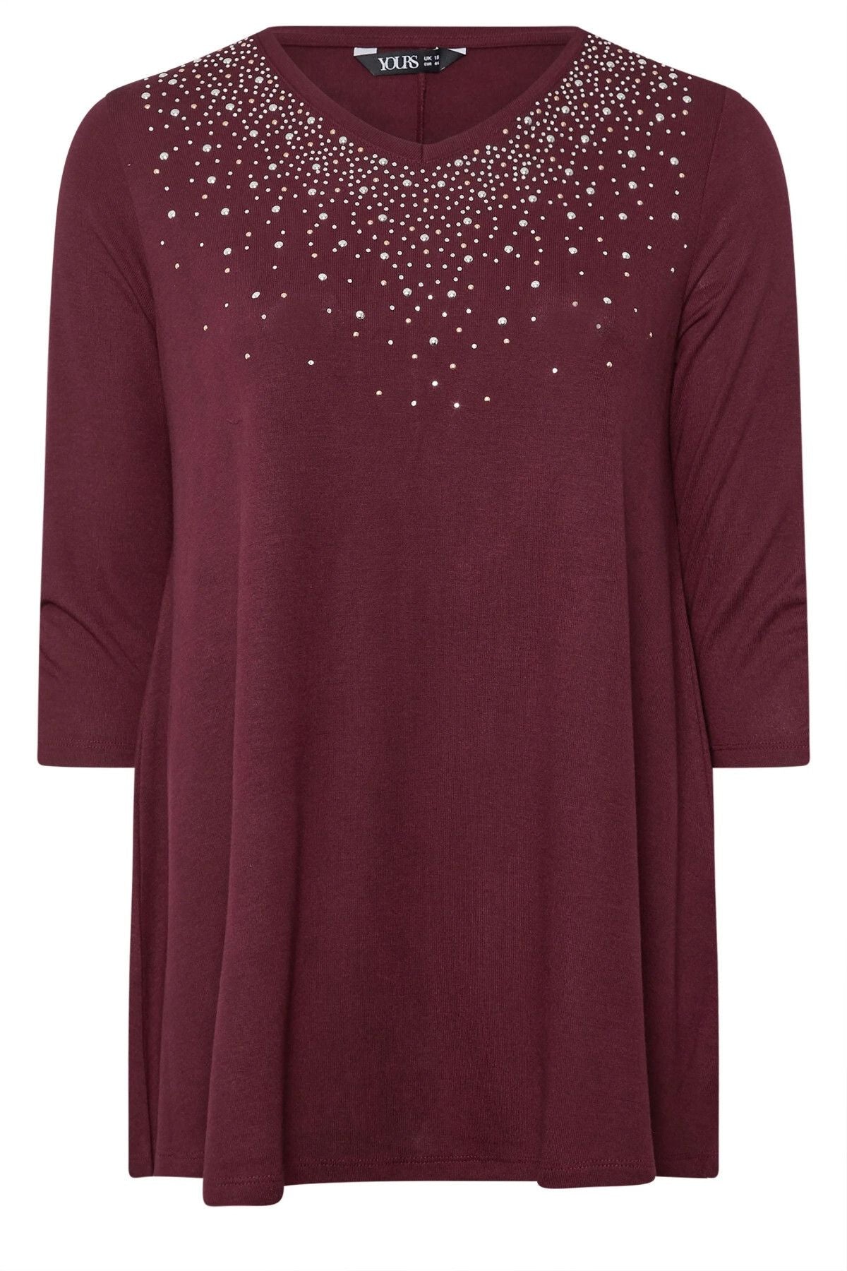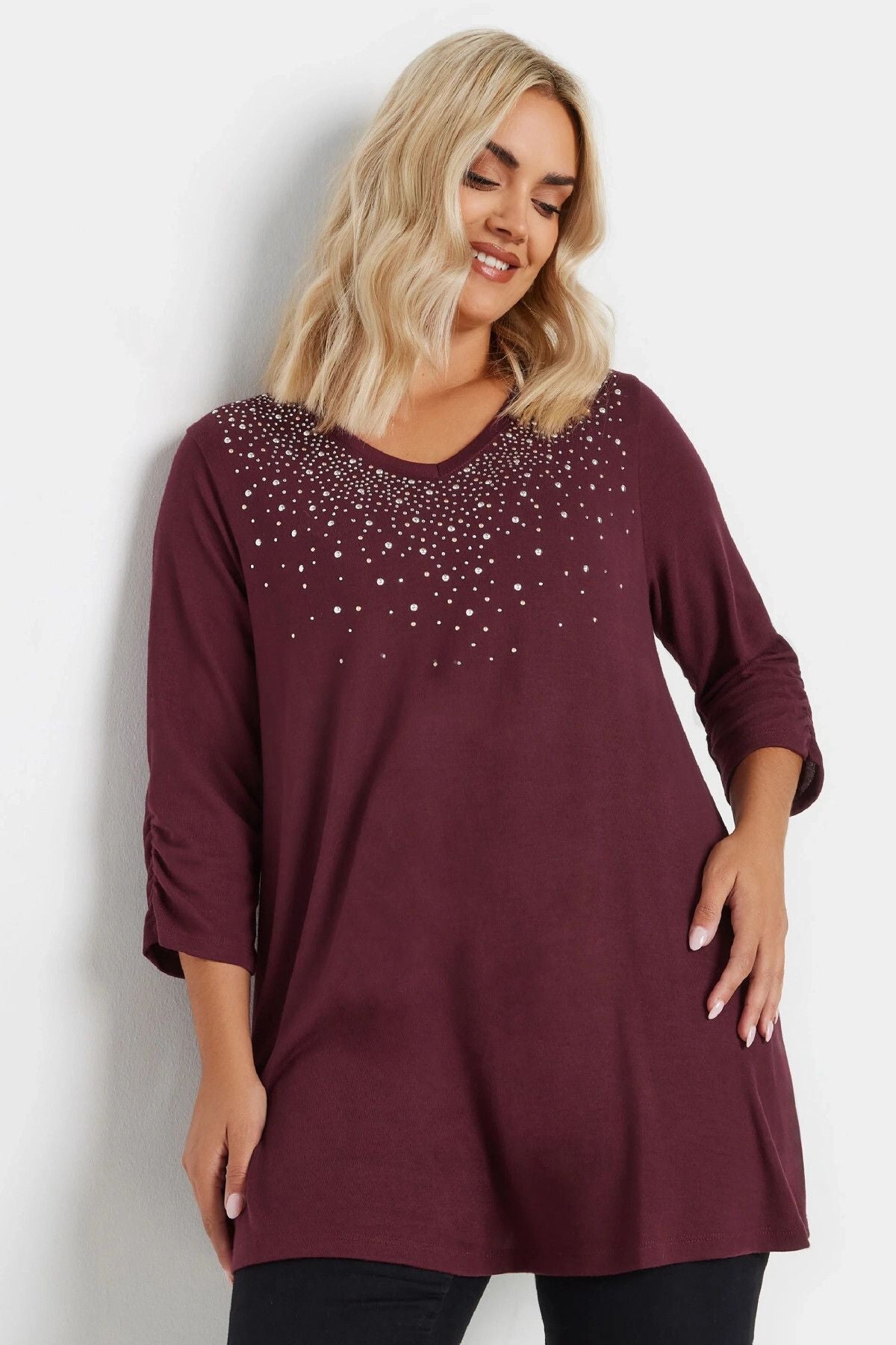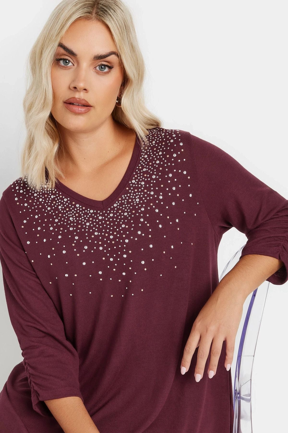 חולצה במידות גדולות צווארון V מעוטרת באבנים שרוולים מכווצים 322225