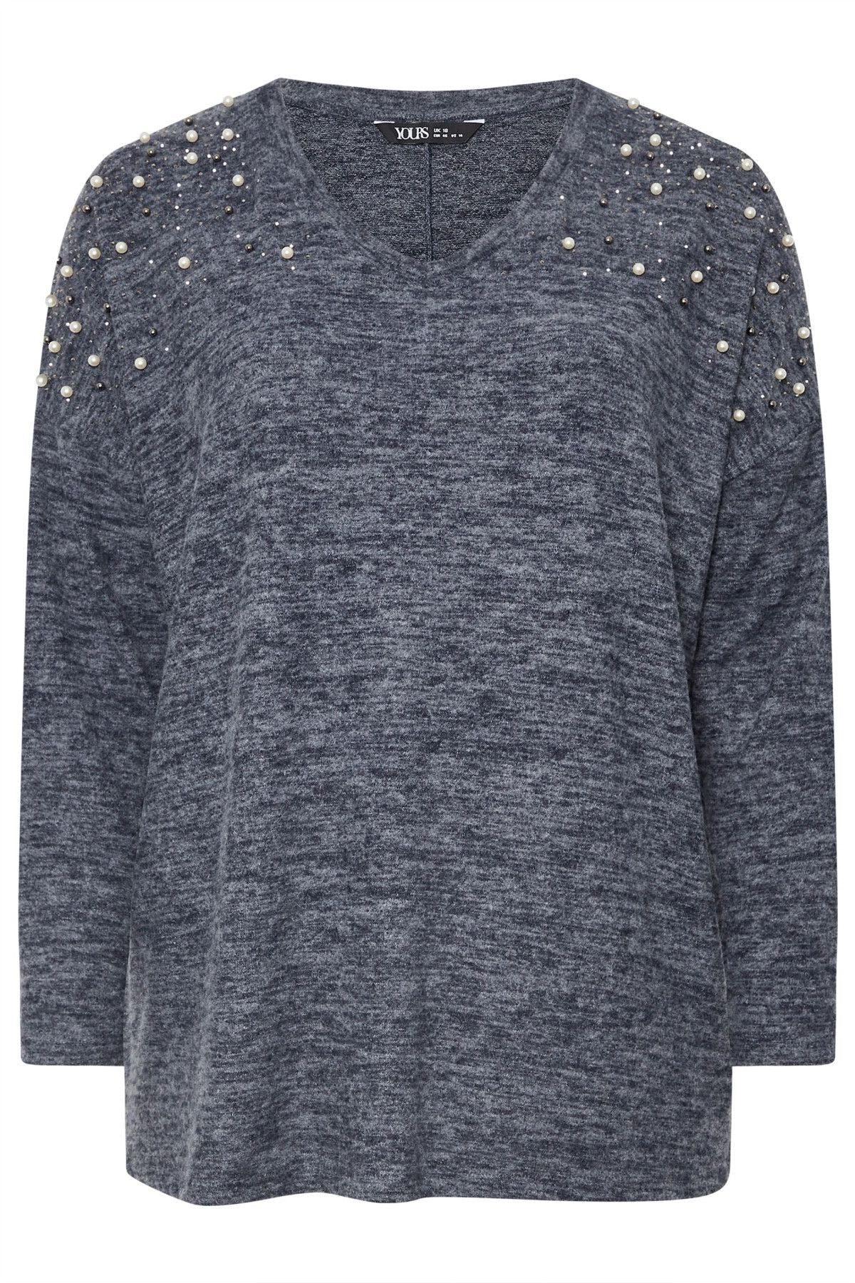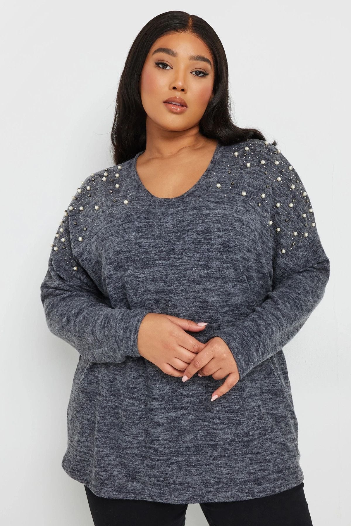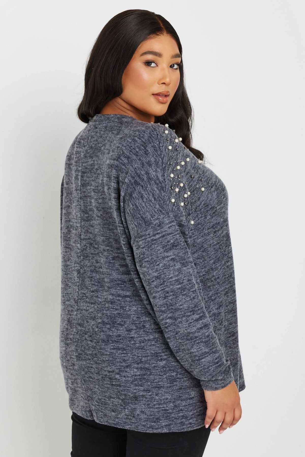 סוודר במידות גדולות צווארון V שרוול ארוך כתף מעוטרת באבנים 322302