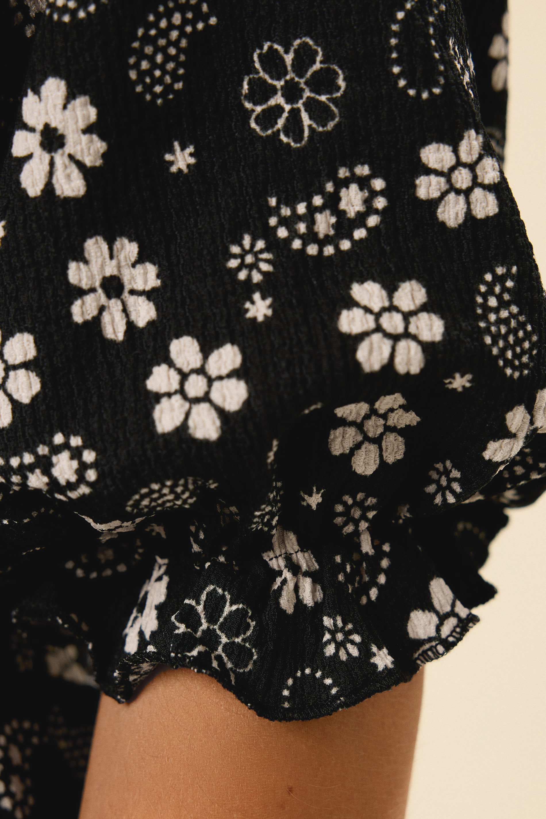 - פרטי הדגם: הדפס שאל פרחוני, צווארון צ’נטיק, גזרת שכבות, שרוול קצר