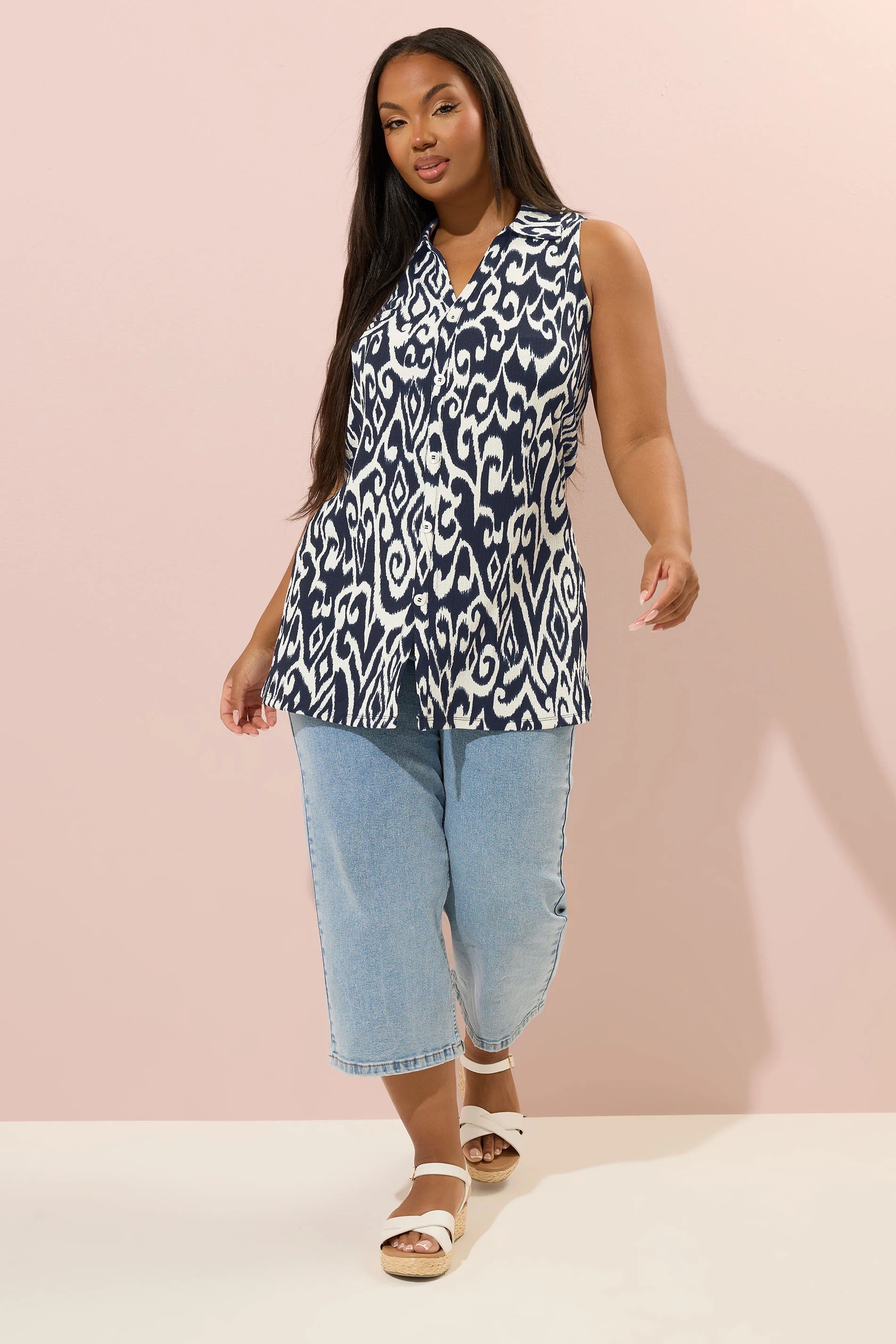 חולצה בלי שרוולים עם דוגמה אבסטרקטית ופירוט כפתורים במידות גדולות 322678