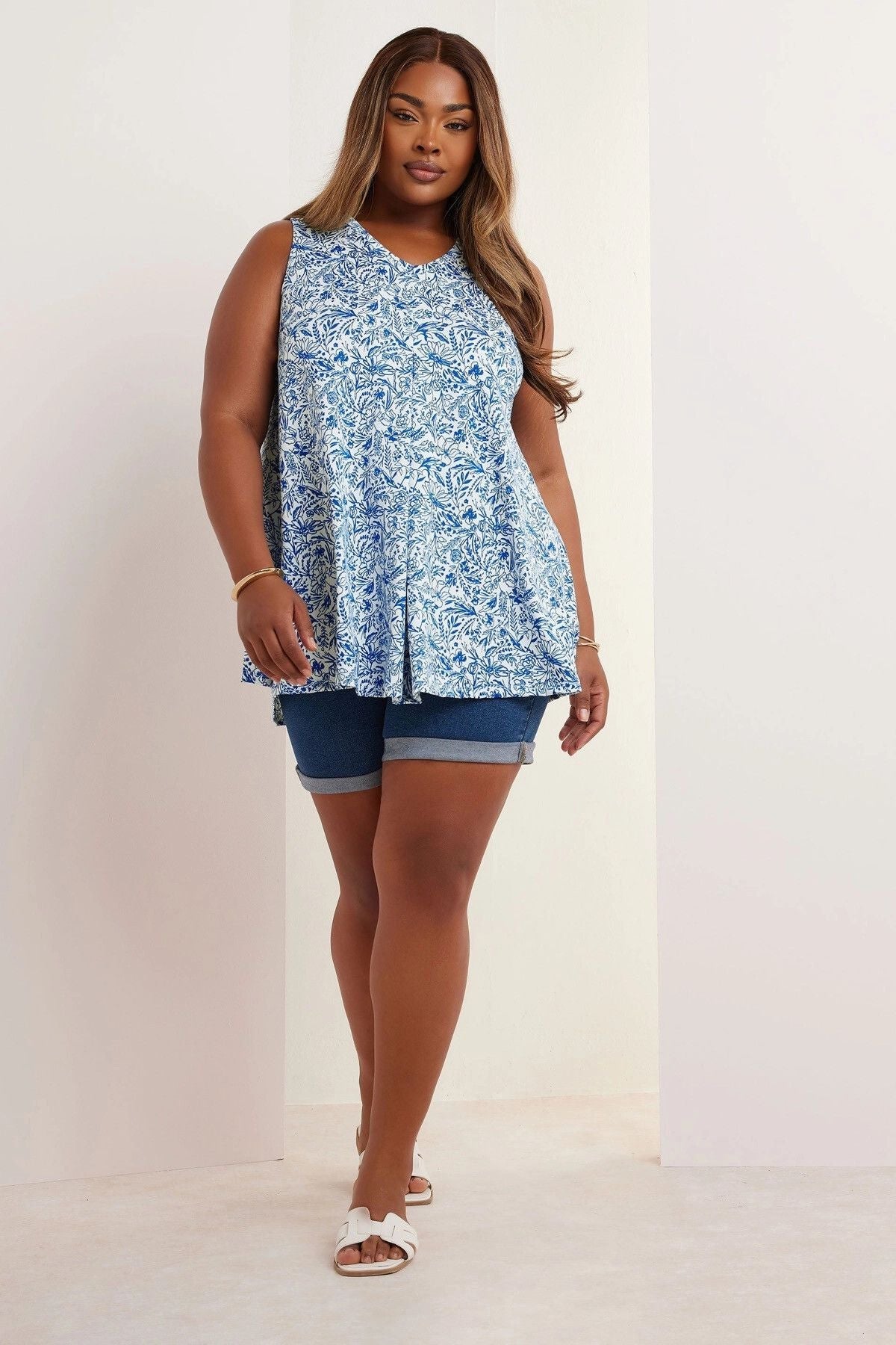 טישירט במידות גדולות צווארון V חזית עם קפלים חולצה ללא שרוולים דוגמת פרחים 322684