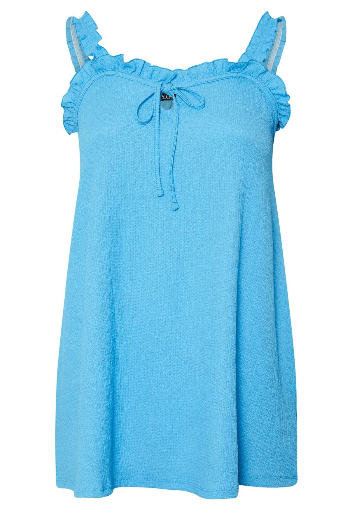 - פרטי הדגם: כתפיות פרנזים צווארון פרנזים קשירה בצווארון חולצה ללא שרוולים חולצה רחבה