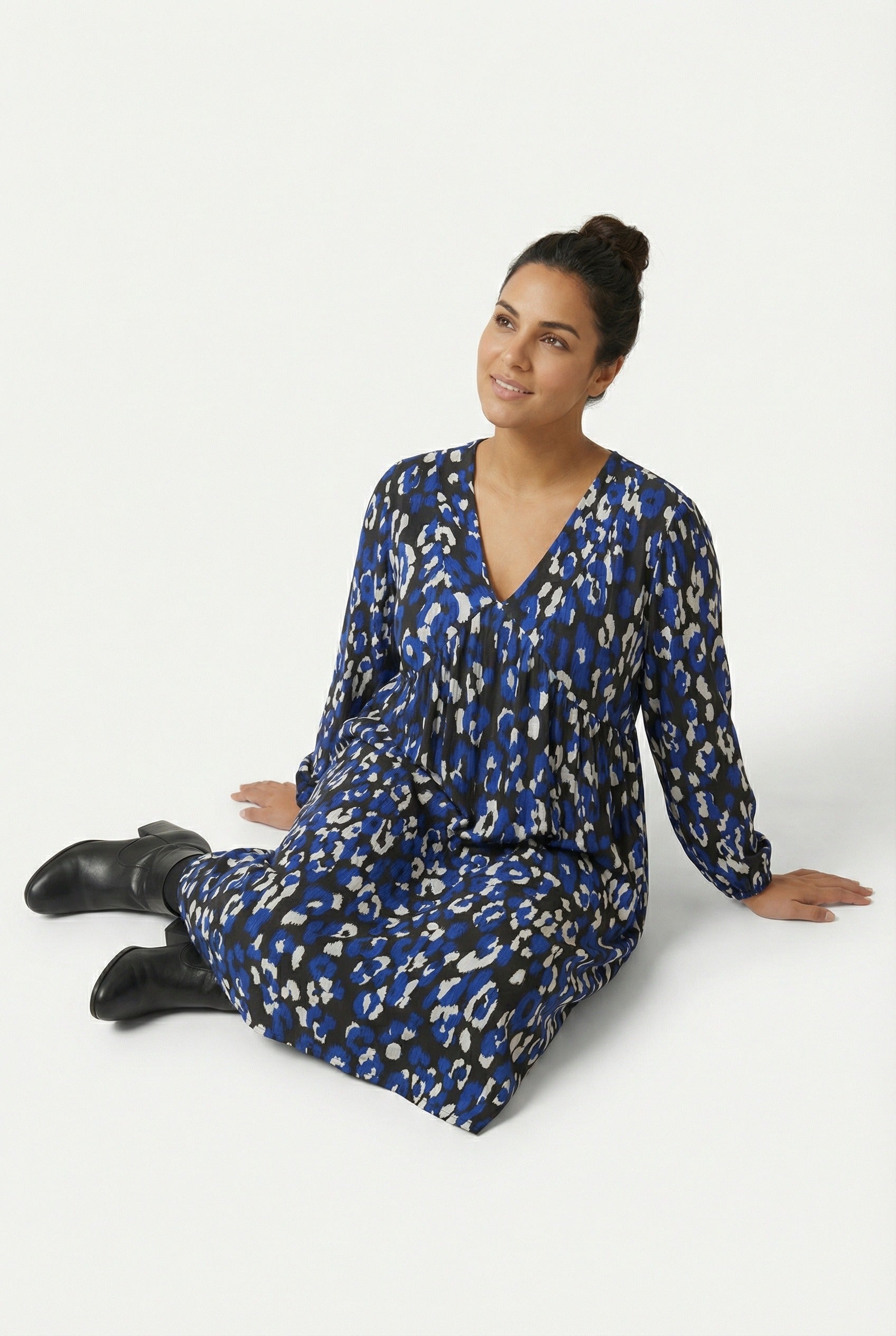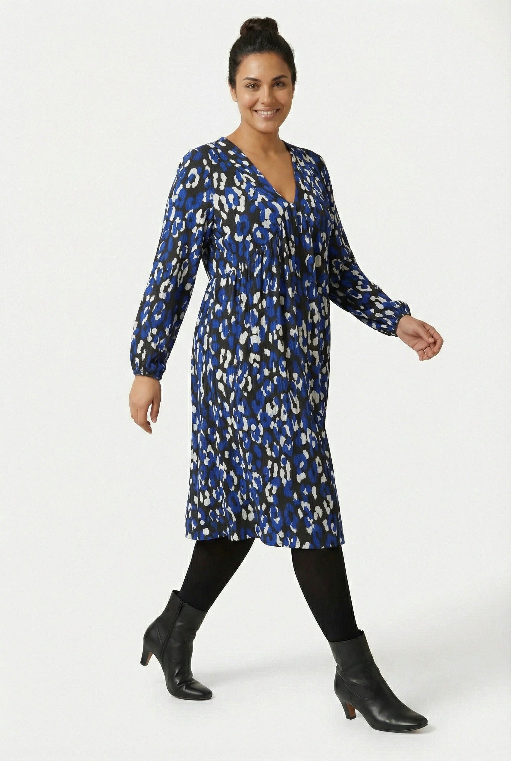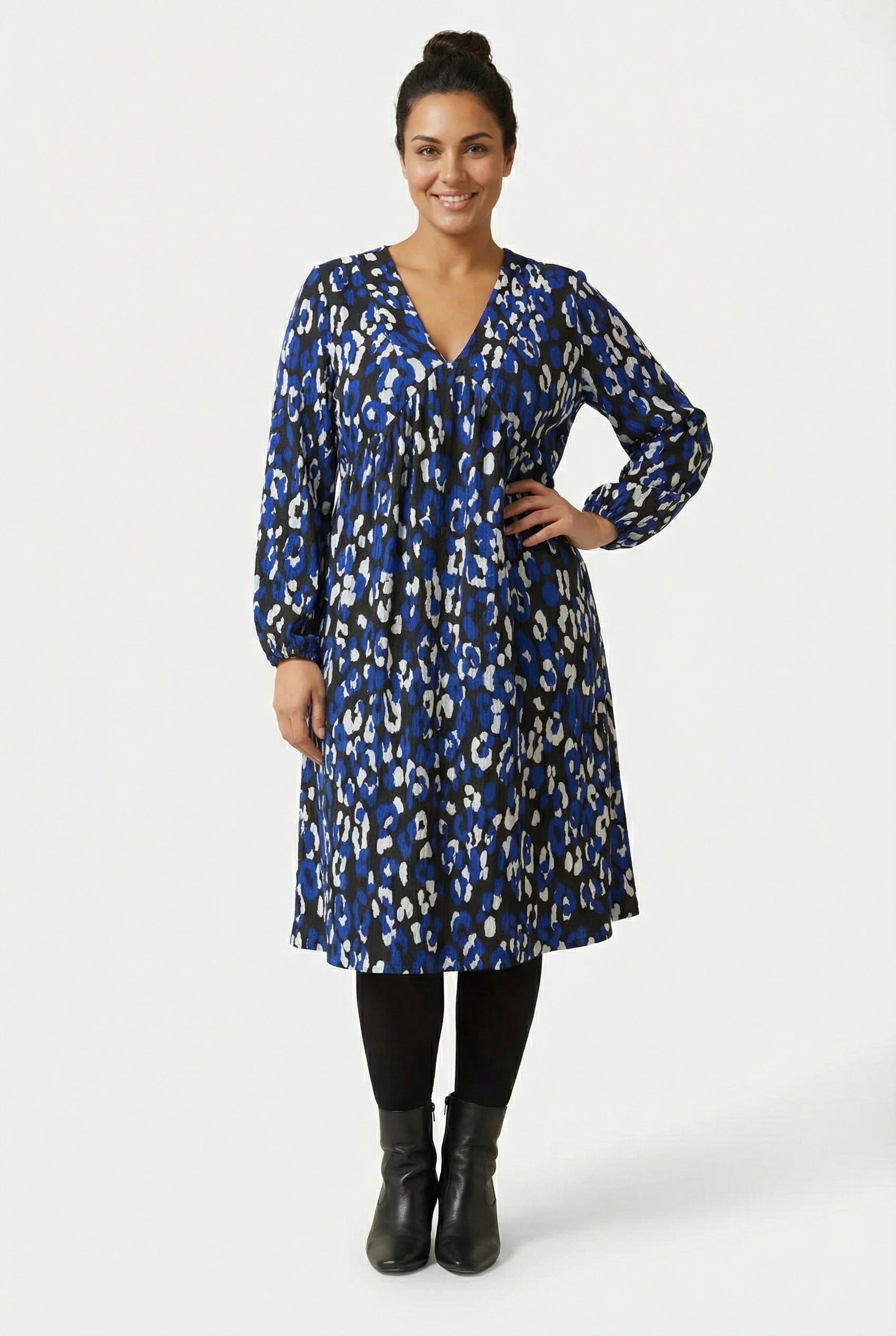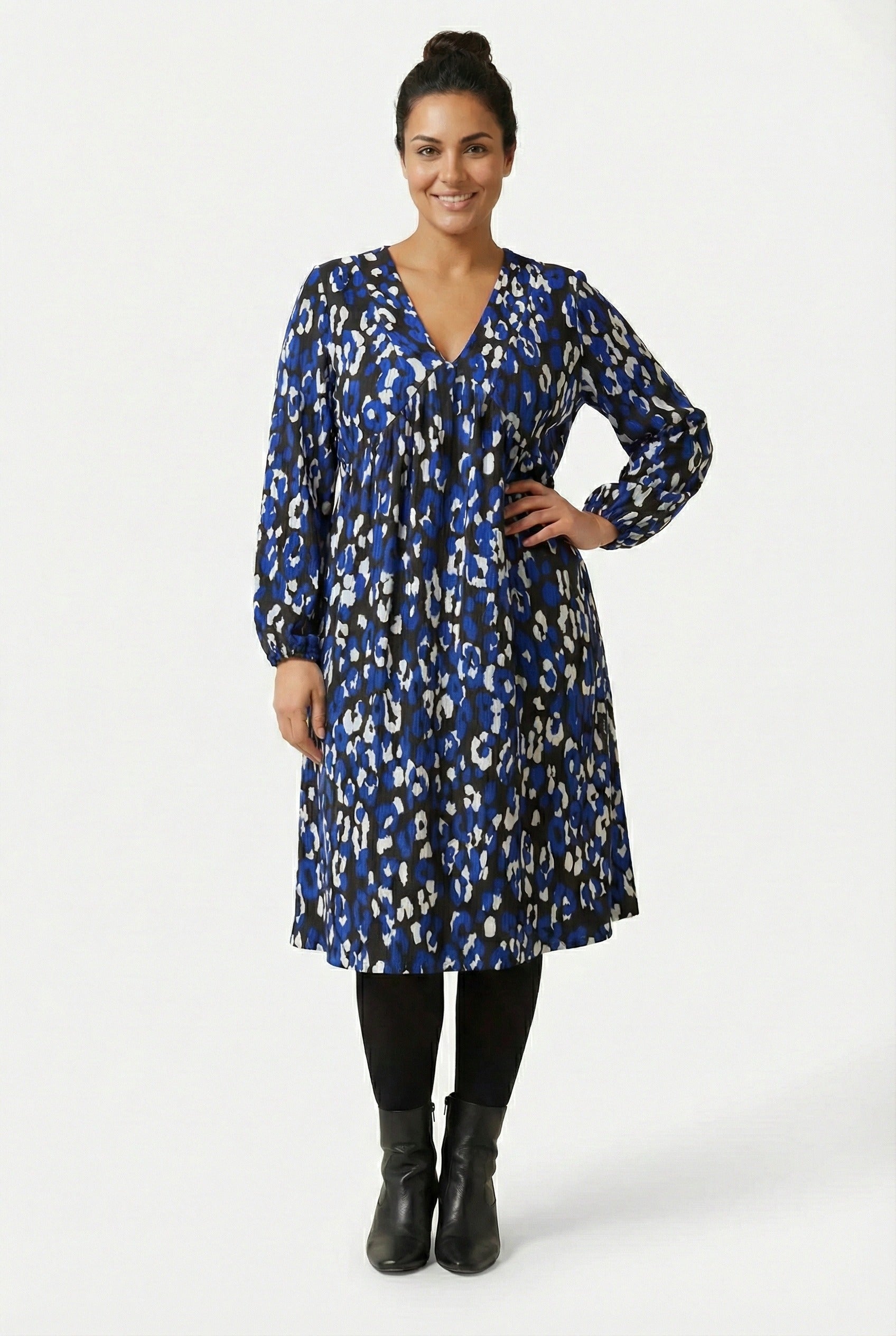 - פרטי הדגם: דוגמת חיות, צווארון וי, שרוול ארוך עם חפתים, שני כיסים בצדדים, אורך מידי.