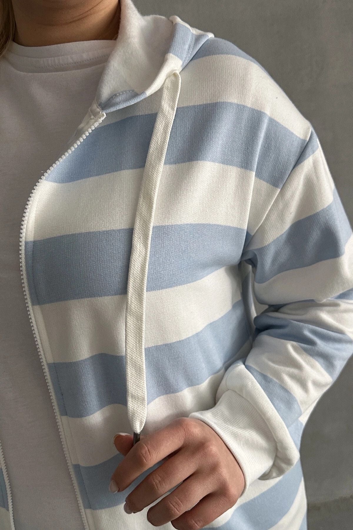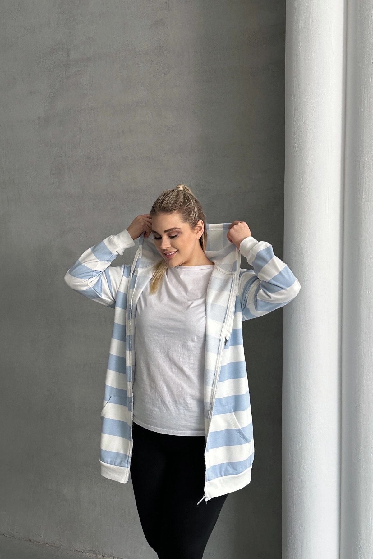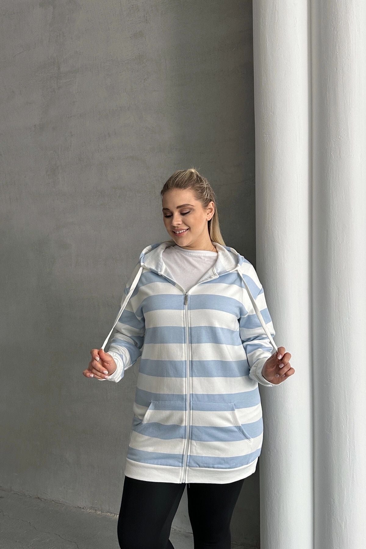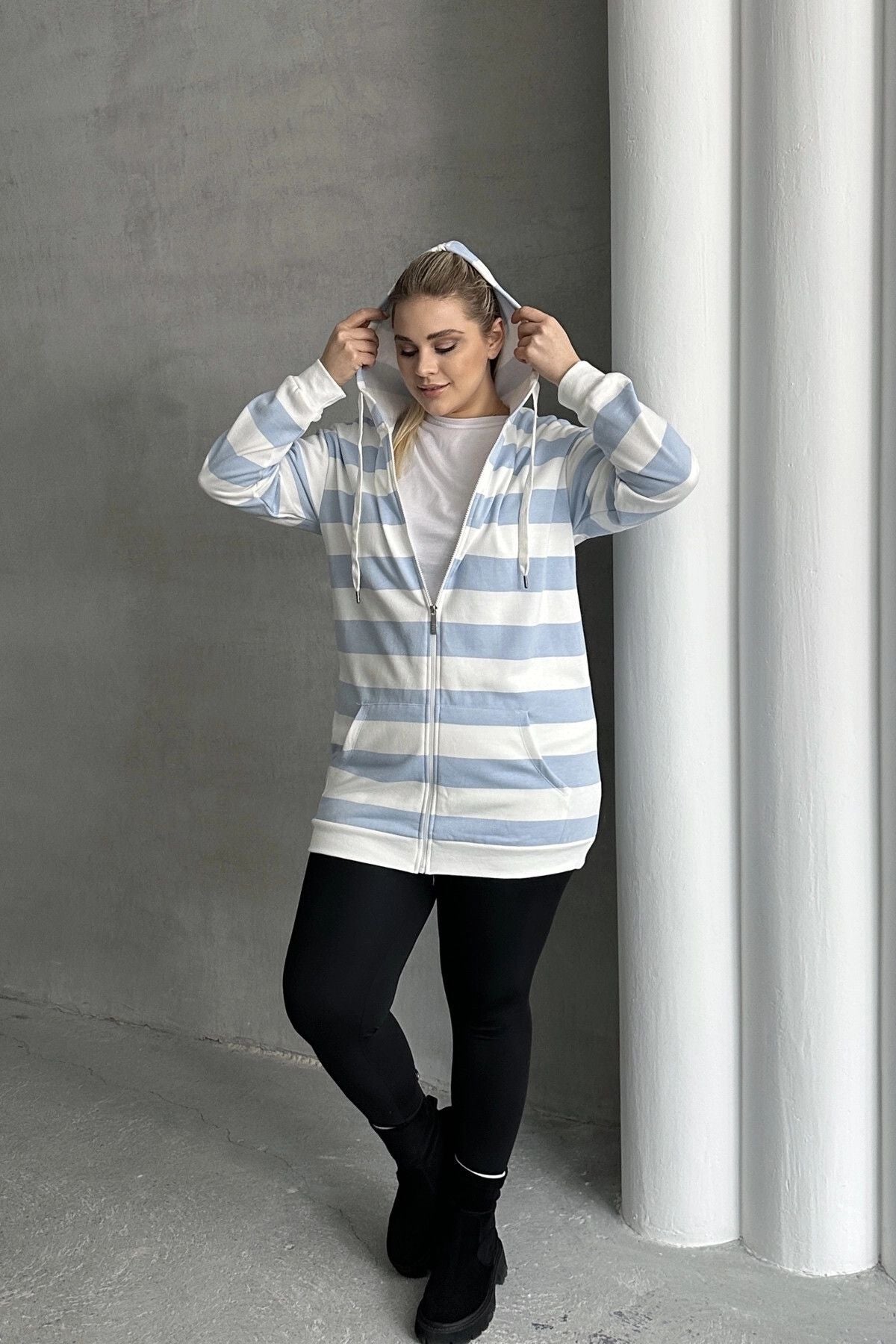 - פרטי הדגם: שרוול ארוך, קפוצ׳ון, עם כיסים, עם רוכסן