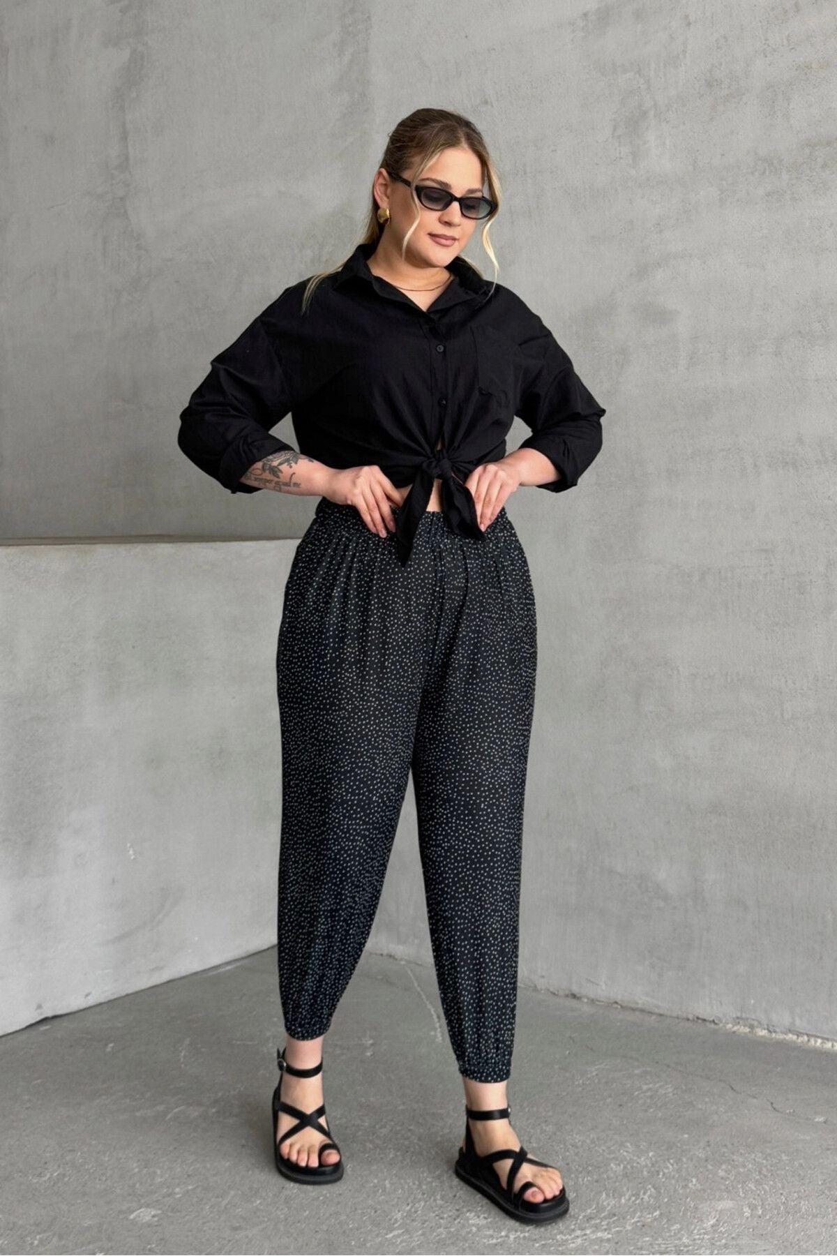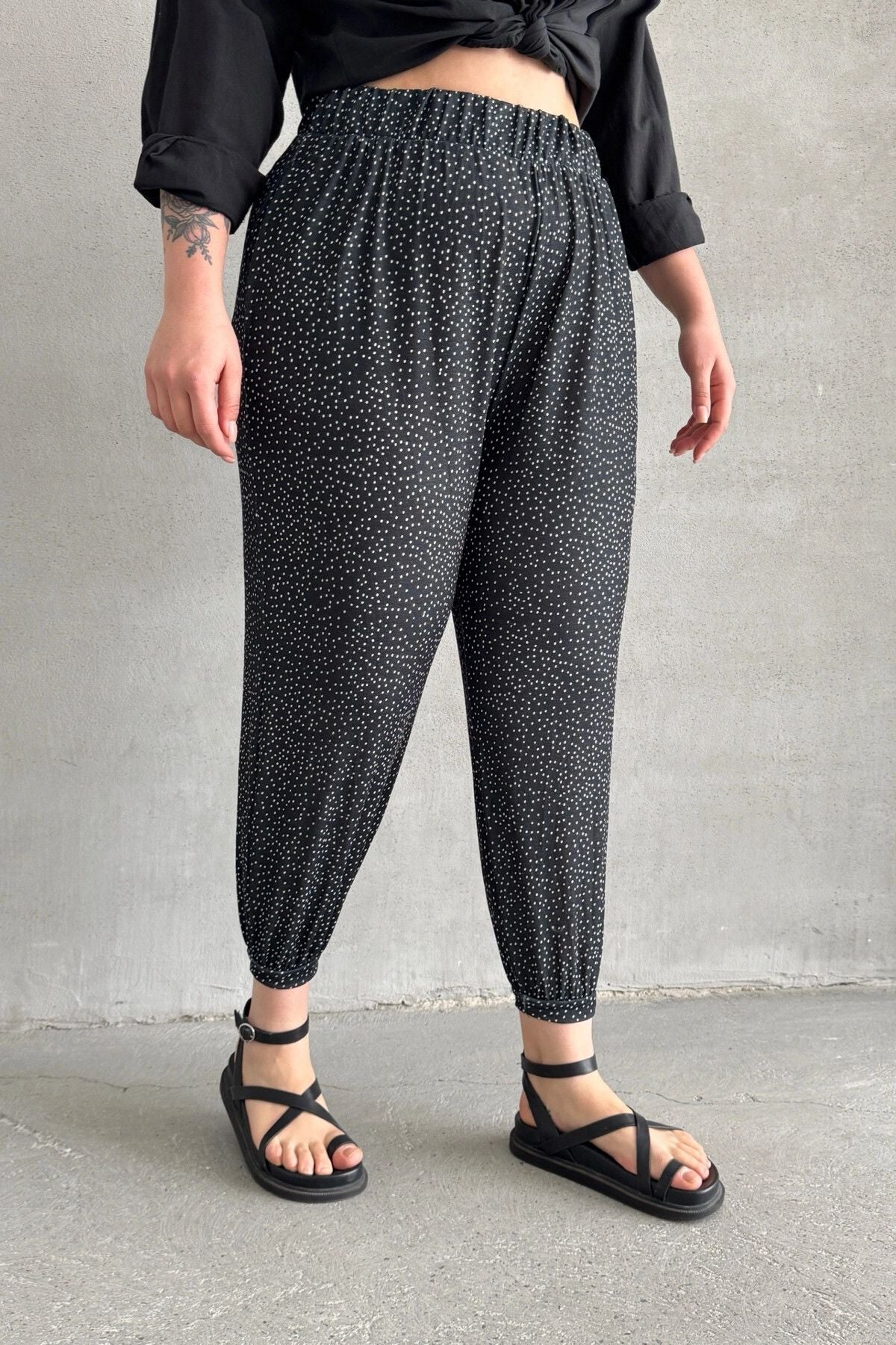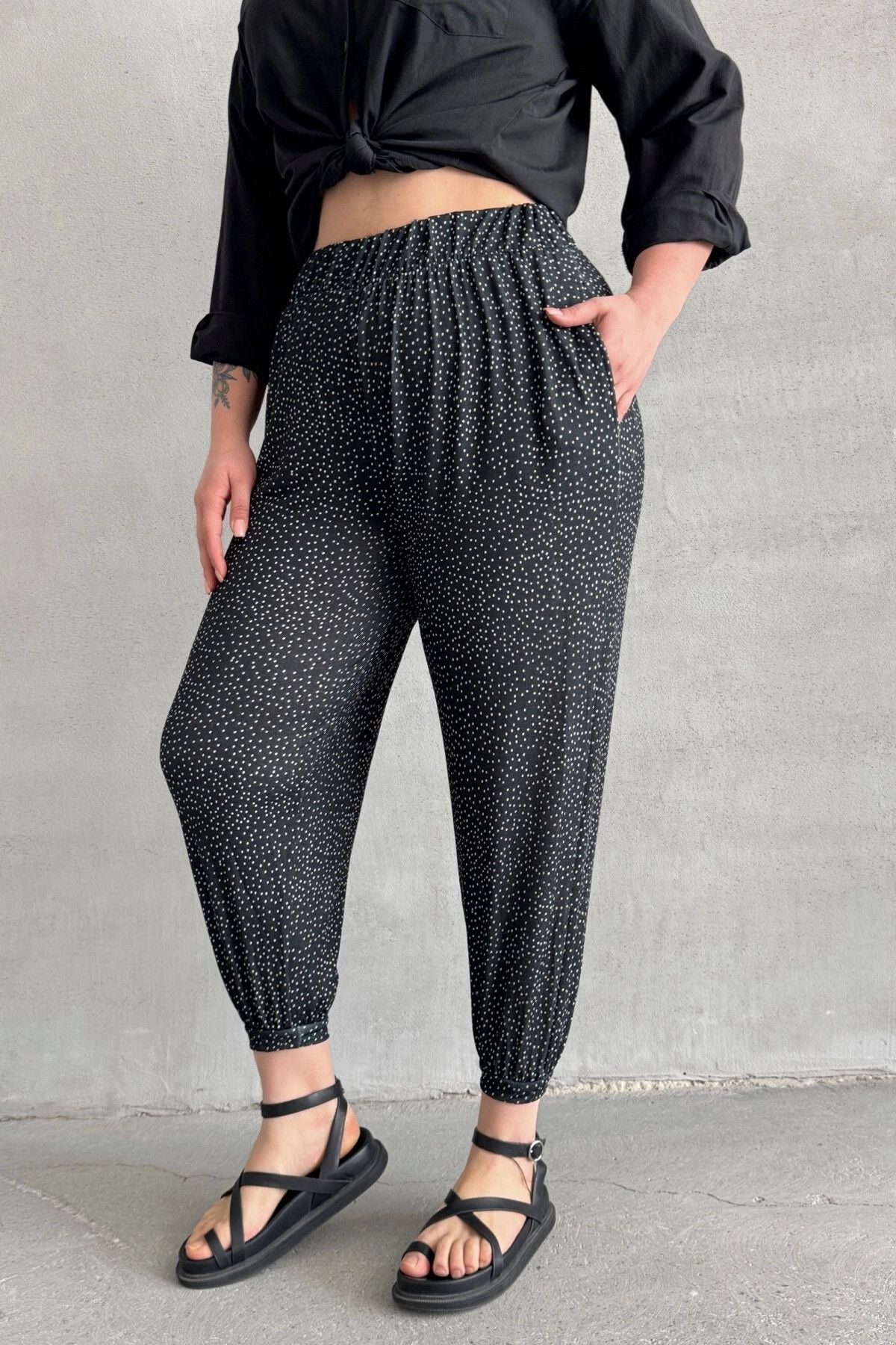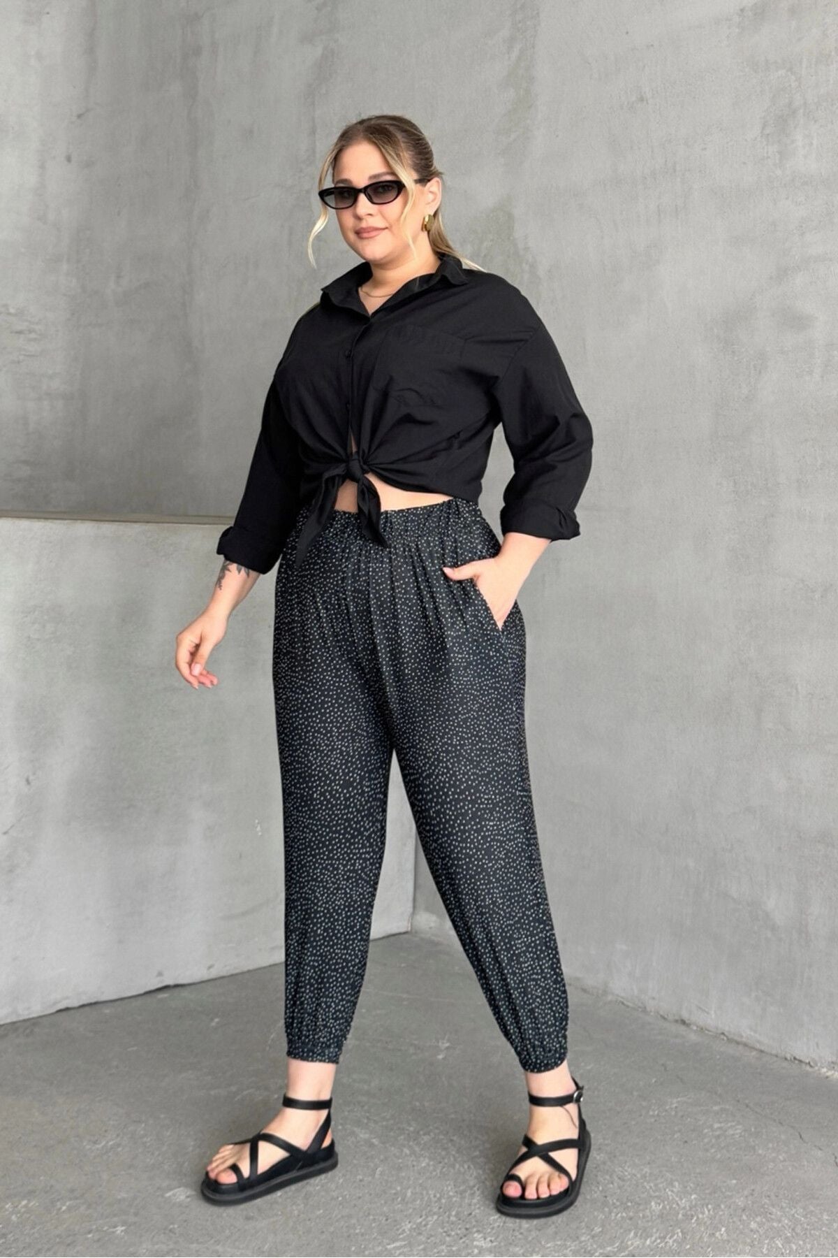 • תיאור מוצר: מכנסיים אלה, המשלבים נוחות ואלגנטיות, מציעים נוחות לאורך כל היום בזכות העיצוב עם גומי במותן ובשוליים. דוגמת הנקודות מעניקה מראה מודרני, והכיסים מוסיפים פרקטיות. בשילוב חולצה מכופתרת בסיסית וסנדלים מתקבל מראה שיקי ללא מאמץ.