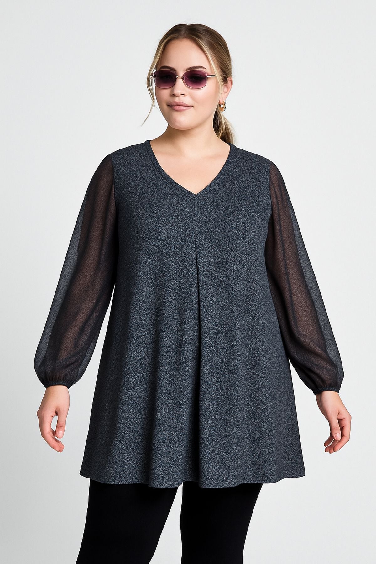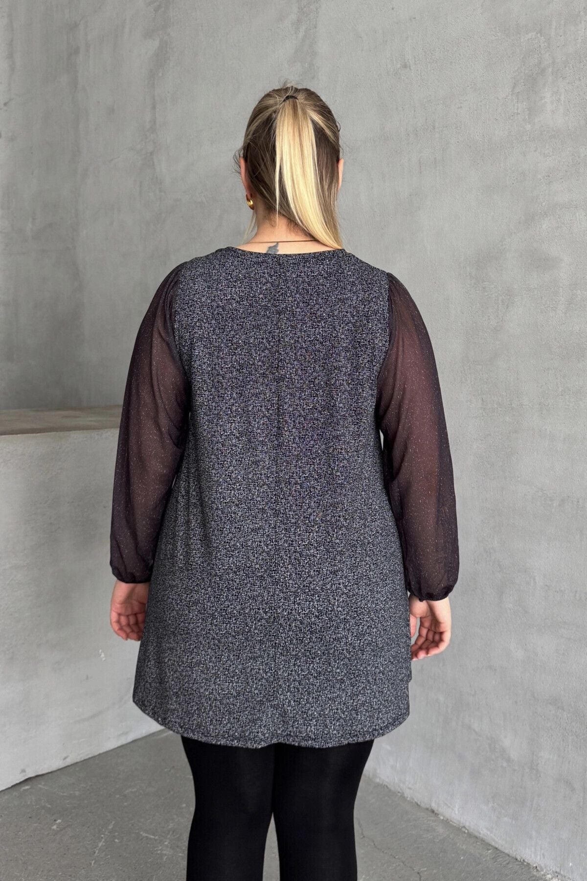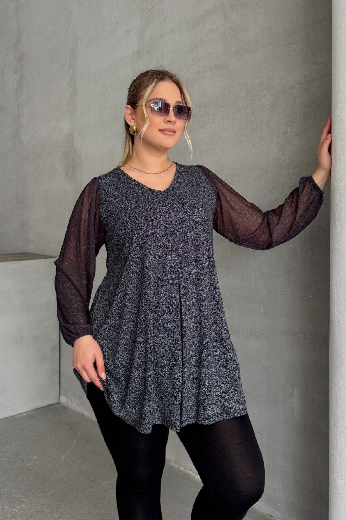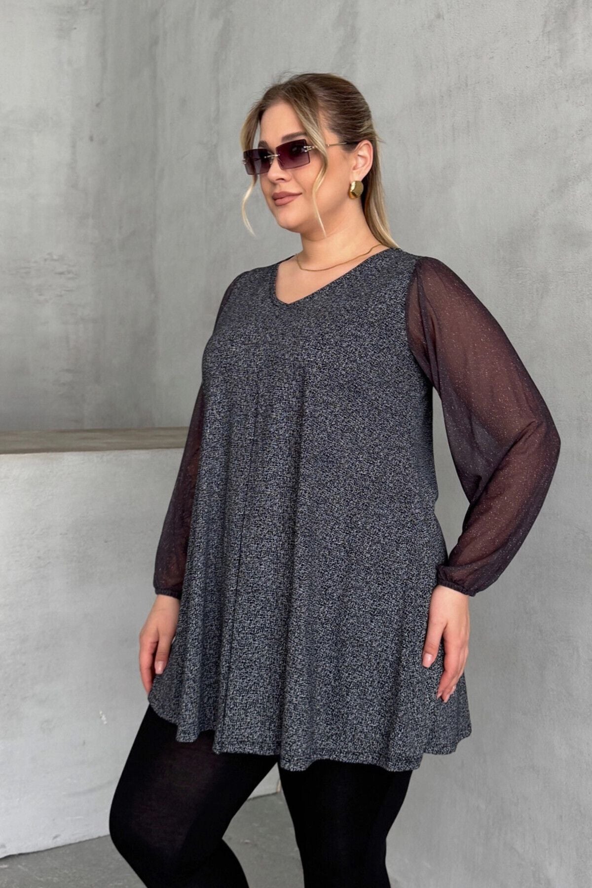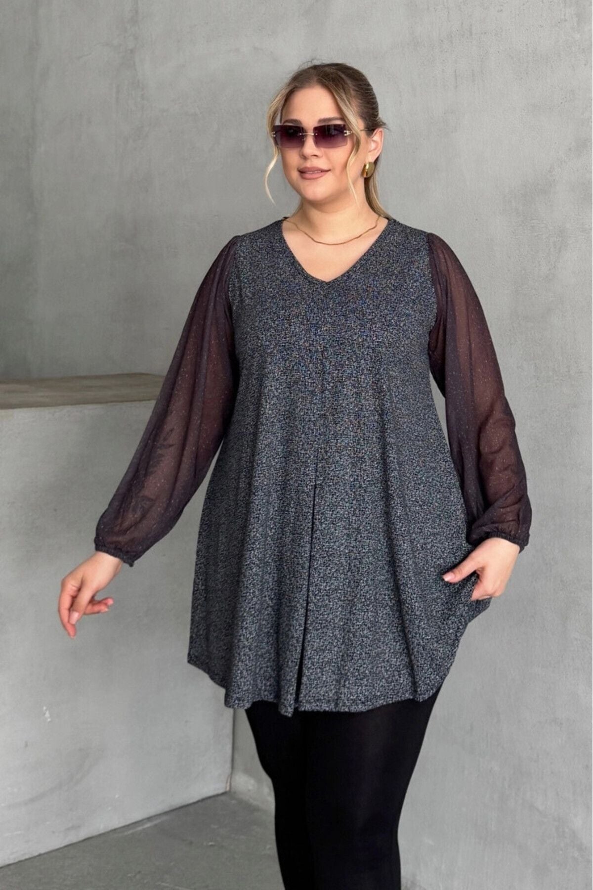 חולצה במידות גדולות ארוך שרוול טול צווארון V גומי בפרקי הידיים מבריק חולצה 78-132