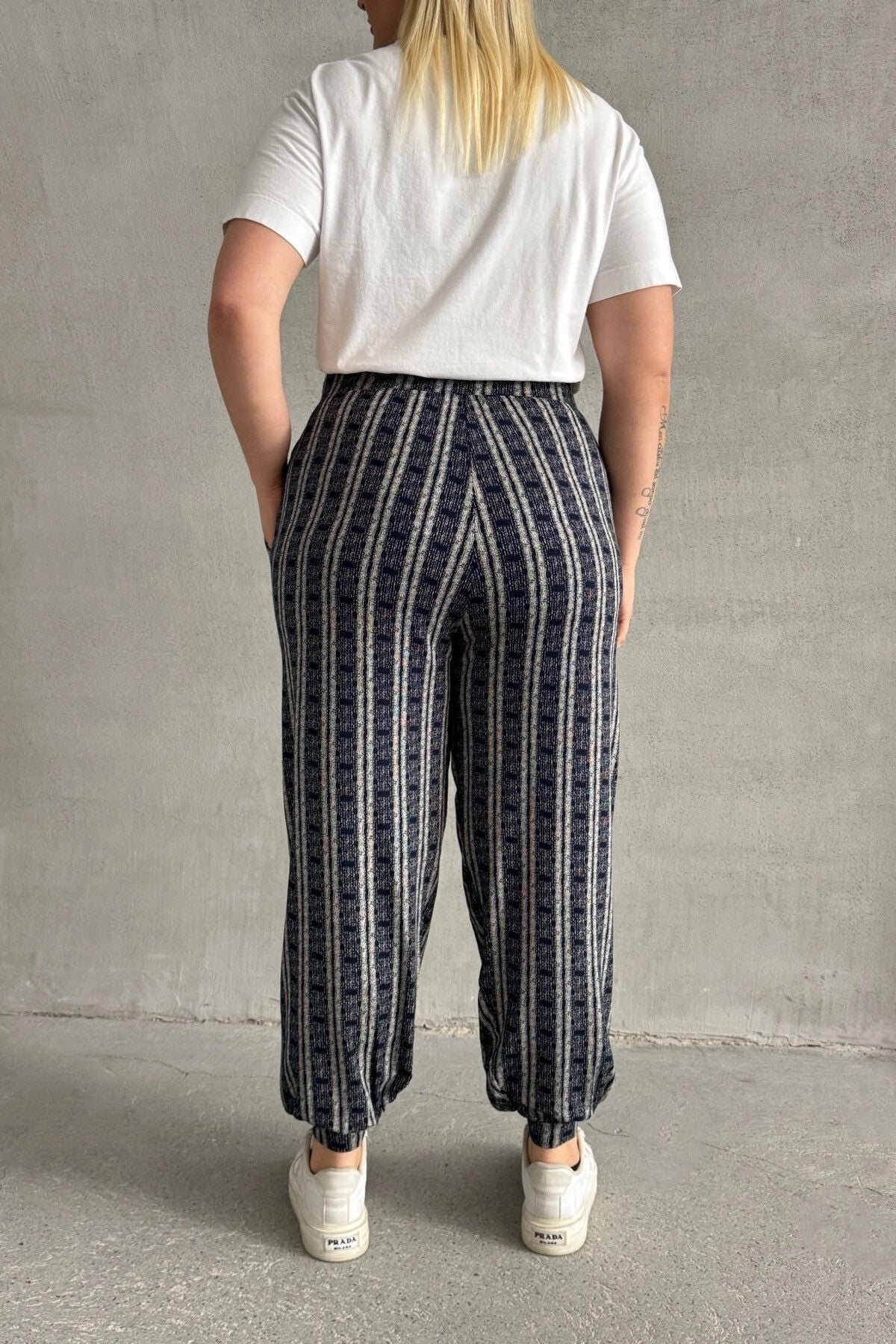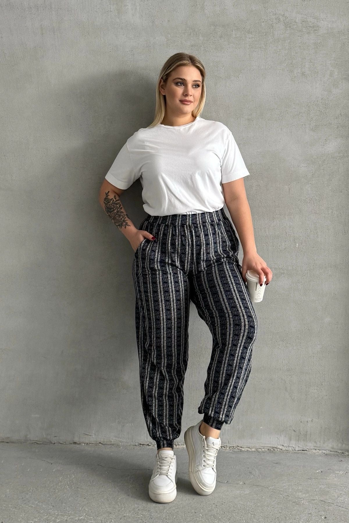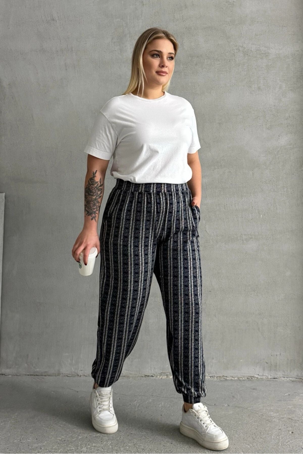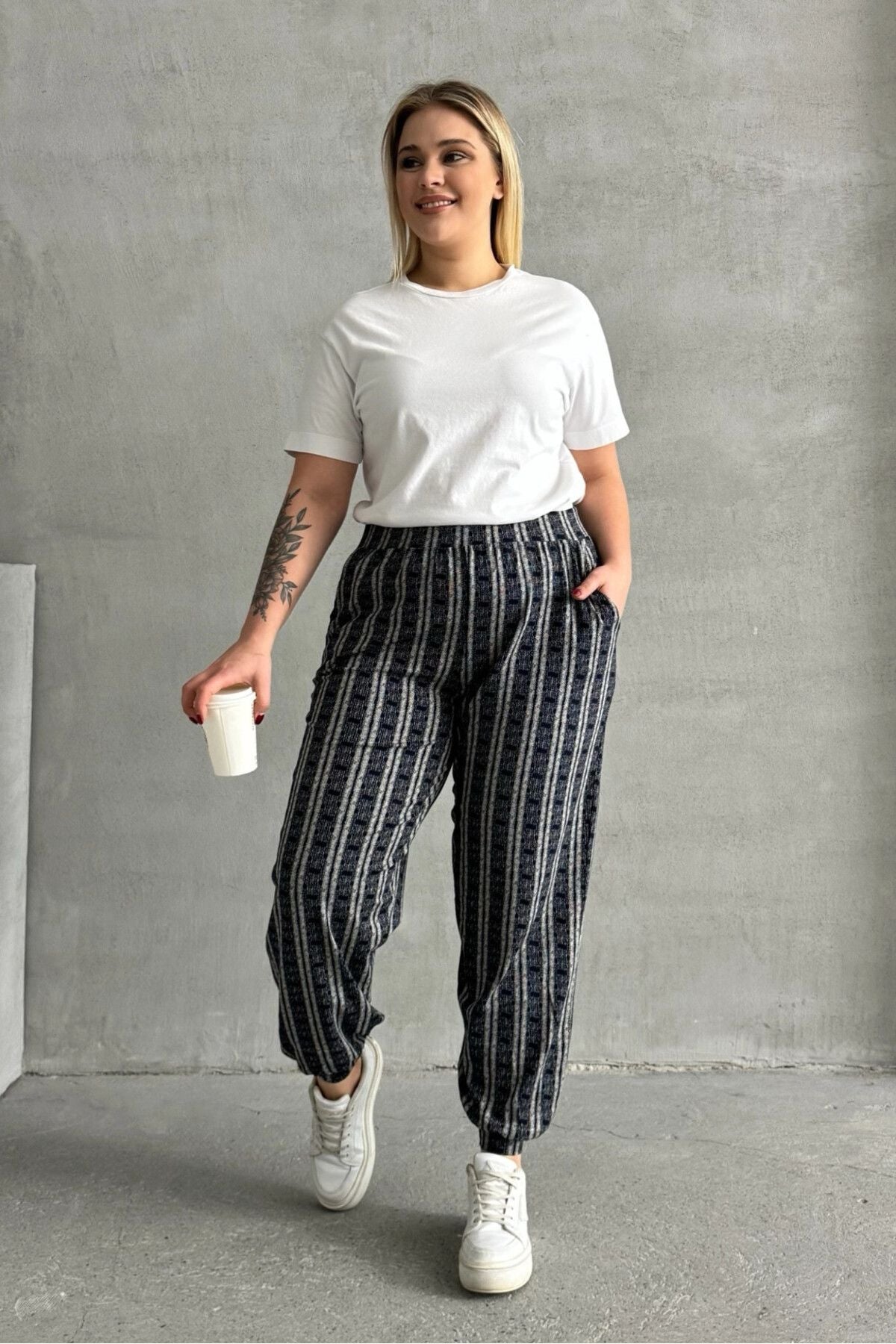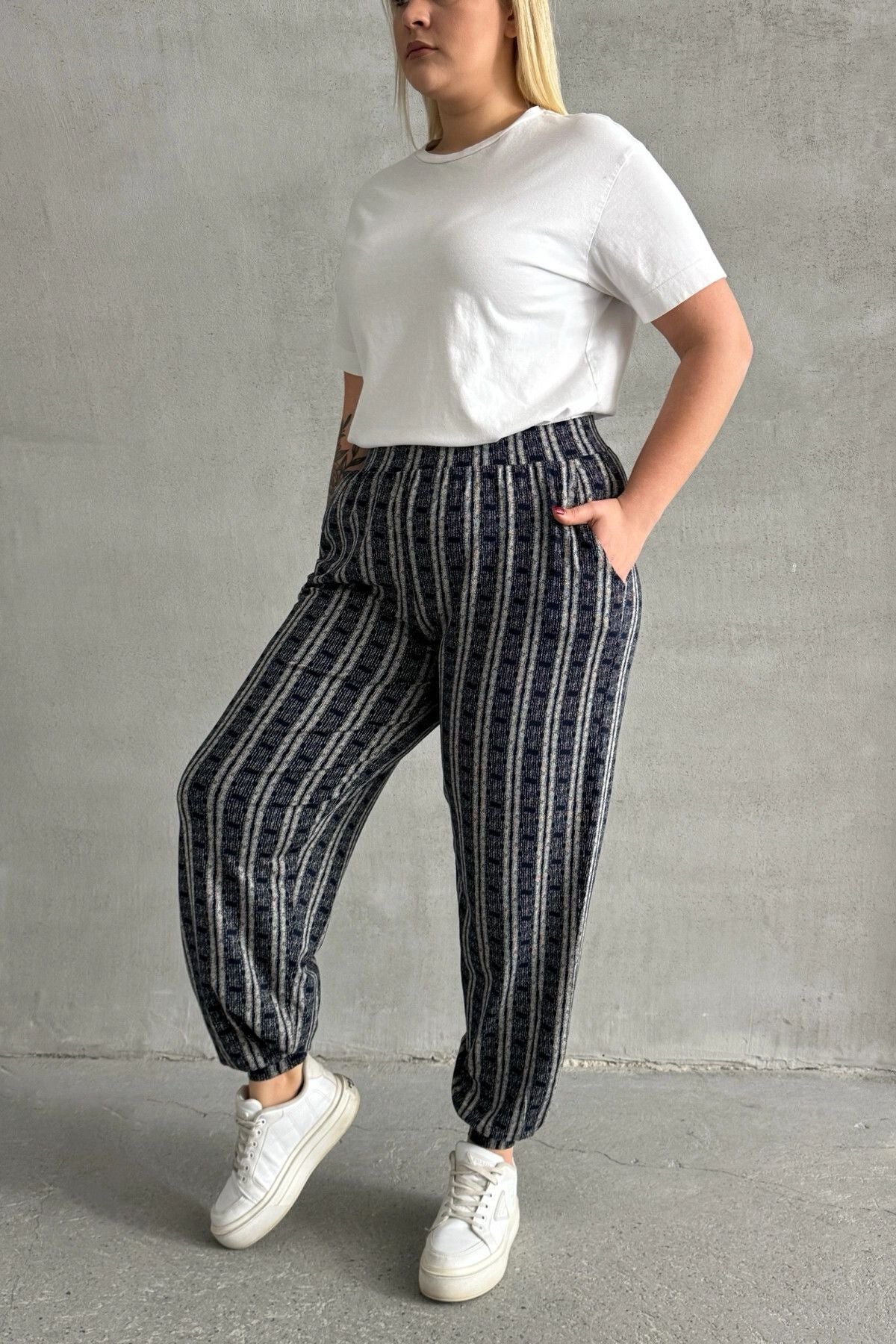 מכנסיים במידות גדולות גומי במותן גומי בשוליים עם כיסים דוגמת פסים 89-71