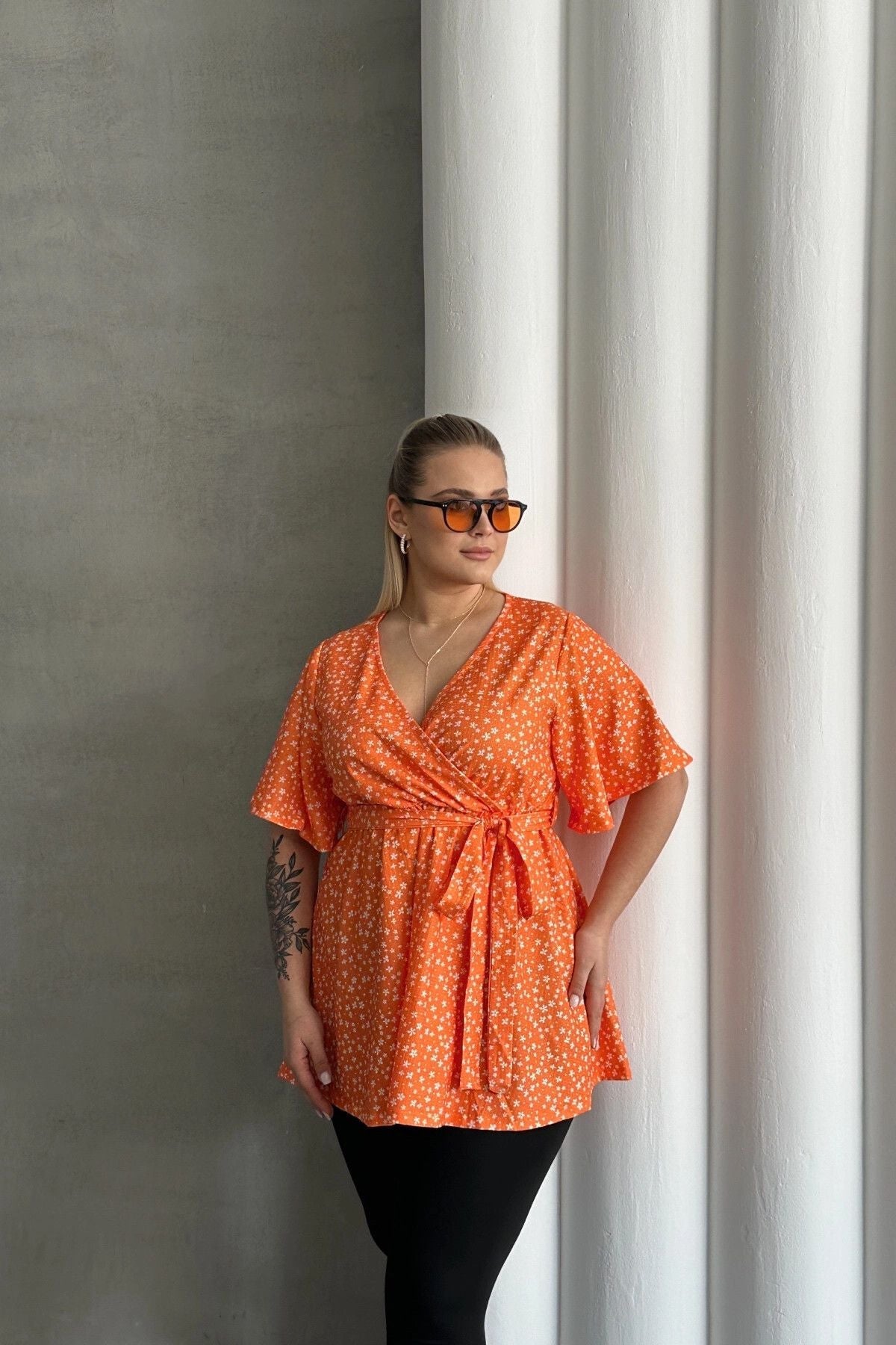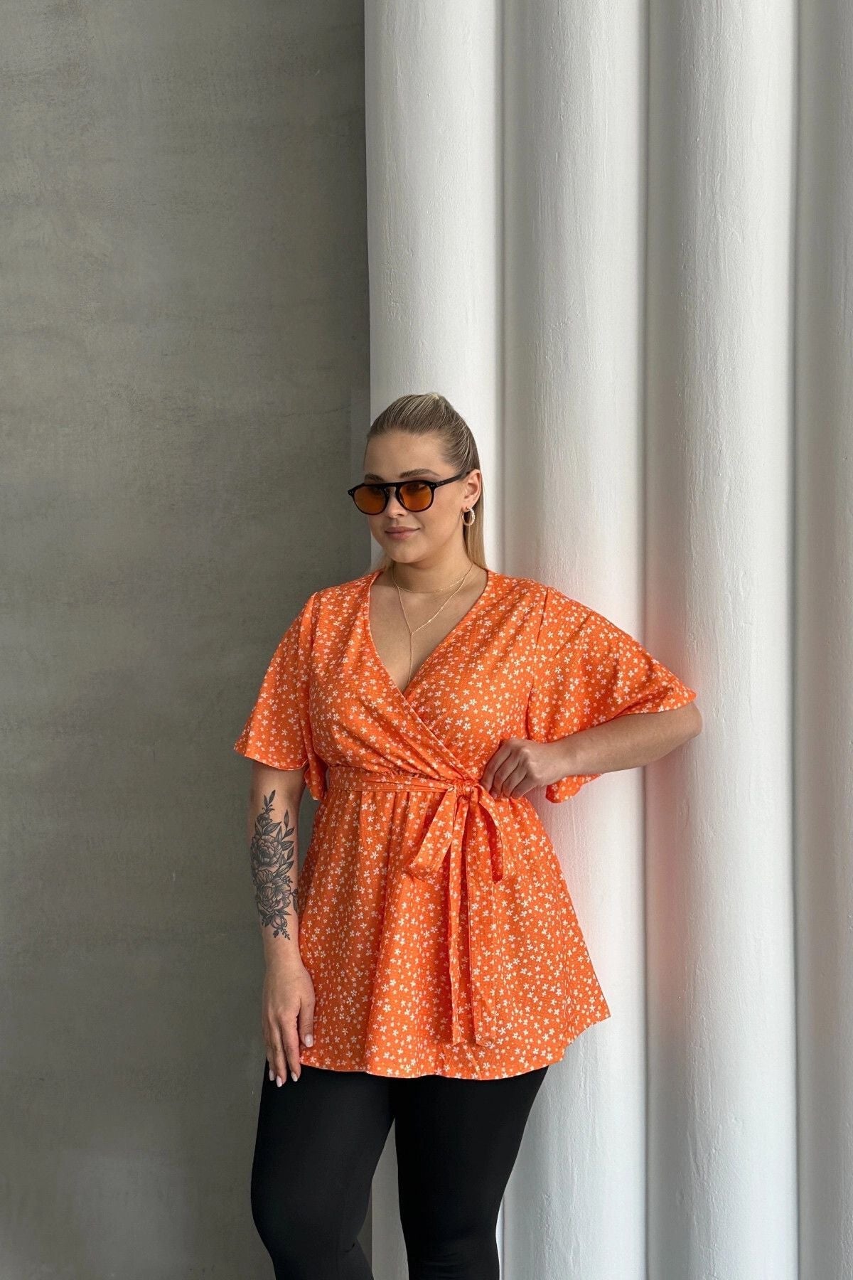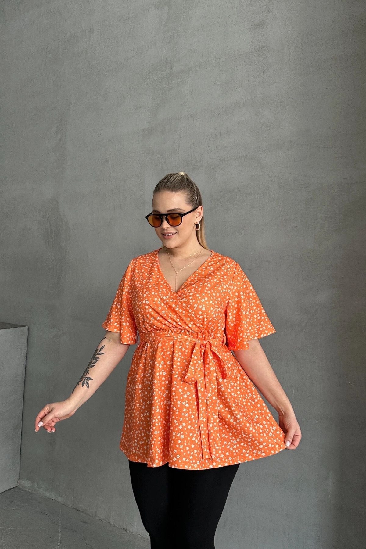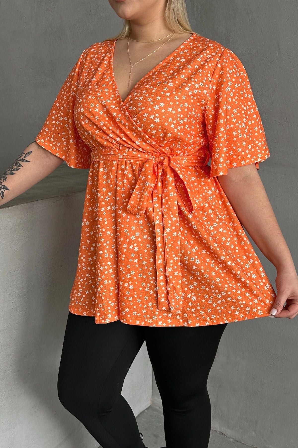 חולצה במידות גדולות שרוול קצר צווארון V קשירה מקדימה 97-40