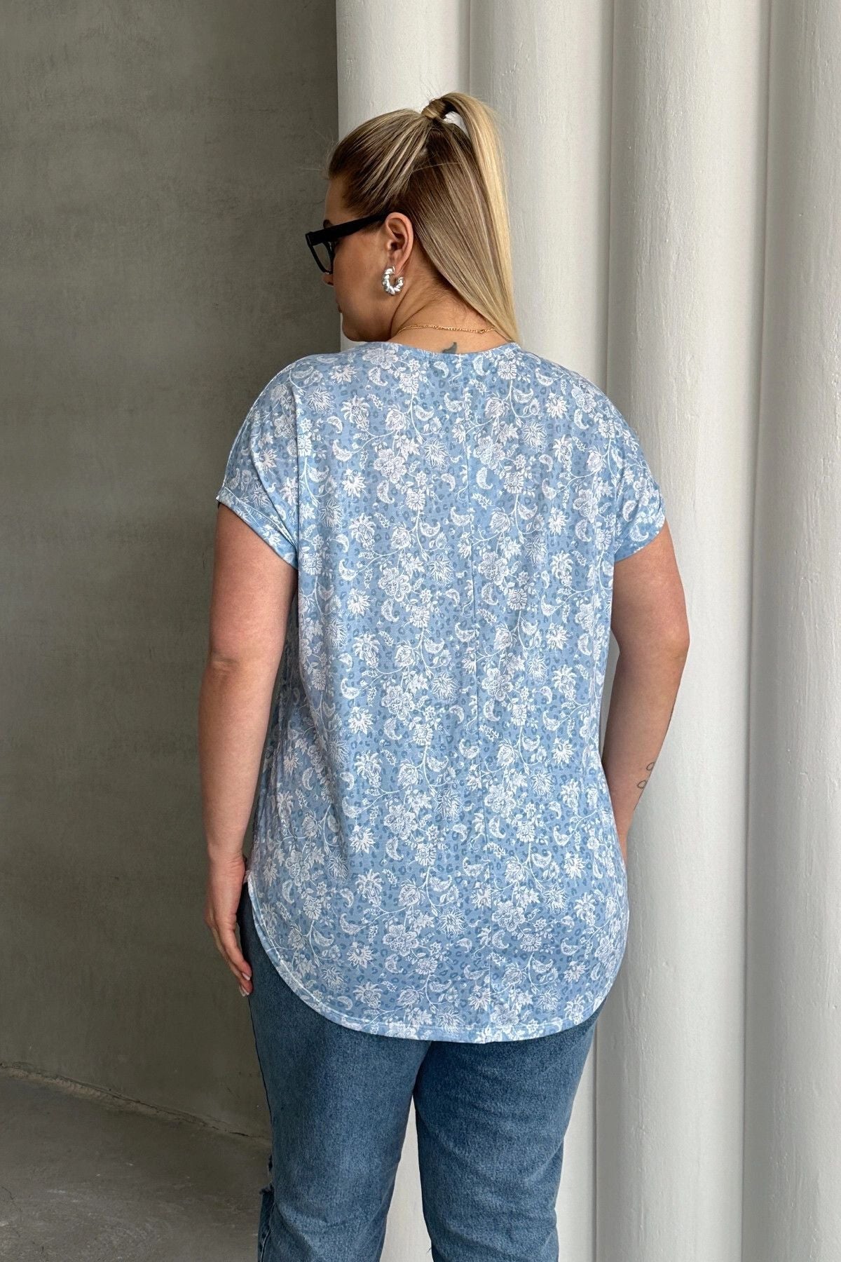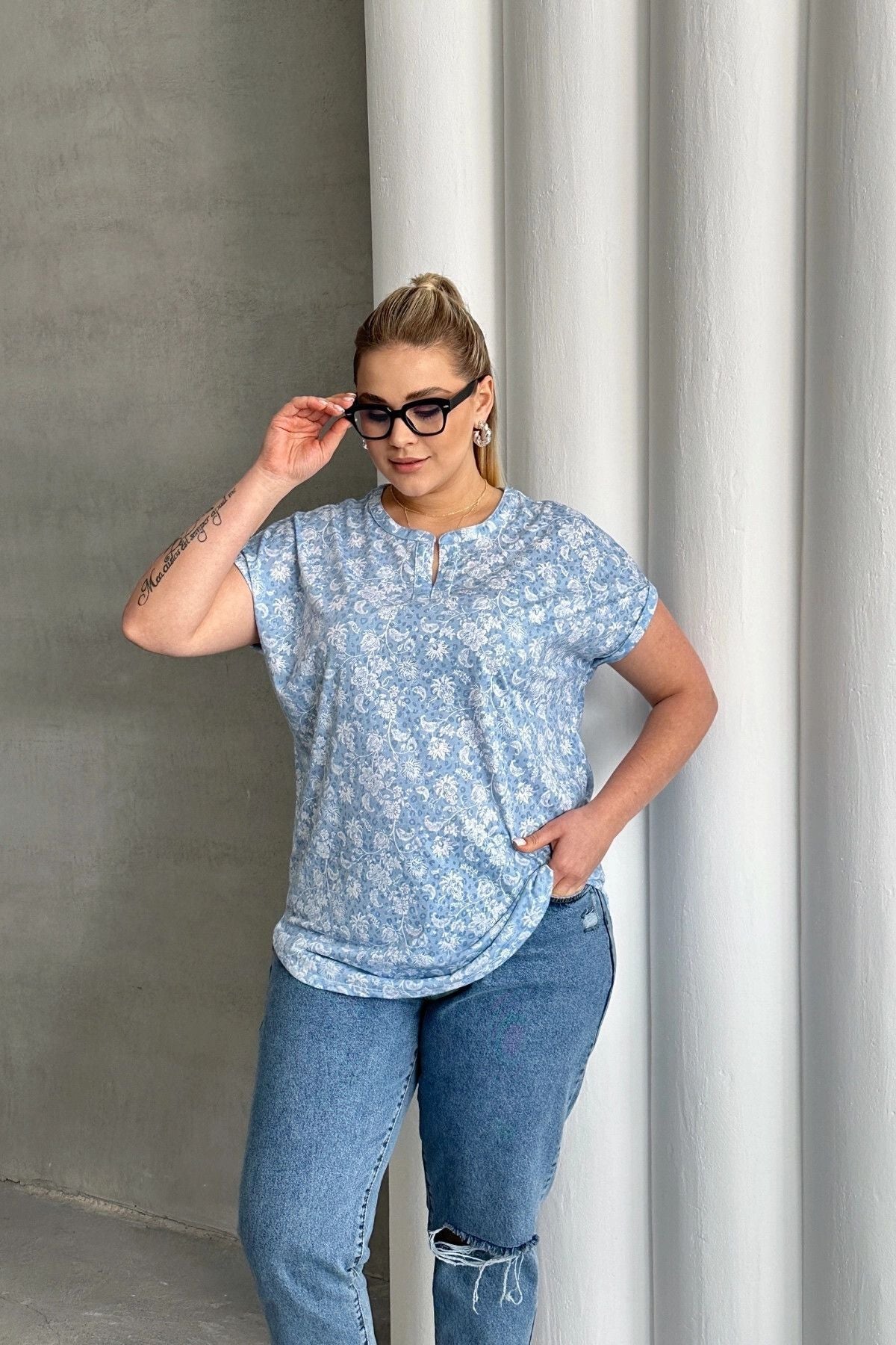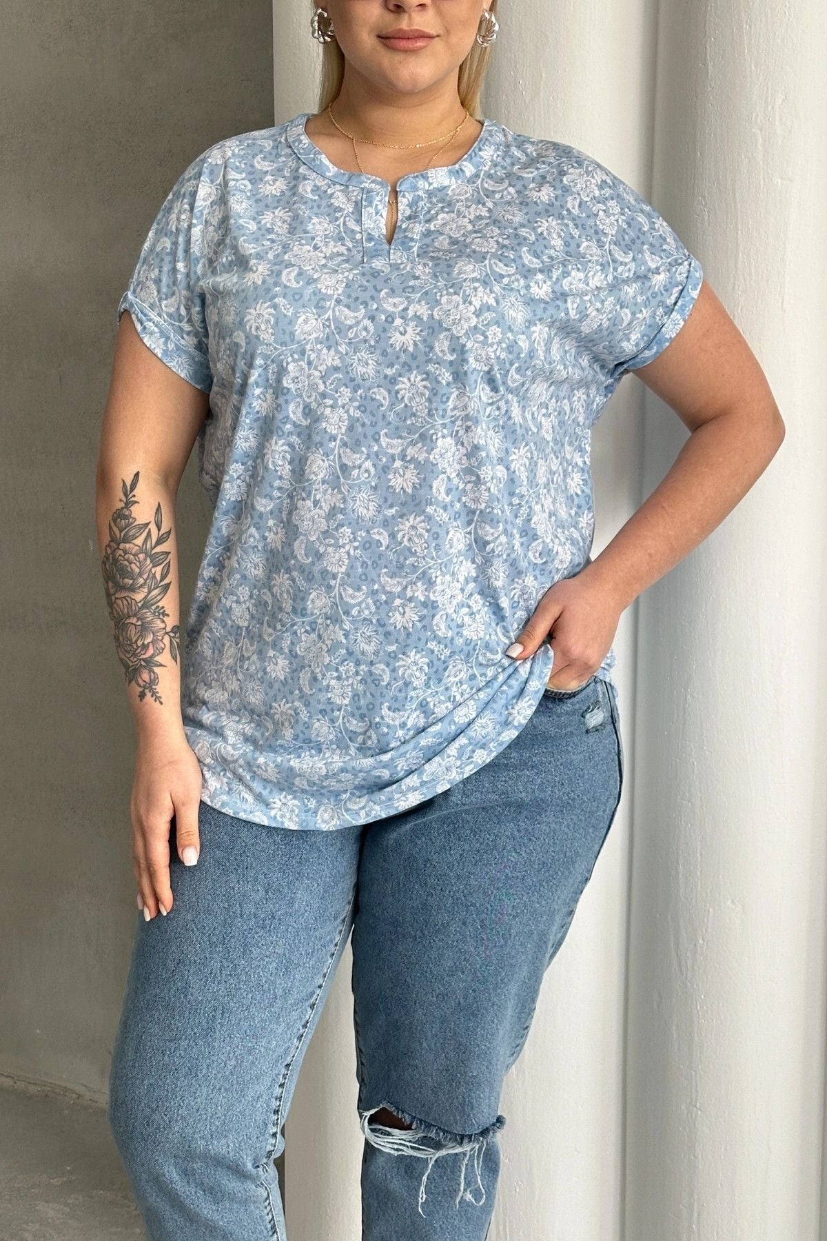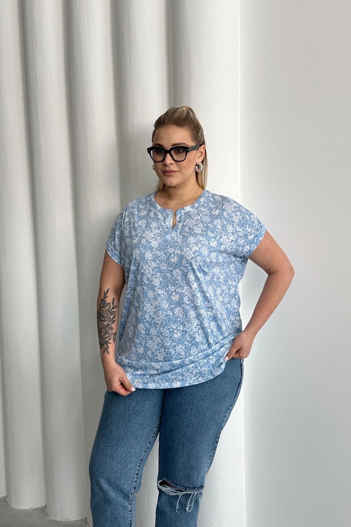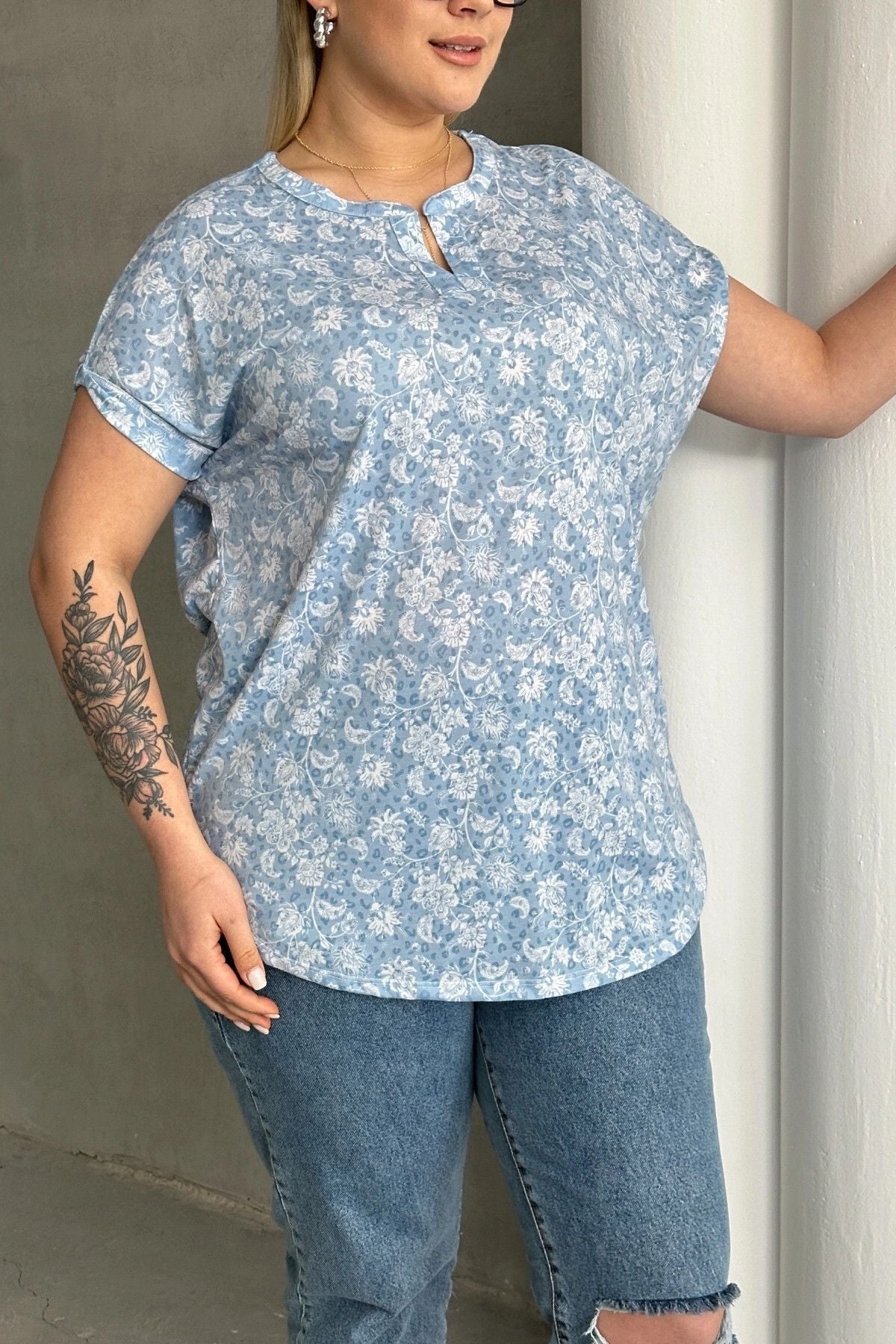 חולצה במידות גדולות שרוול קצר צווארון פתוח עם חריץ עם הדפס 97-79
