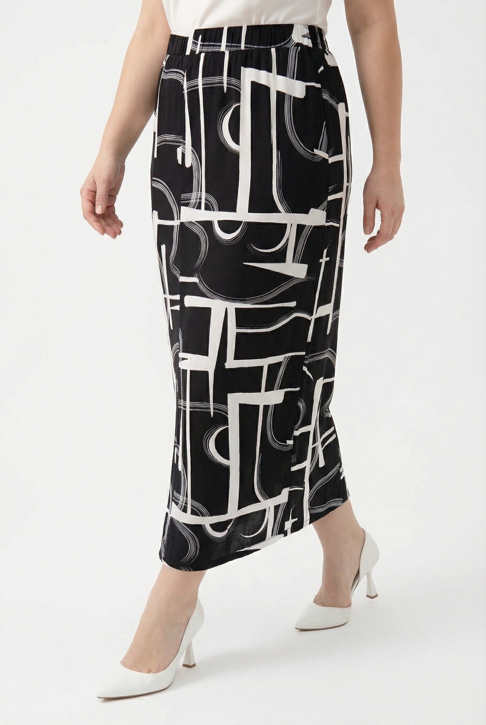 חצאית ארוכה במידות גדולות דוגמת אבסטרקט שסעים בצדדים
