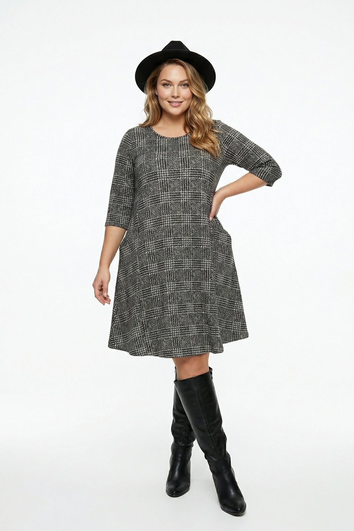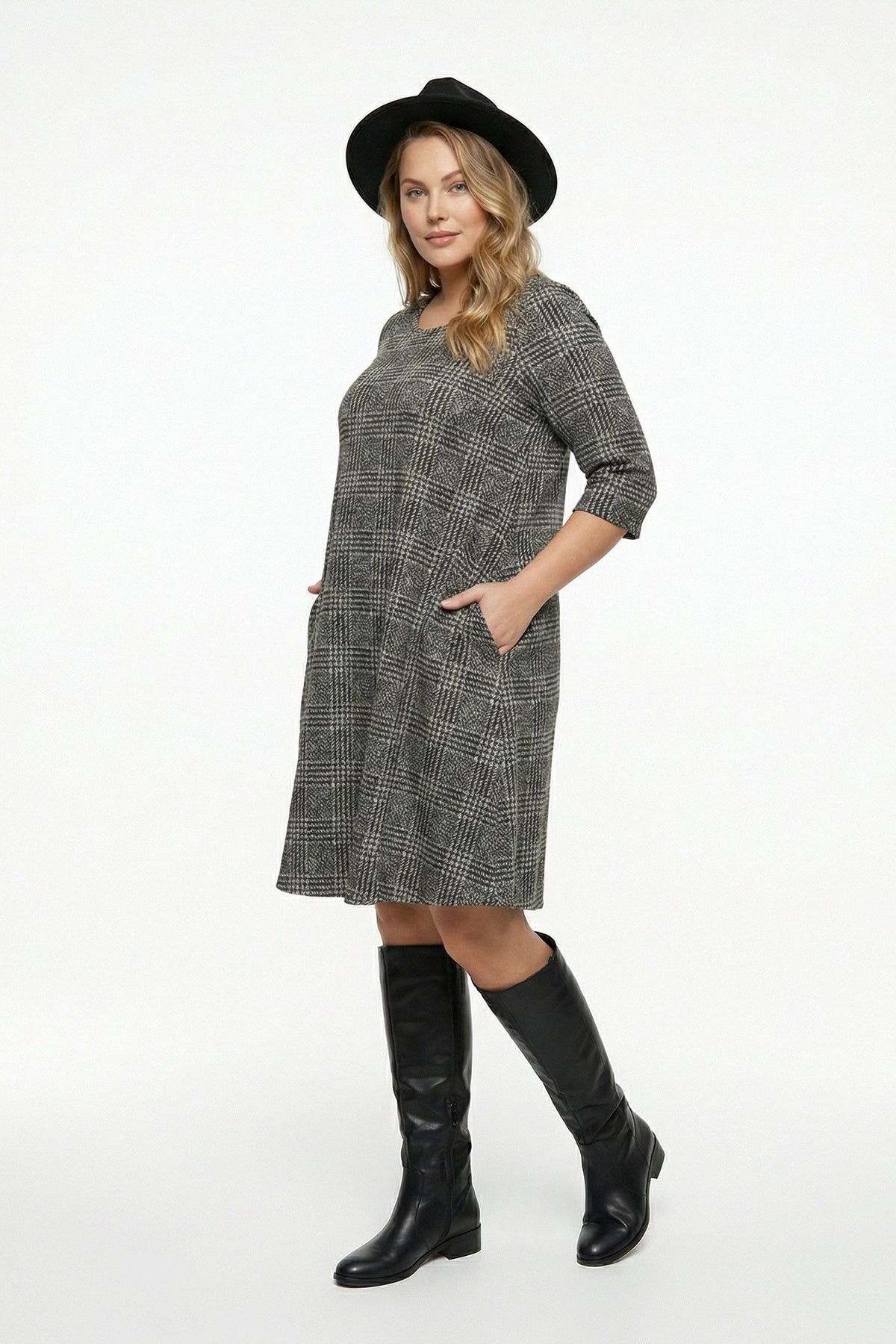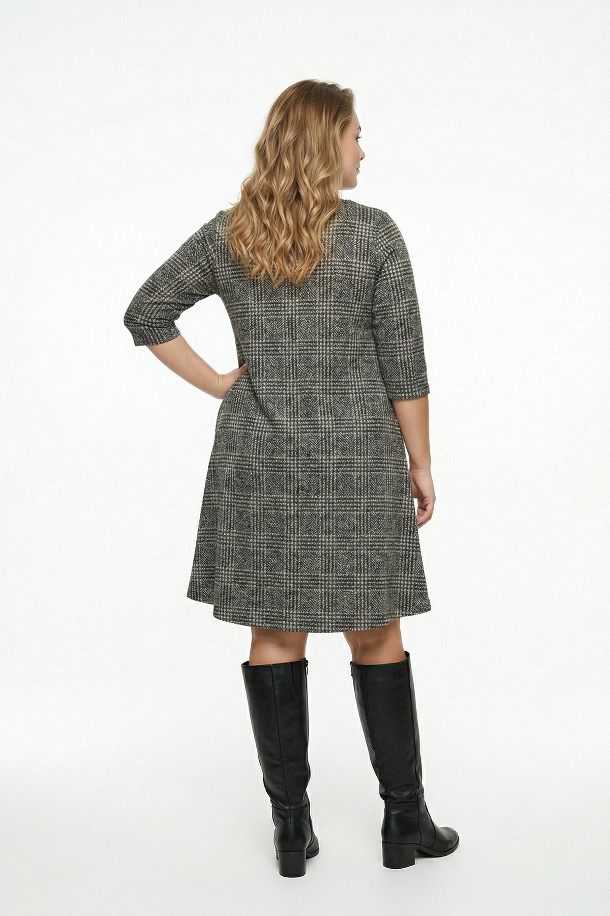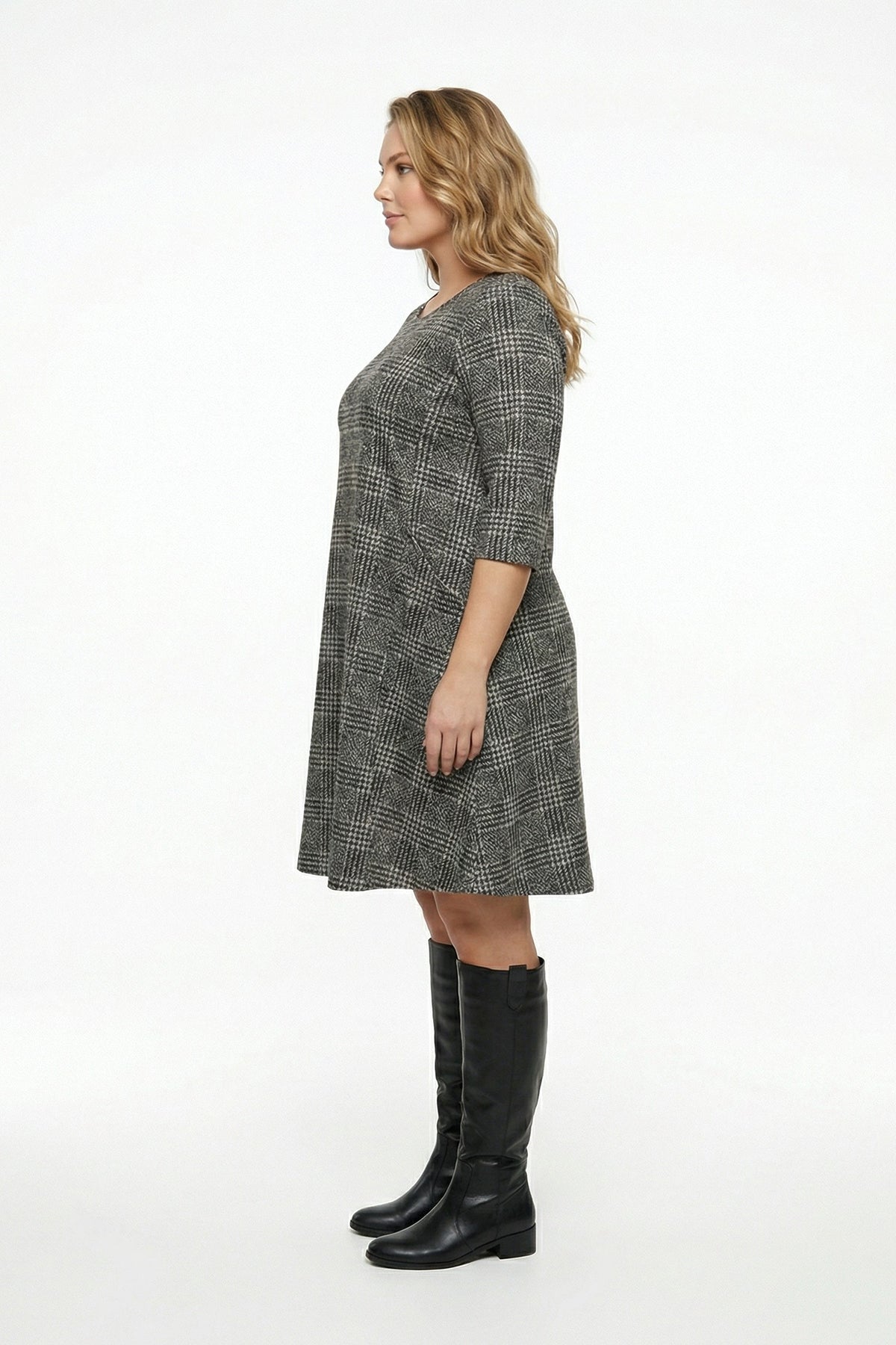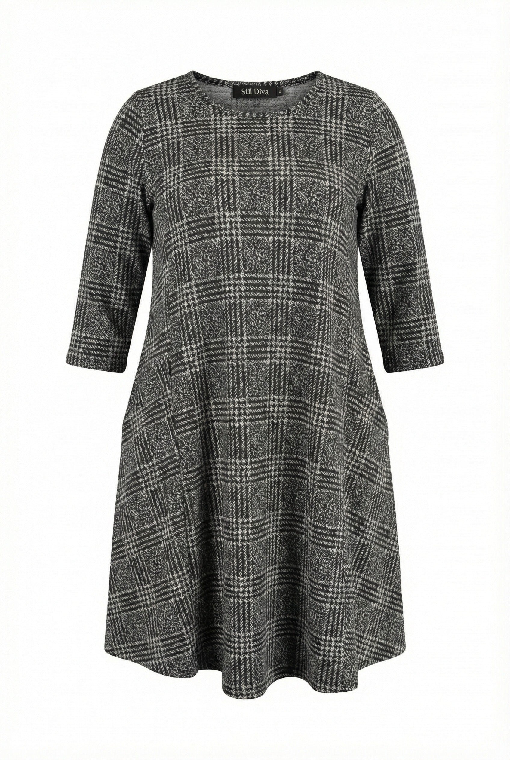 • פרטי הדגם: דוגמת משבצות, צווארון עגול, חצי שרוול, עם כיסים, גזרה אסימטרית
