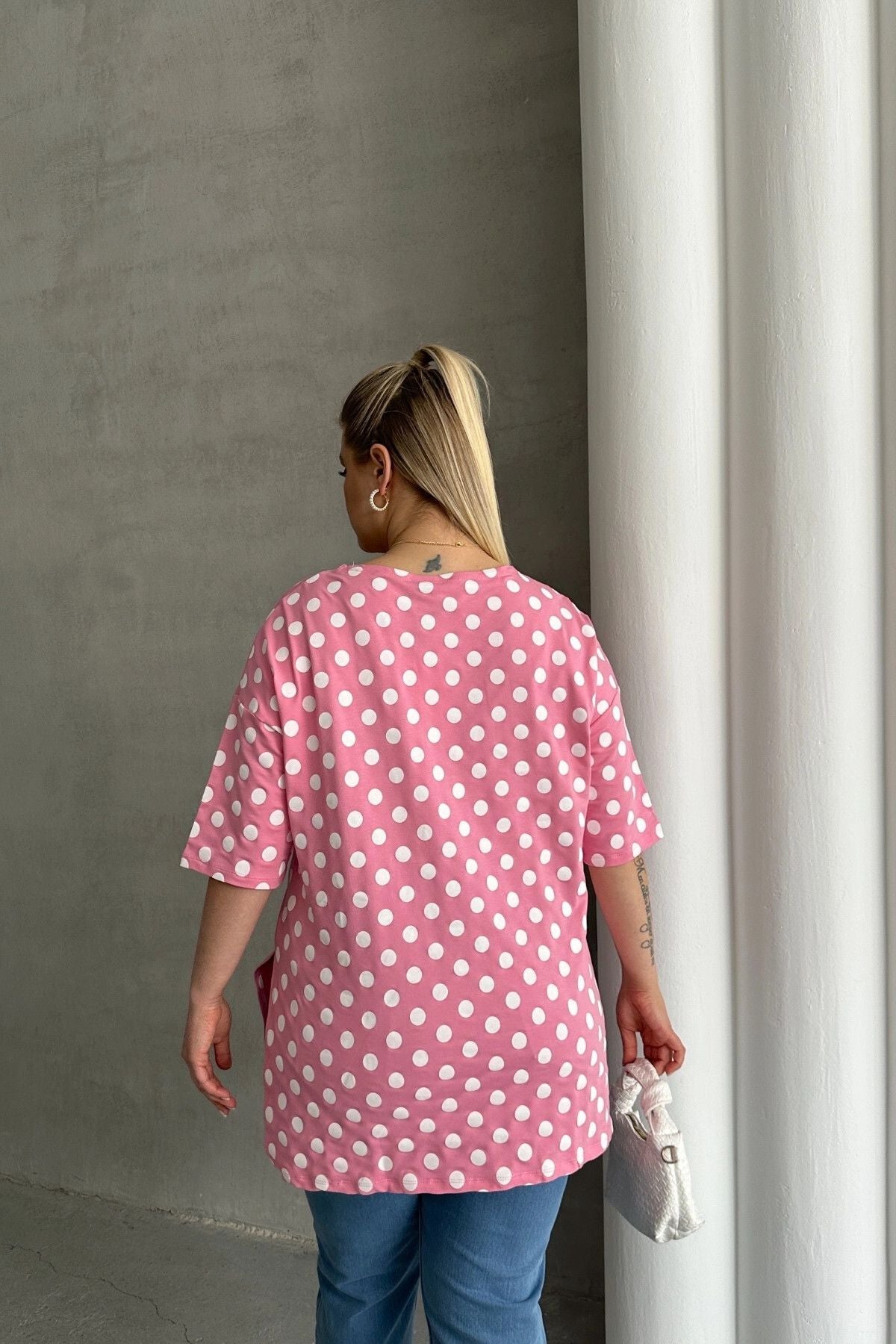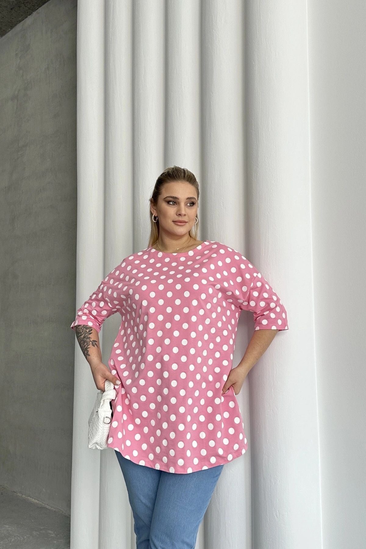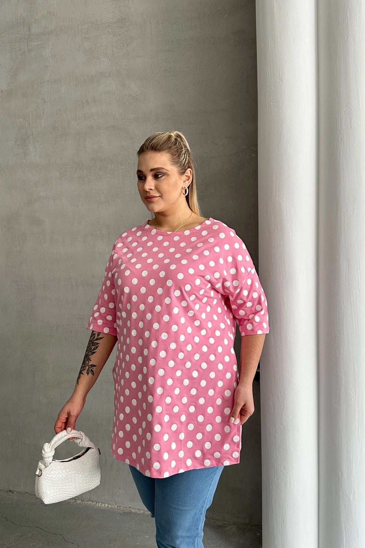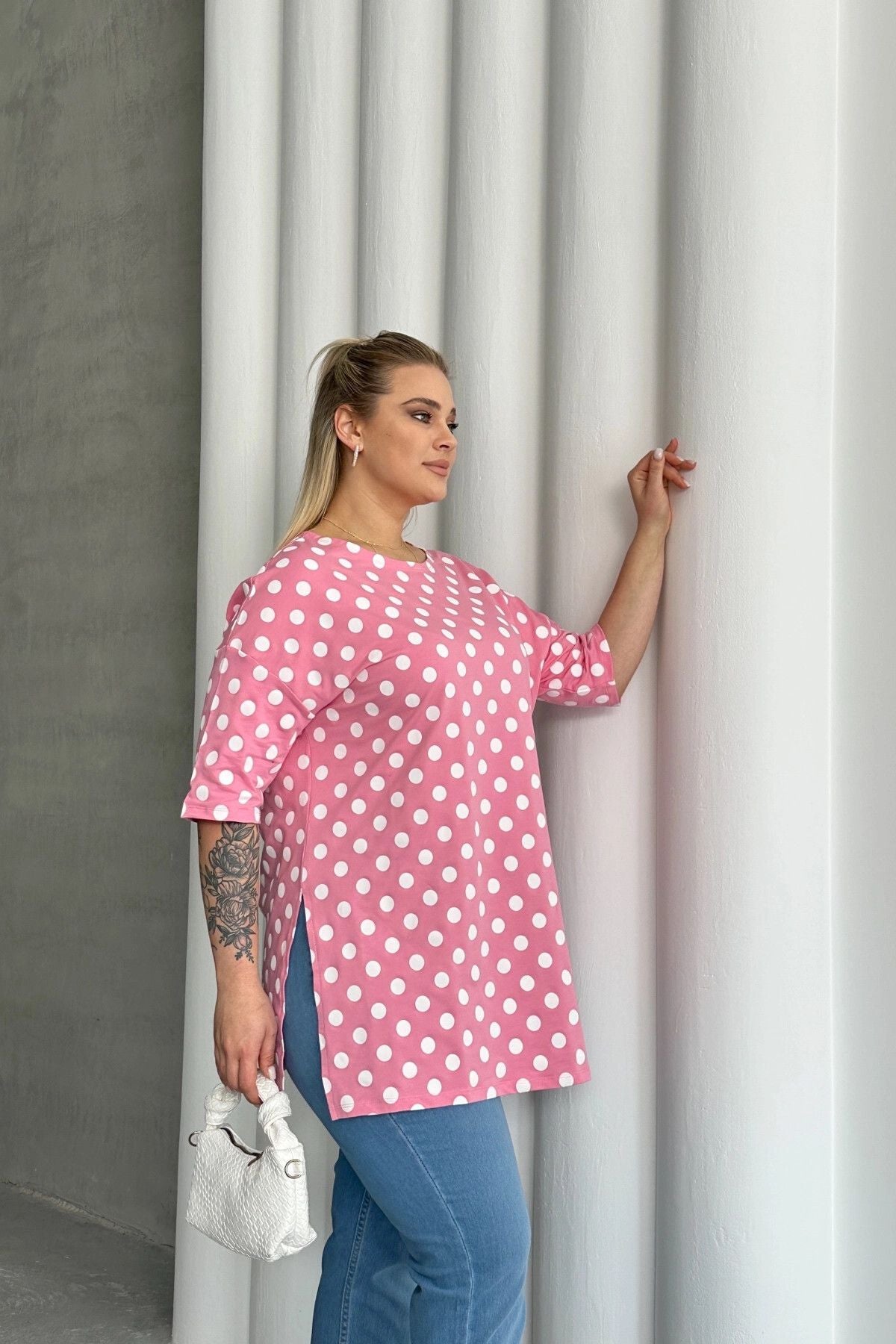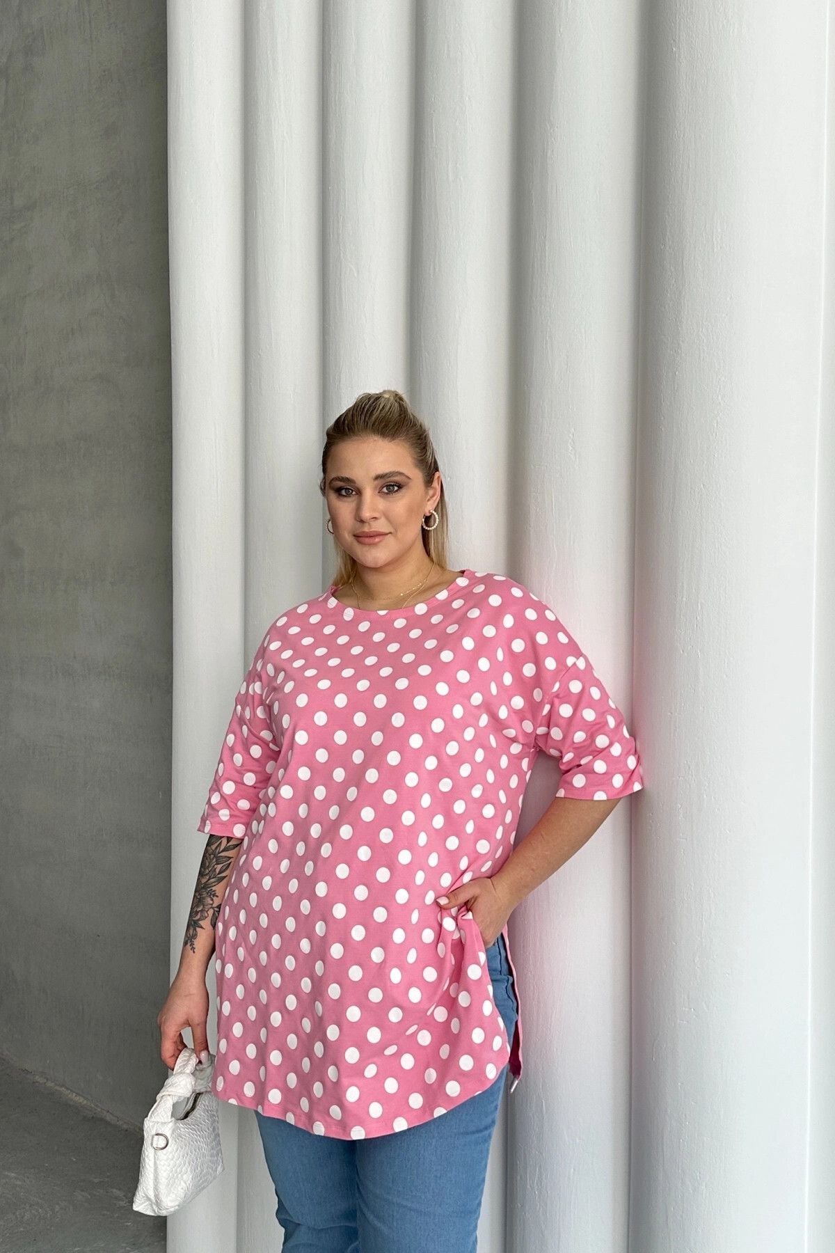 חולצה במידות גדולות שרוול קצר צווארון עגול שסעים בצדדים דוגמת נקודות 98-55