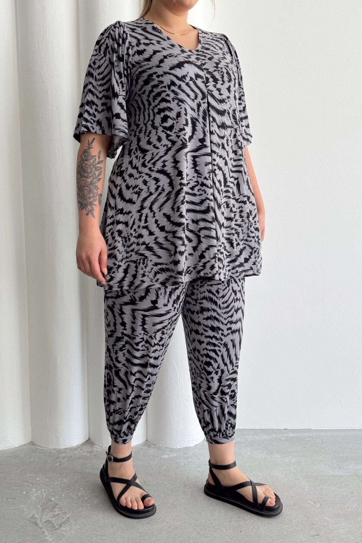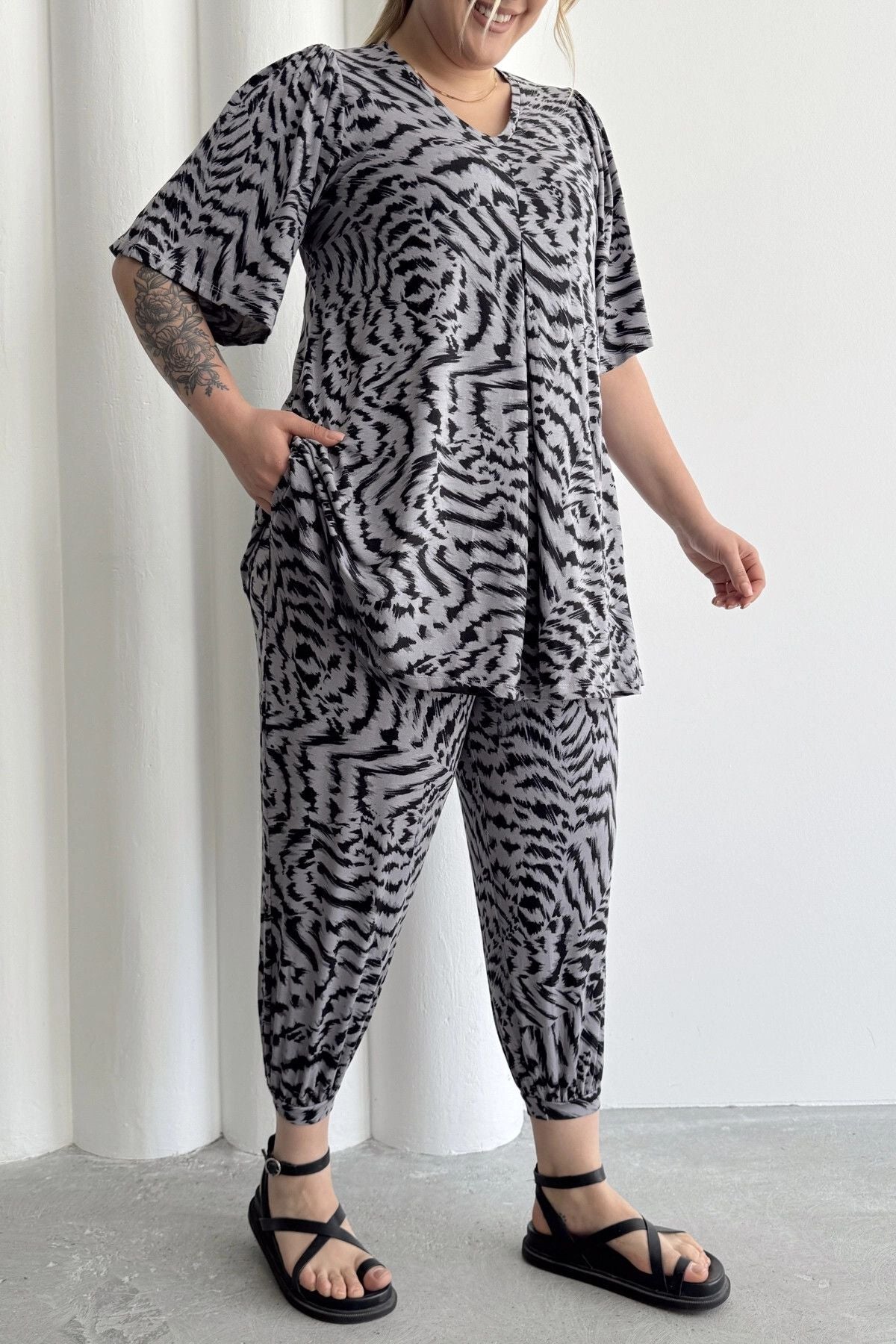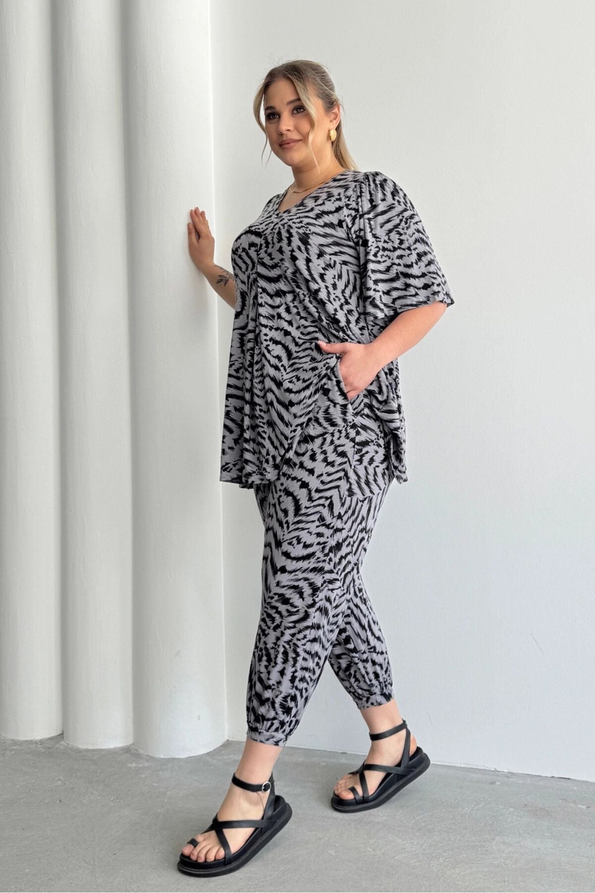 מכנסי שרוואל במידות גדולות גומי במותן גומי בשוליים עם כיסים דוגמת זברה 99-3