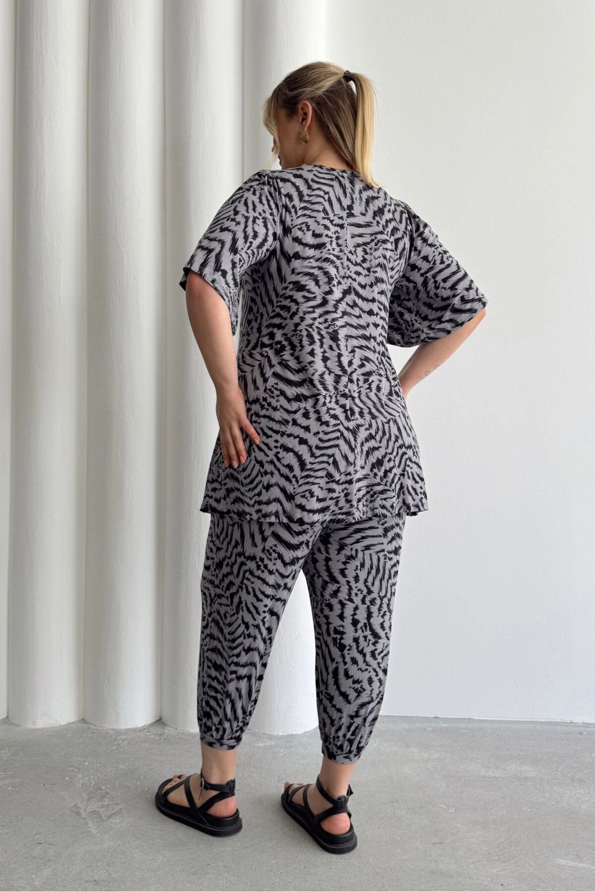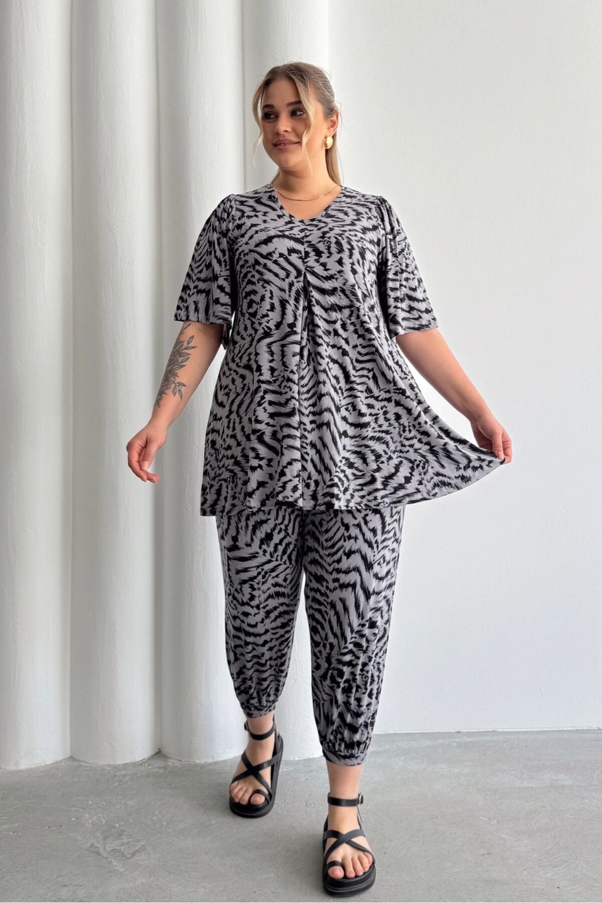 - פרטי הדגם: צווארון V, שרוול קצר, גזרה מתרחבת, עם הדפס זברה