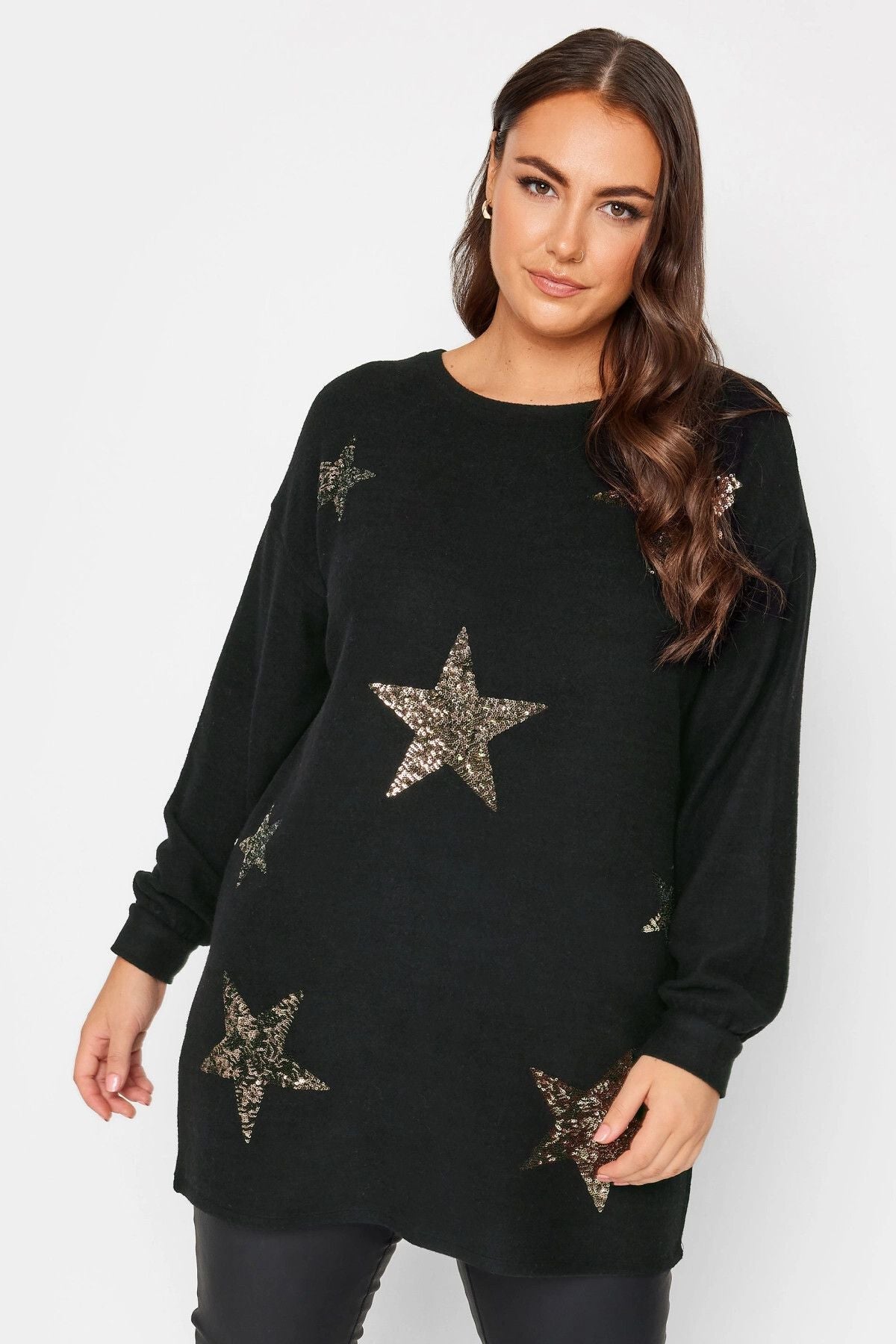 סוודר במידות גדולות צווארון עגול שרוול ארוך דוגמת כוכב מעוטר פאייטים 285019