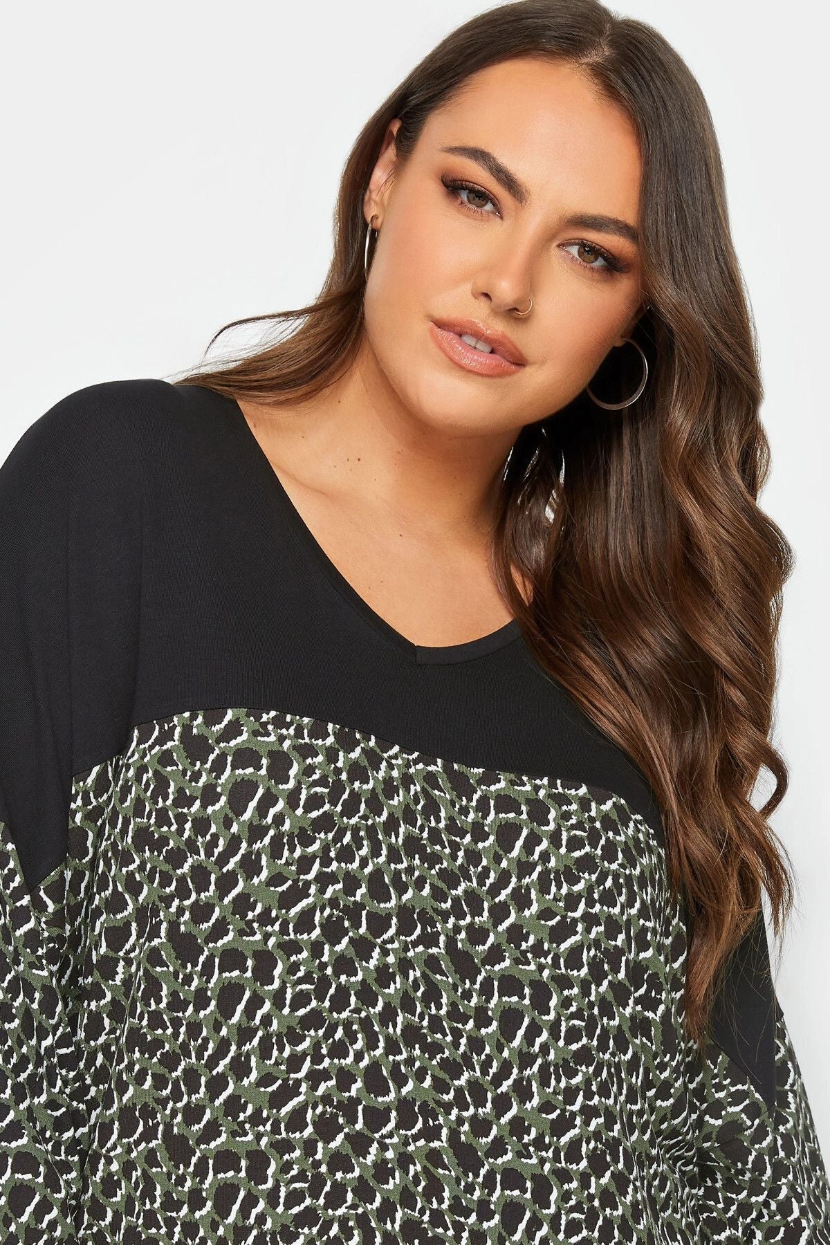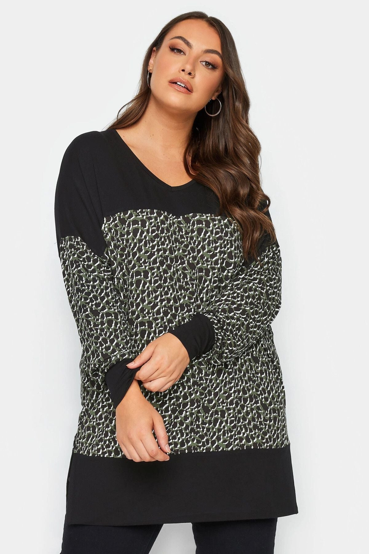 חולצה במידות גדולות דוגמת נמר בד גמיש שרוול ארוך חיתוך ארוך 302498