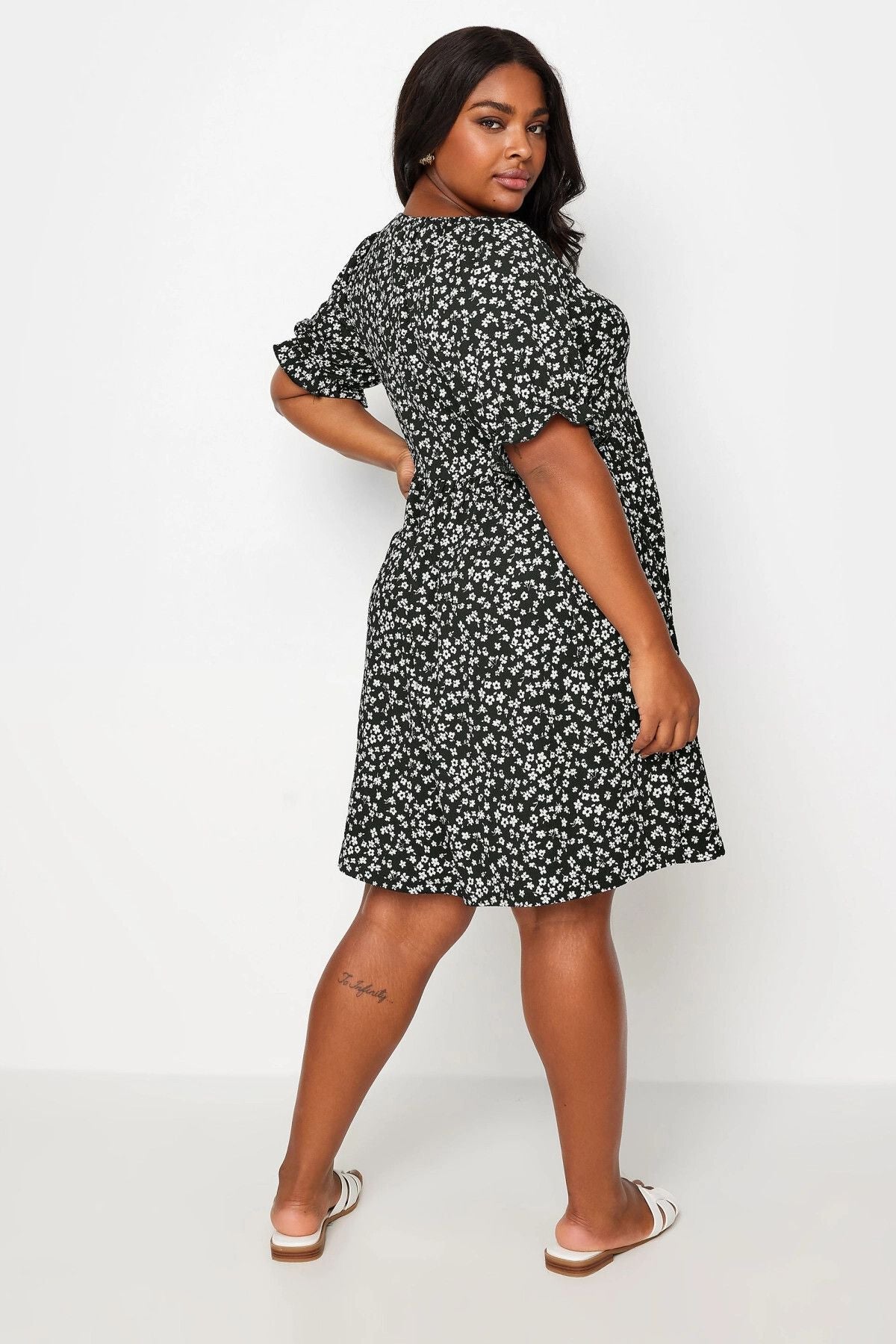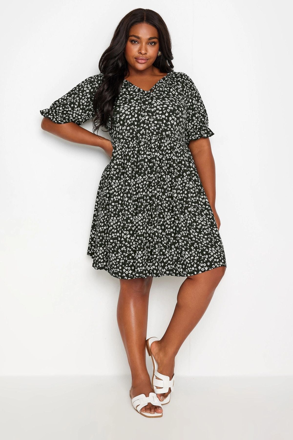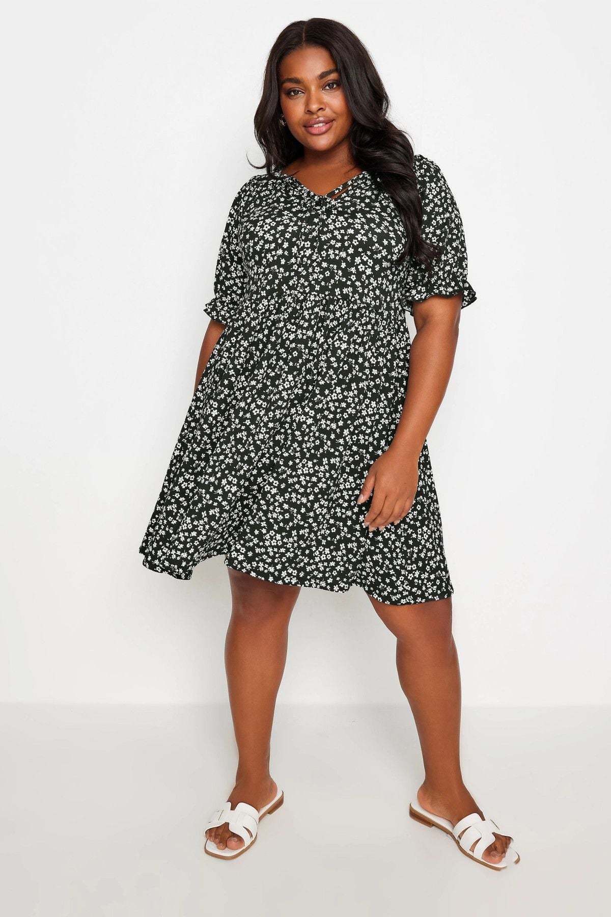 שמלה במידות גדולות פרטי קשירה שרוולים עם רפלס דוגמת פרחים 303149
