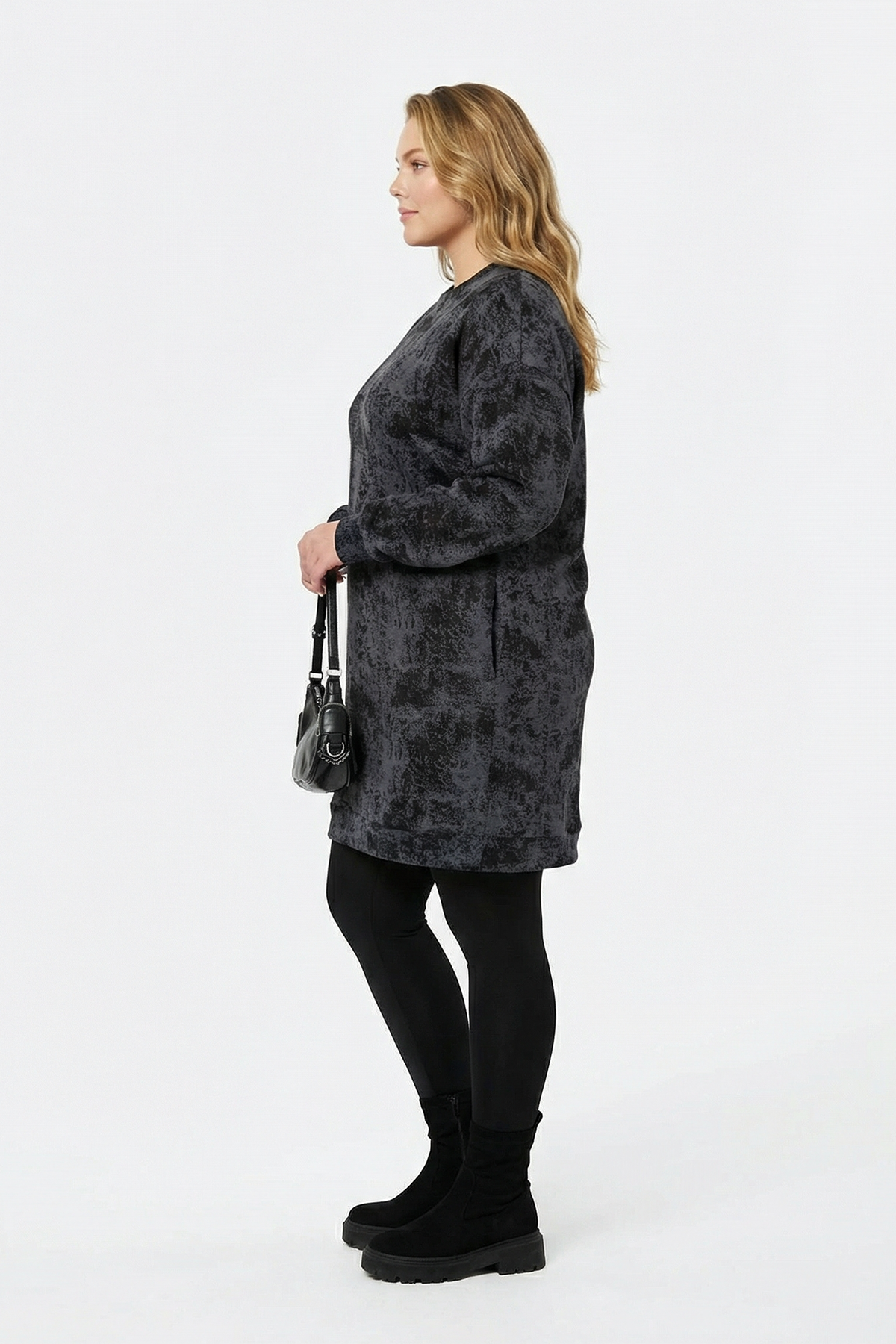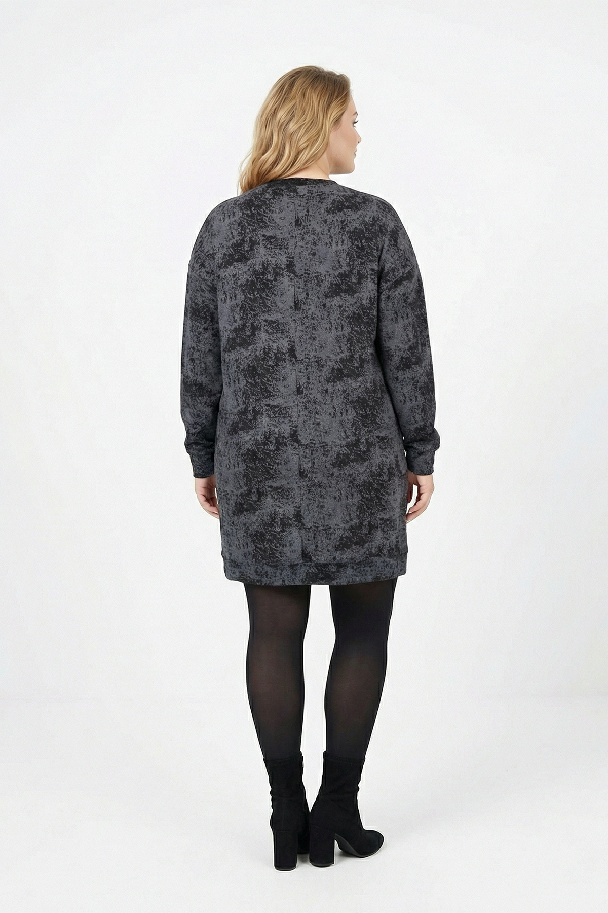 - פרטי הדגם: שרוול ארוך, צווארון עגול, עם כיסים, עם הדפס