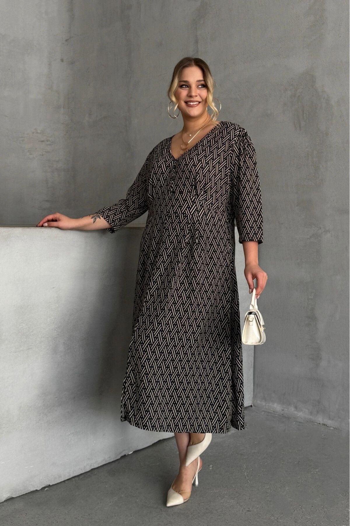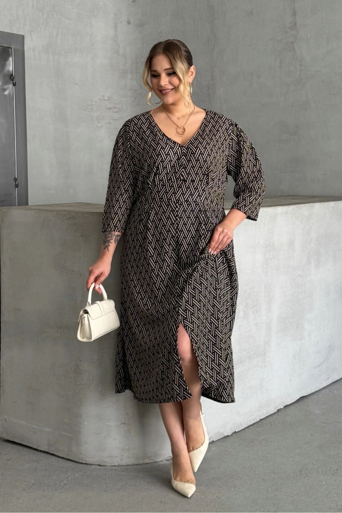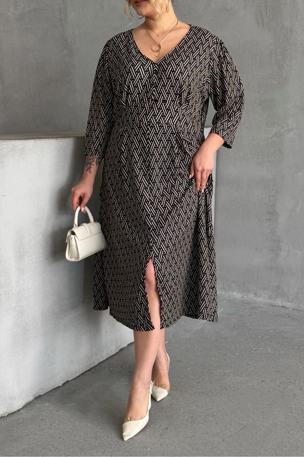 שמלה במידות גדולות צווארון V שסעים בצדדים עם הדפס שרוול 3/4 מידי MSD-25123