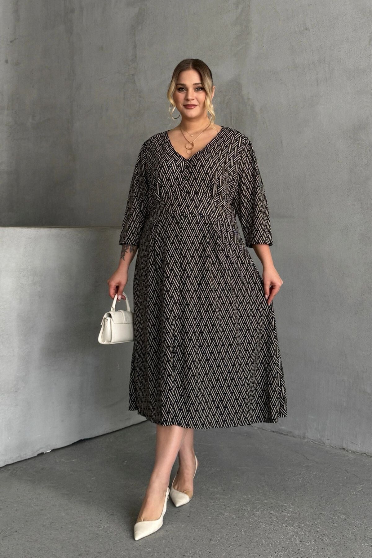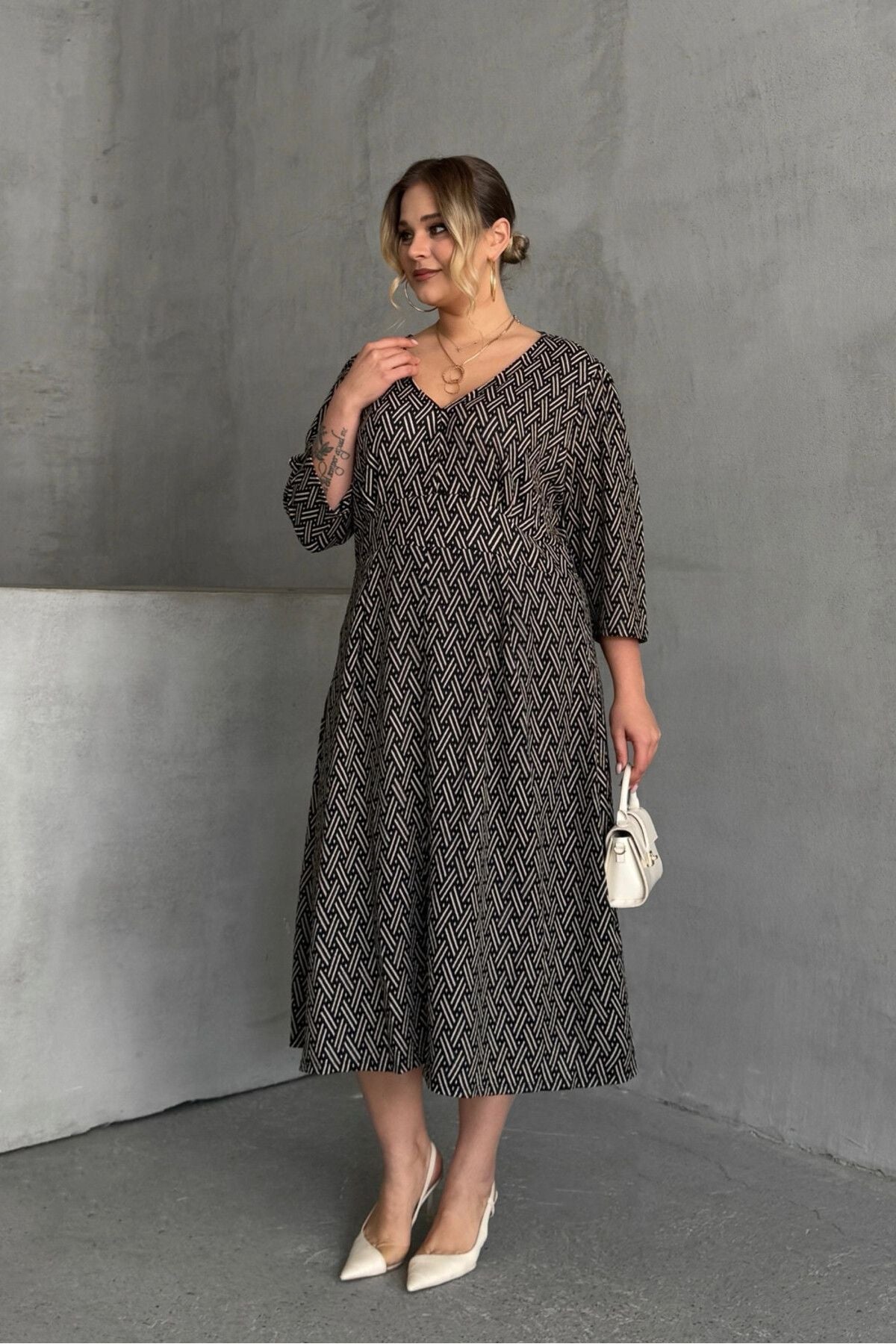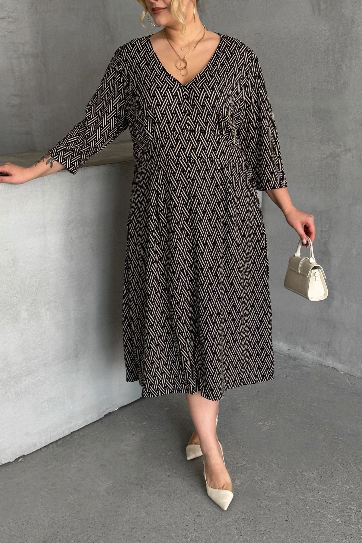 שמלה במידות גדולות צווארון V שסעים בצדדים עם הדפס שרוול 3/4 מידי MSD-25123