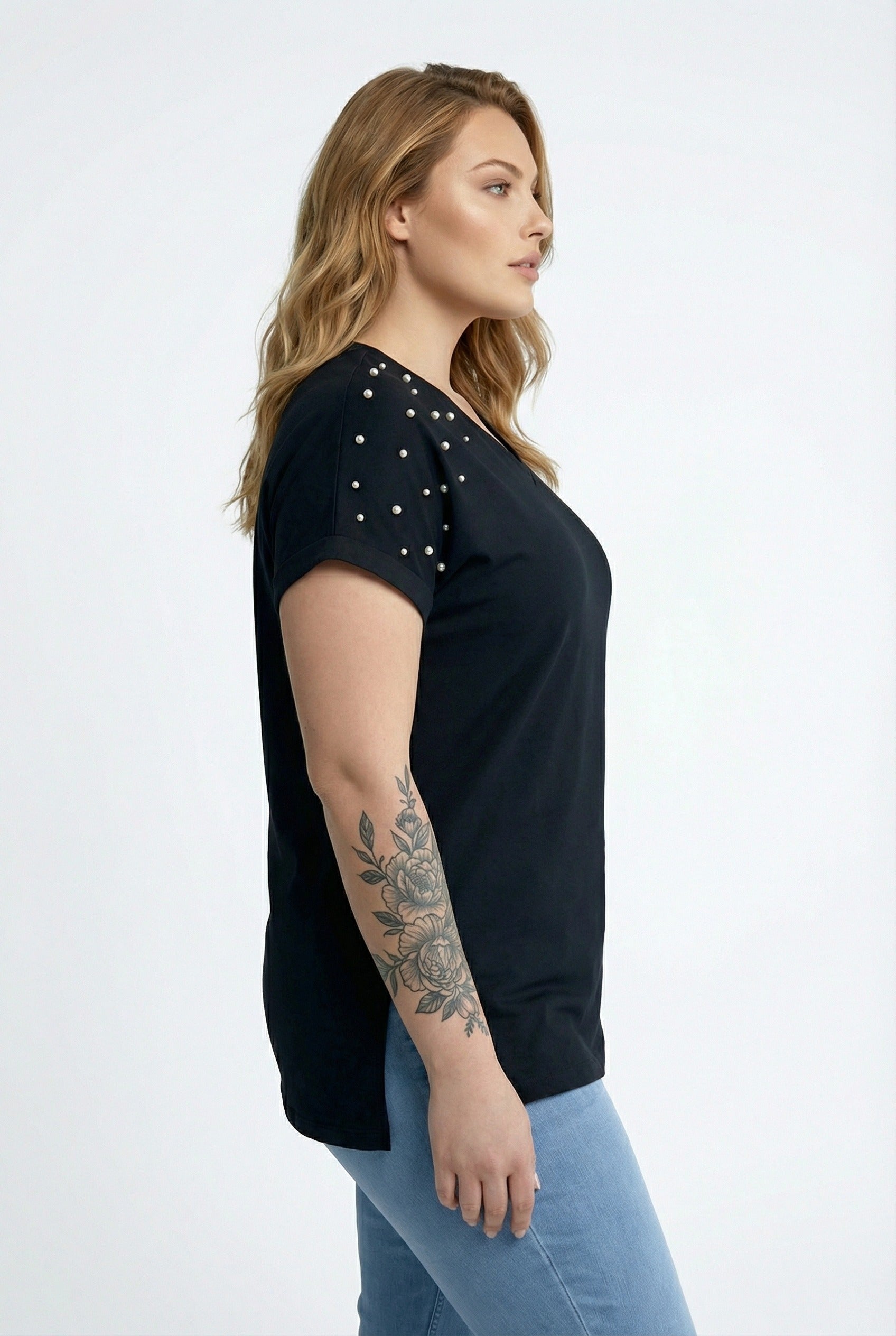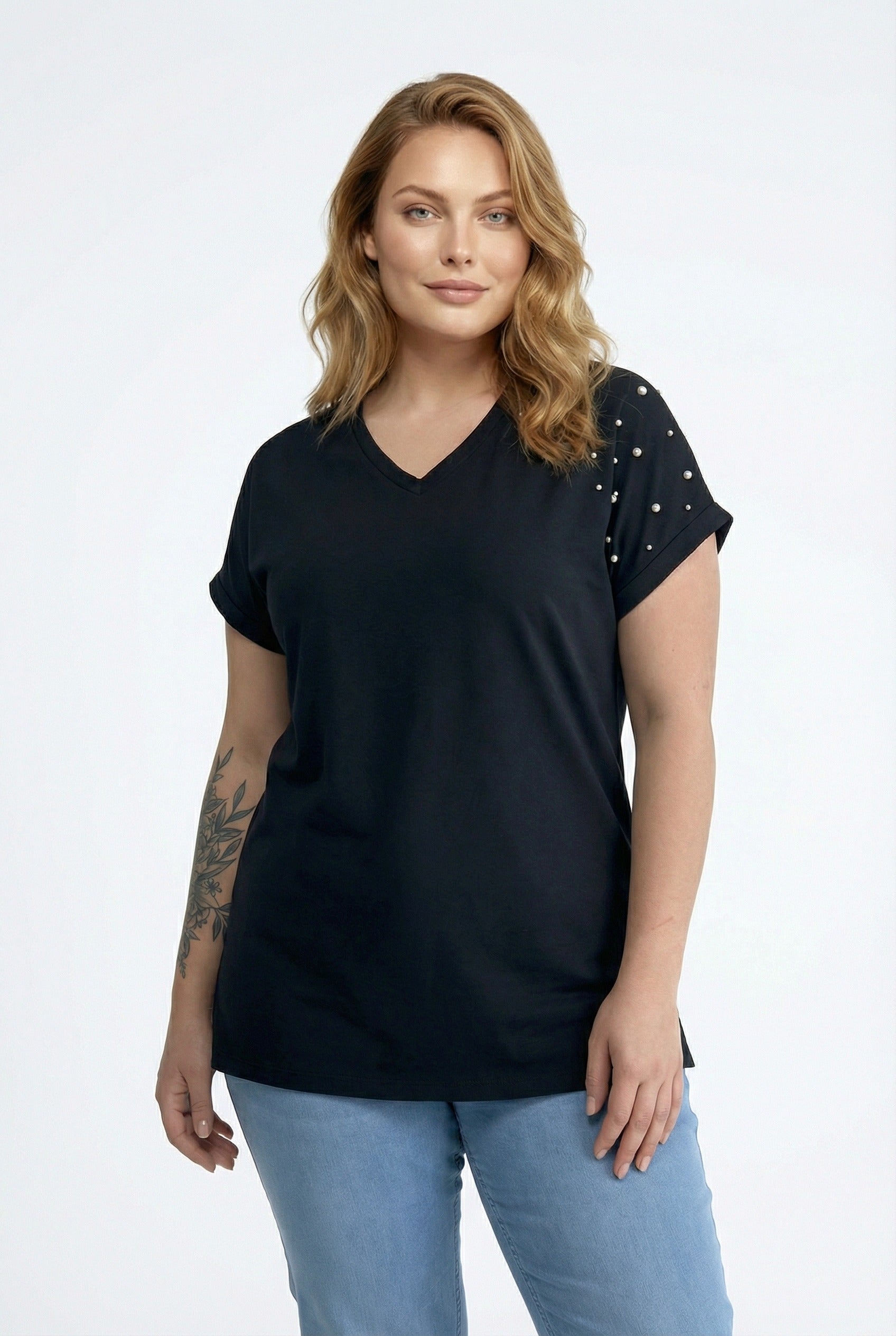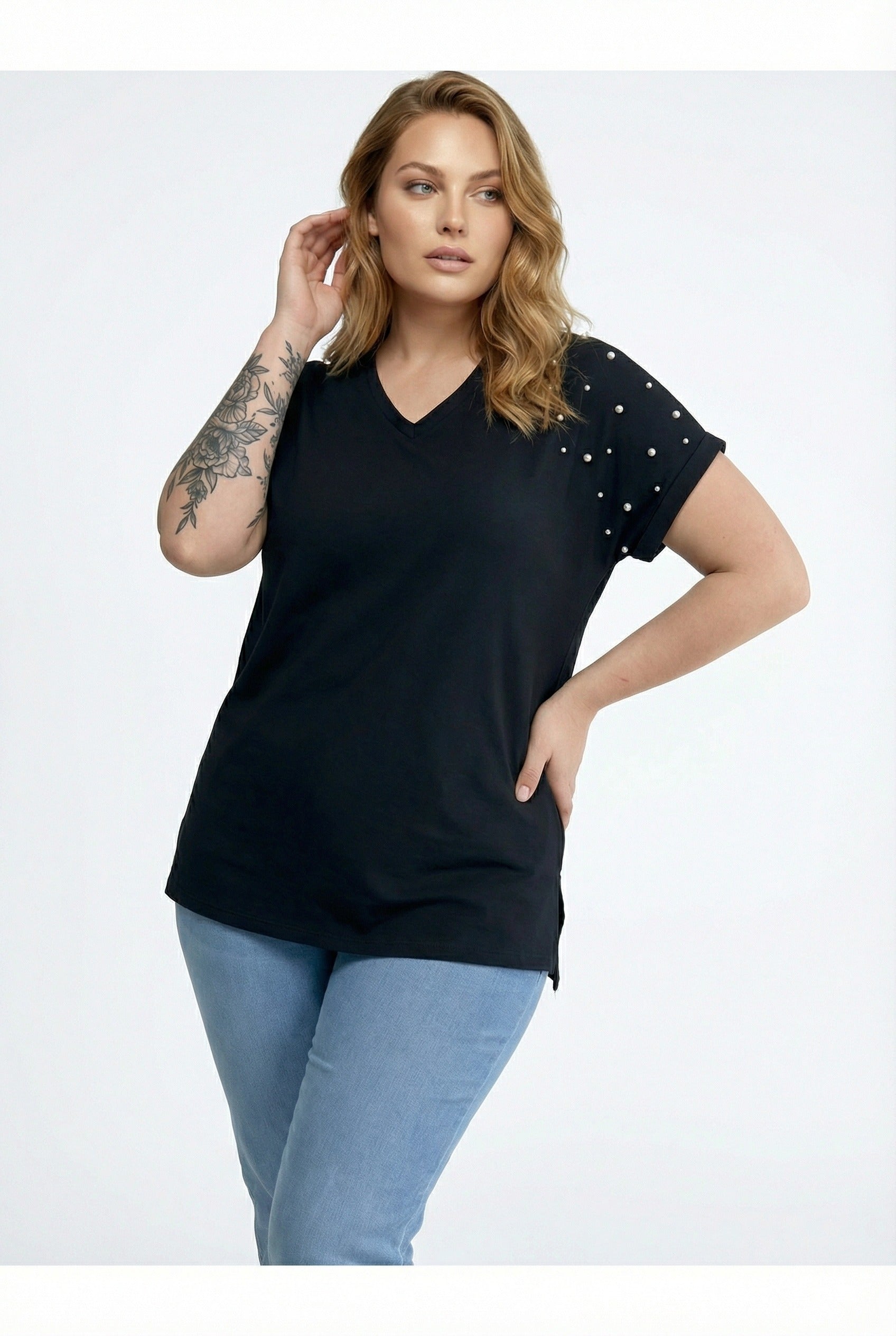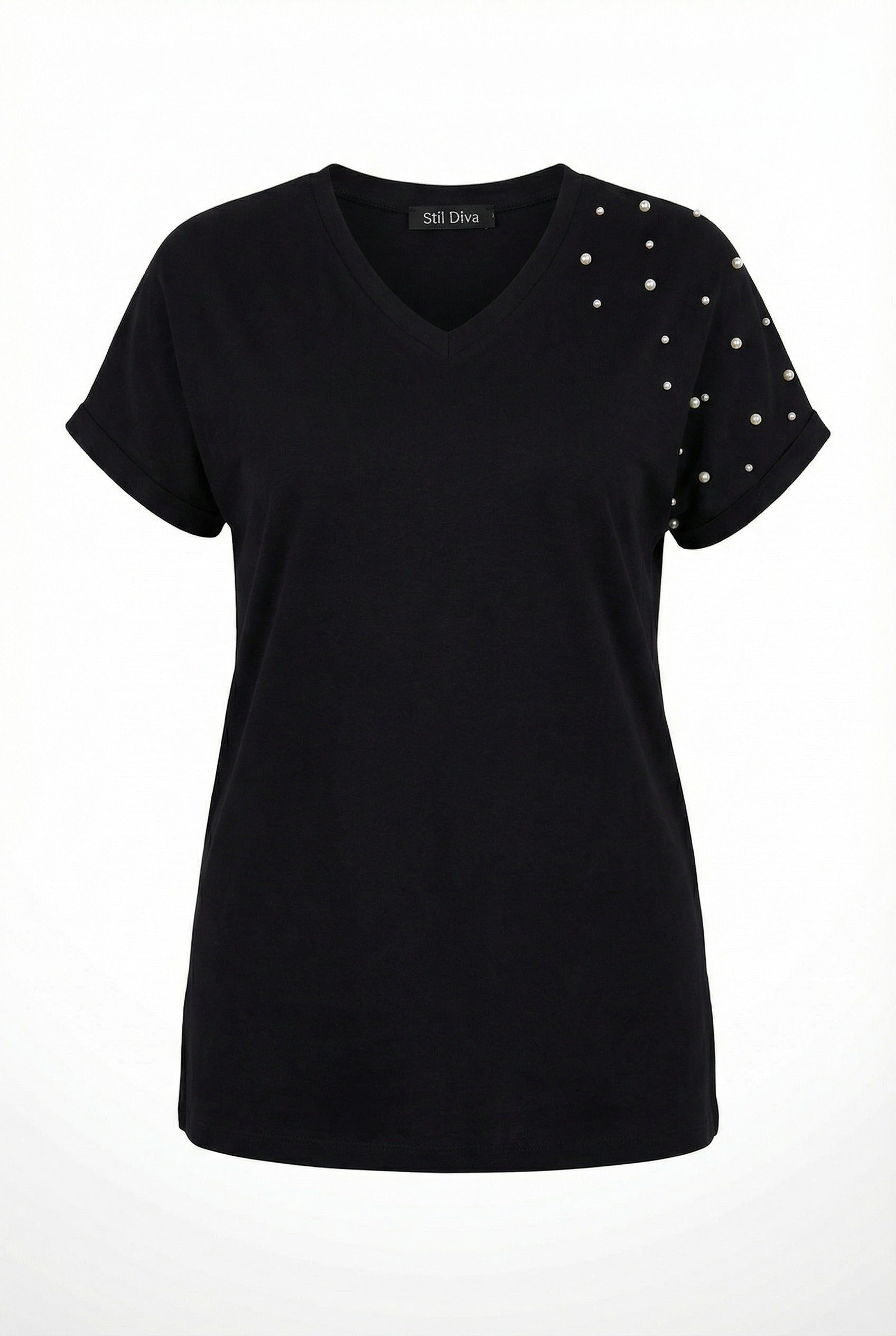 - תיאור מוצר: הטישירט הבסיסית עם צווארון וי משלבת אלגנטיות עם פרטי אבנים עדינים. השסעים בצדדים מעניקים נגיעה מודרנית, ובד הכותנה המעורב מספק נוחות לאורך כל היום. היכולת לכבס במכונה מספקת שימושיות גבוהה. ניתן לשלב עם ג'ינס למראה ספורטיבי או עם מכנסי בד למראה אלגנטי.