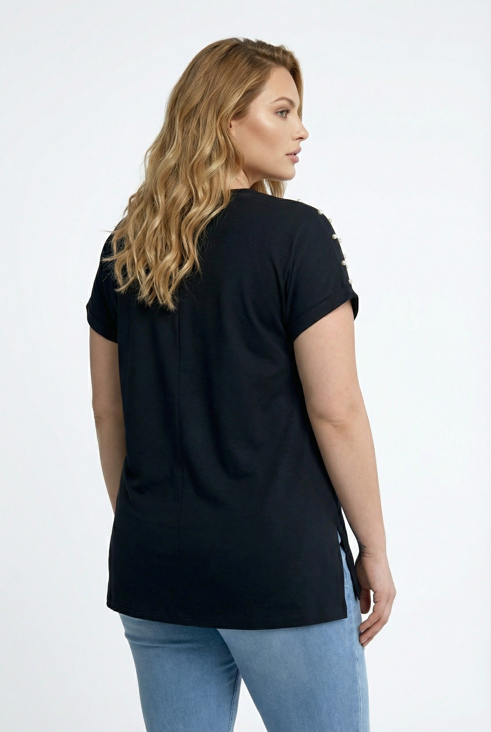 - פרטי הדגם: שרוול קצר, צווארון וי, שסעים בצדדים, מעוטרת באבנים