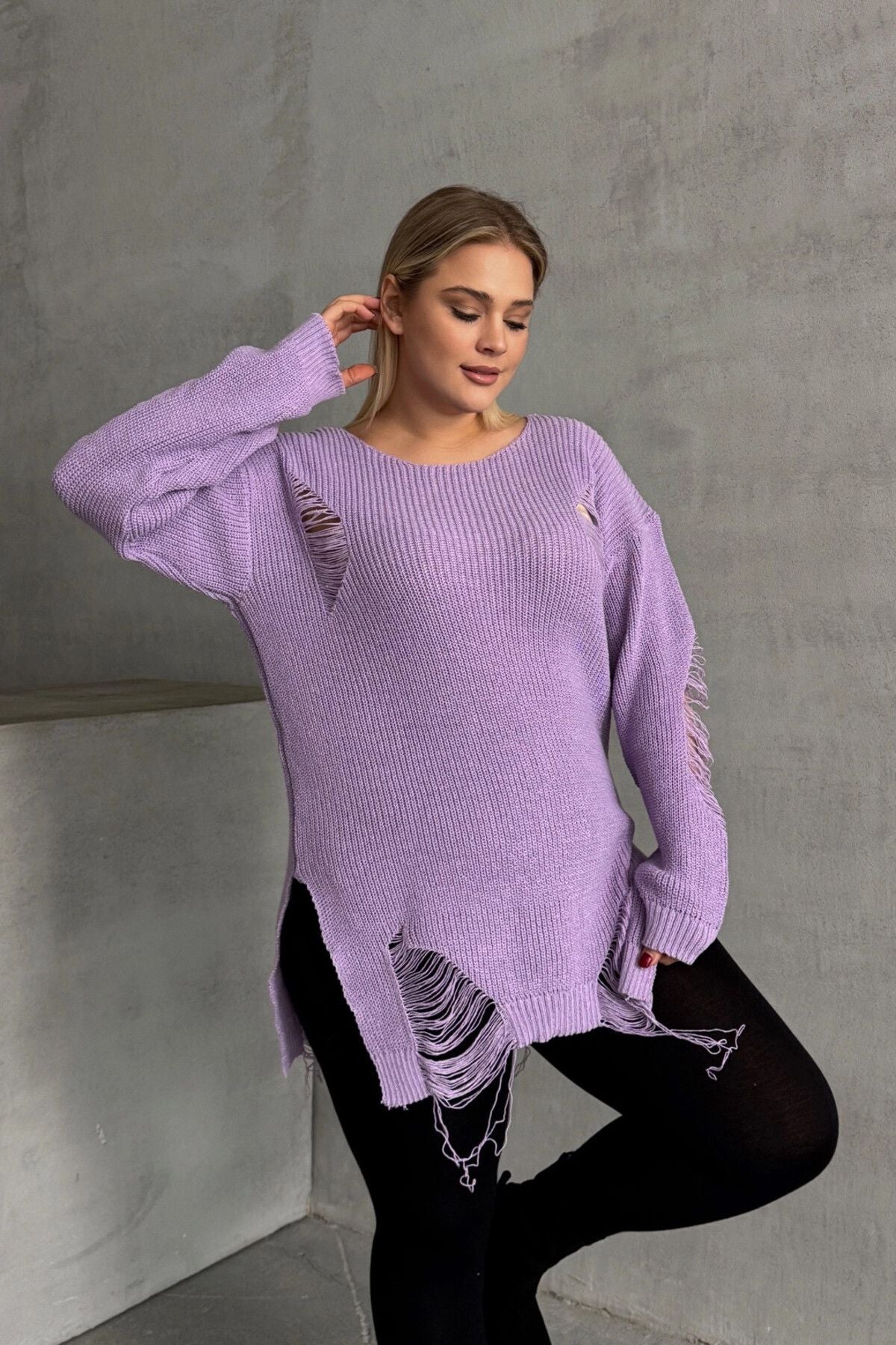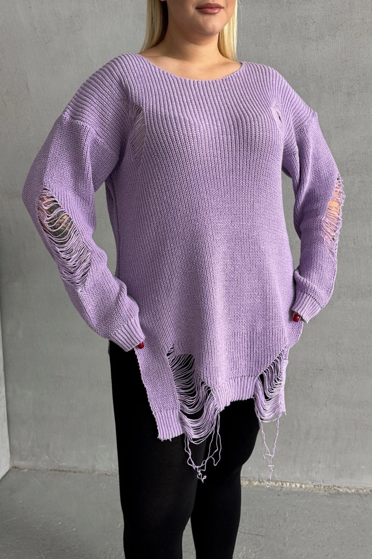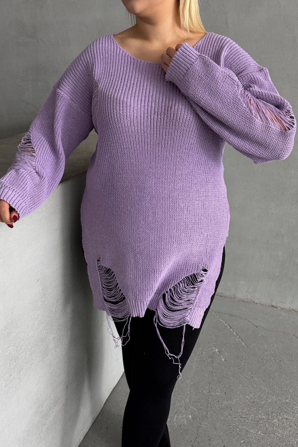 סוודר במידות גדולות שרוול ארוך צווארון עגול פרטי קרעים T-3