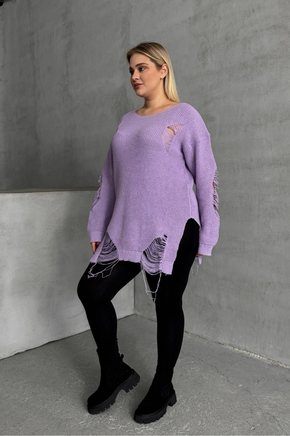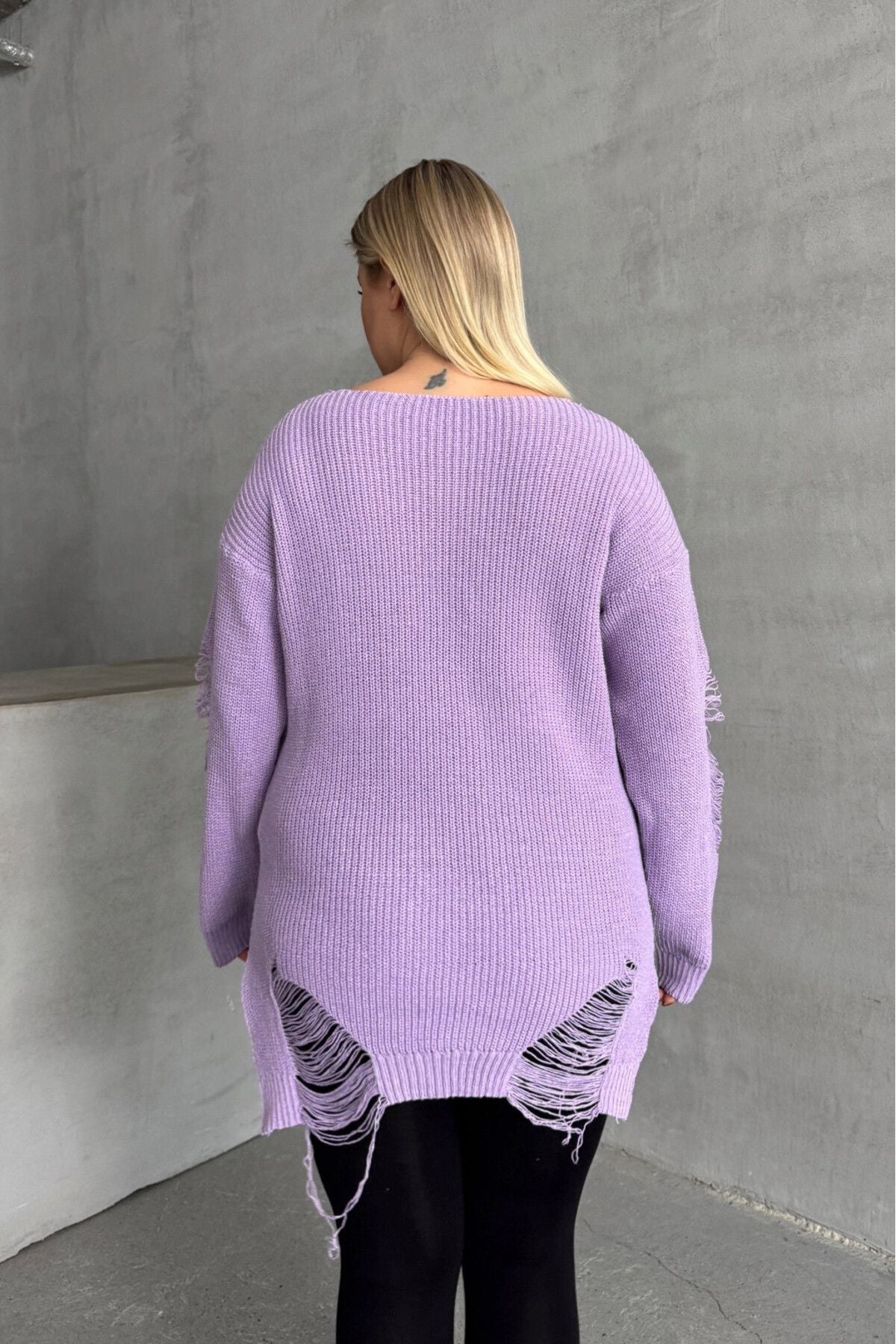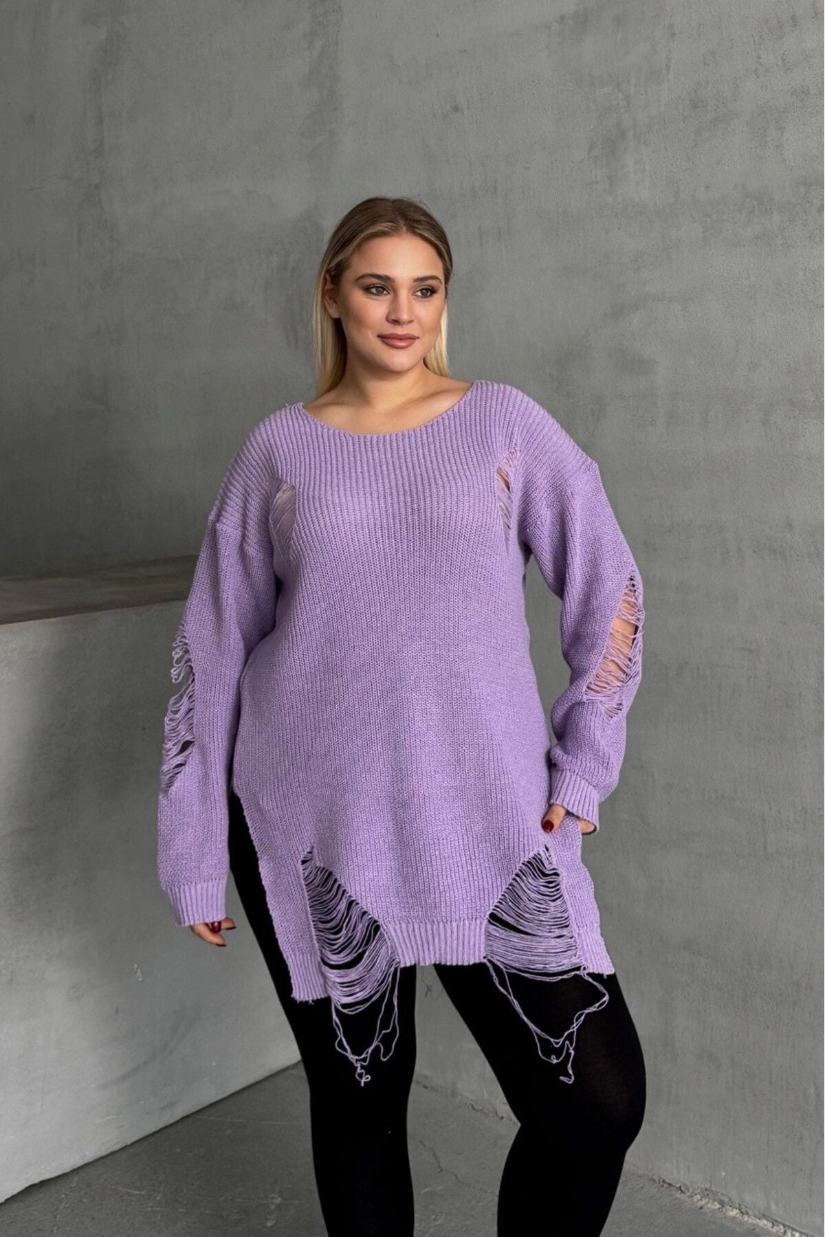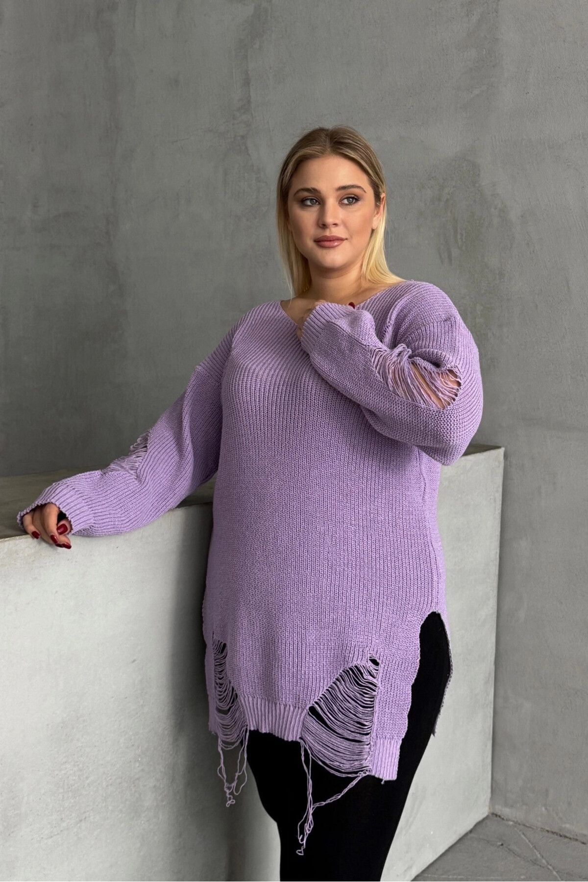 סוודר במידות גדולות שרוול ארוך צווארון עגול פרטי קרעים T-3