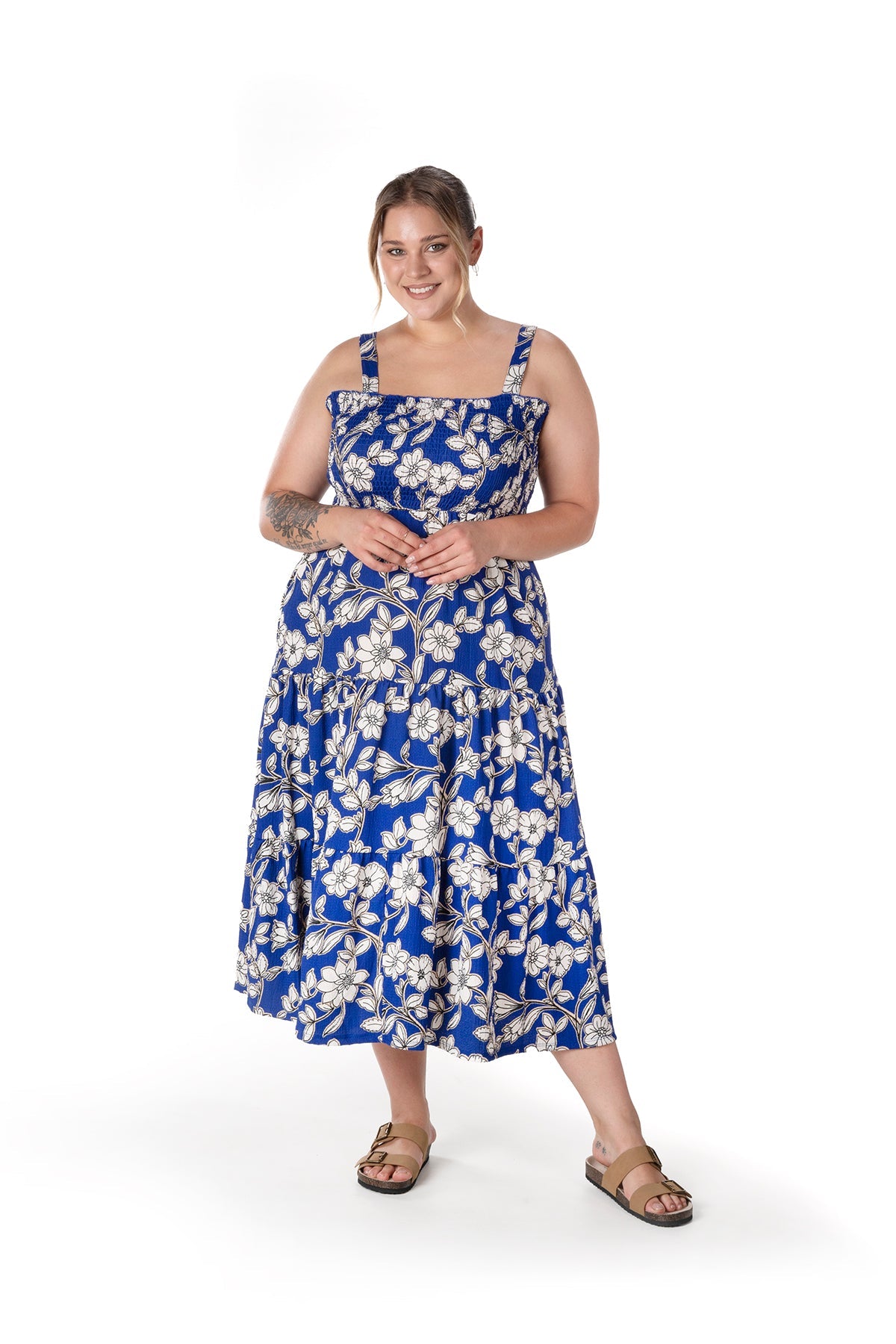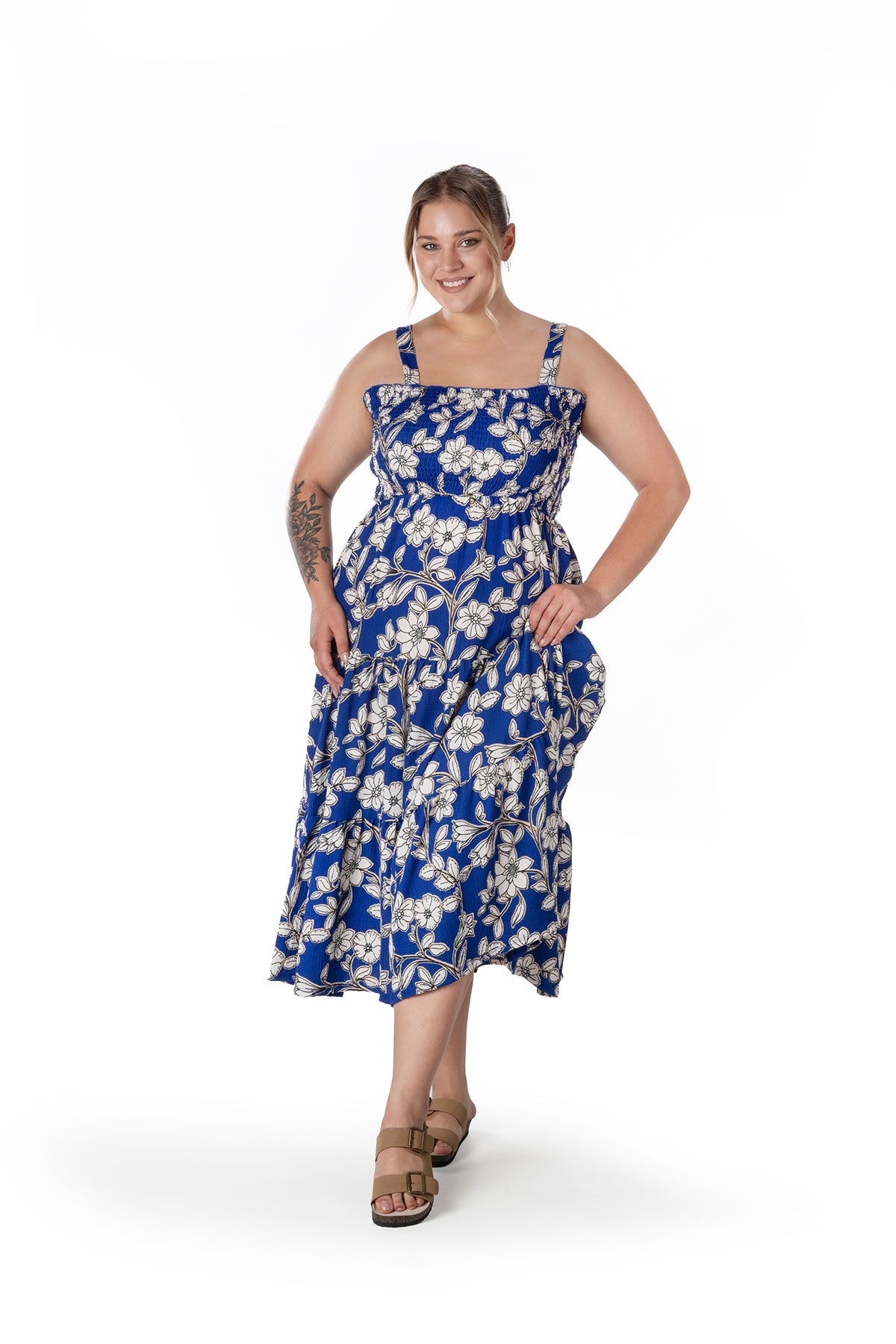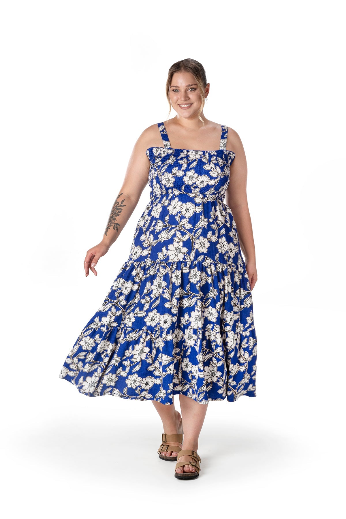 שמלה במידות גדולות גומי במותן עם כתפיות רחבות דוגמת פרחים T-80